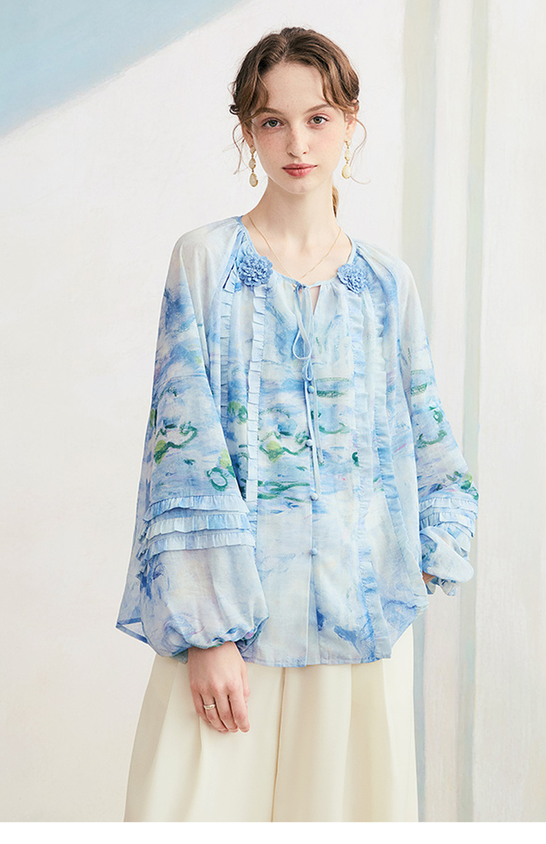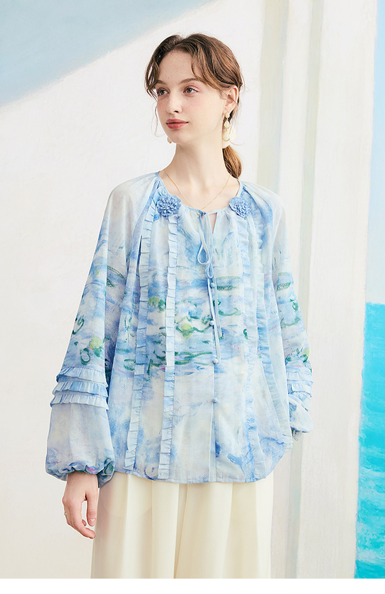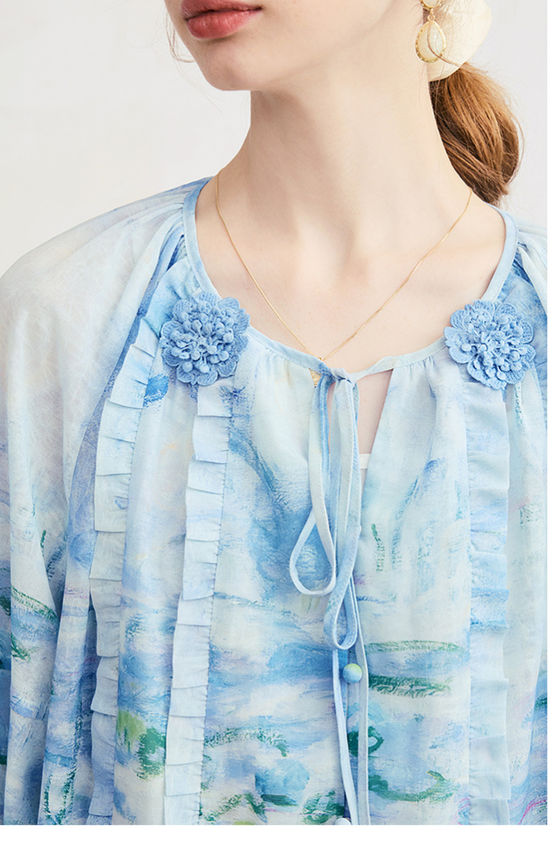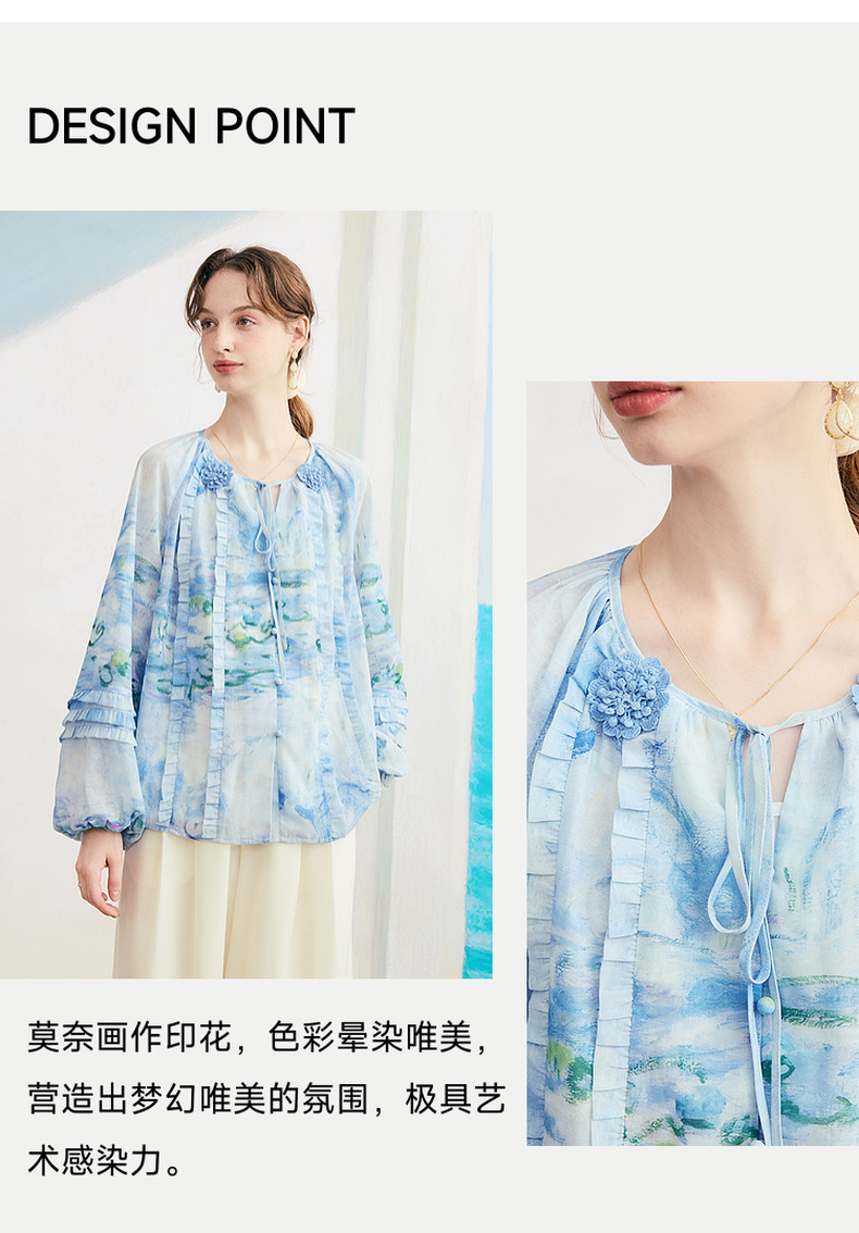 两三事雪吻回声2025夏季新款小清新印花立体花朵绑带雪纺衫女宽松