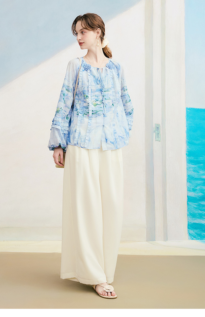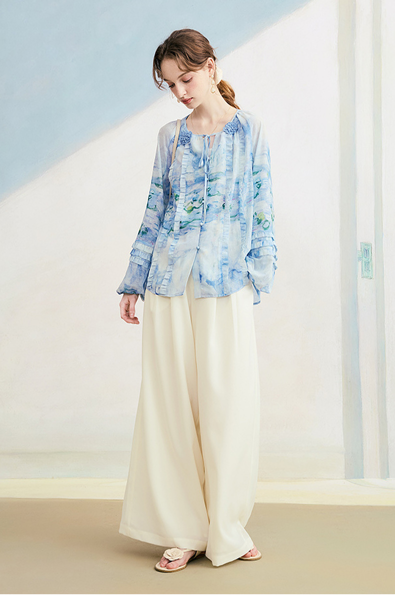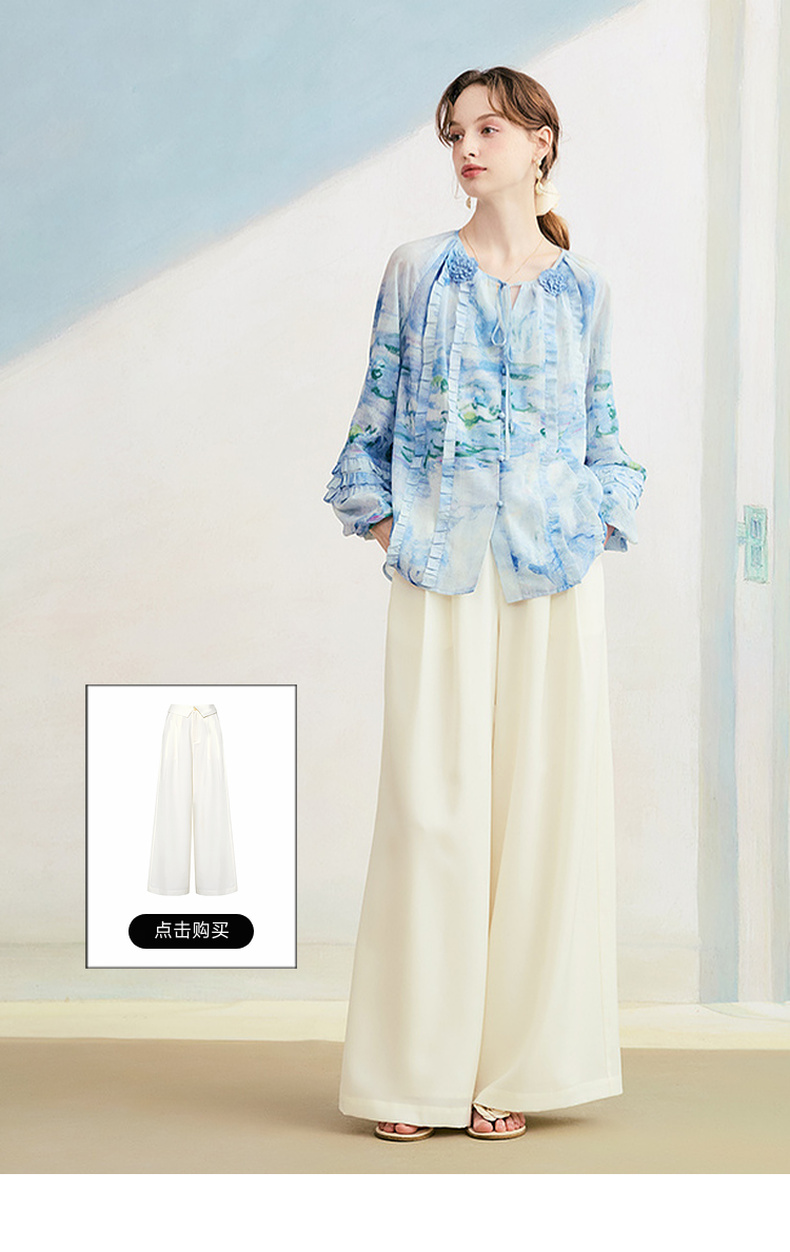 两三事雪吻回声2025夏季新款小清新印花立体花朵绑带雪纺衫女宽松