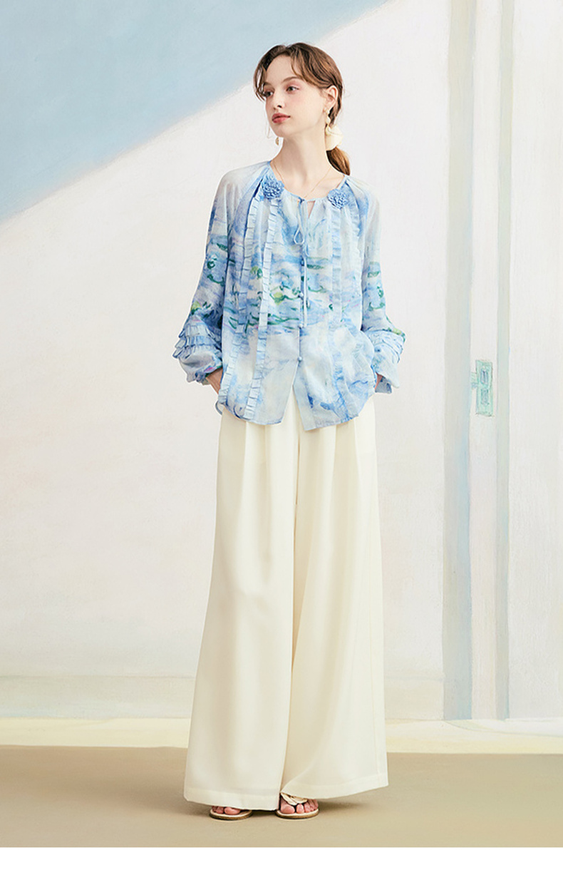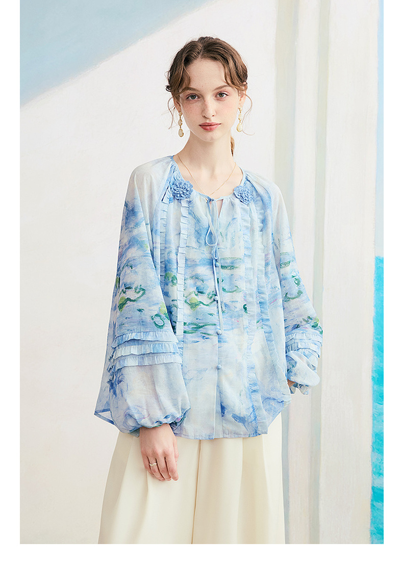 两三事 蜜夏神谕 2025春季新款文艺风蝴蝶结大翻领印花衬衫女宽松