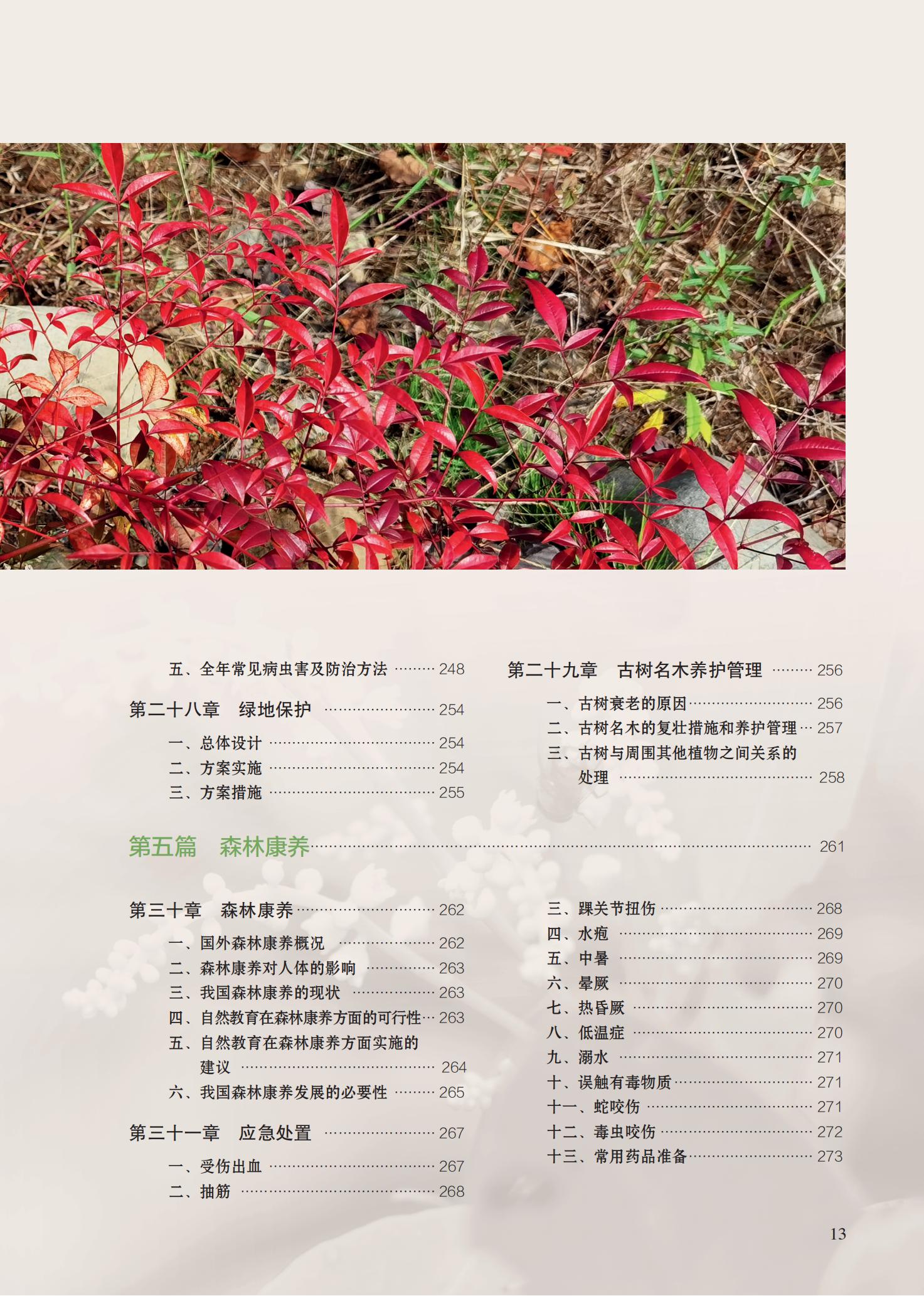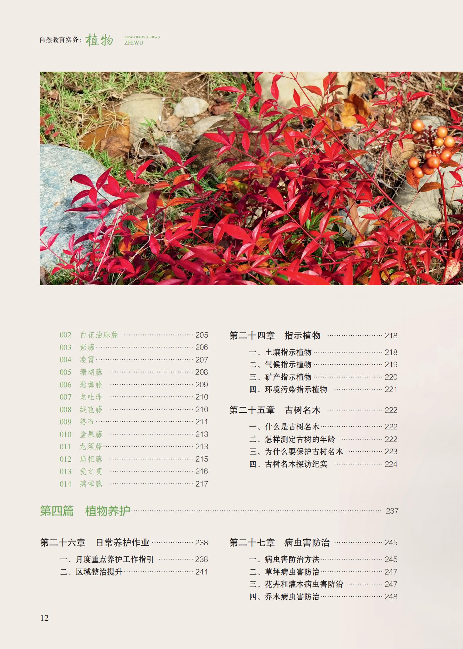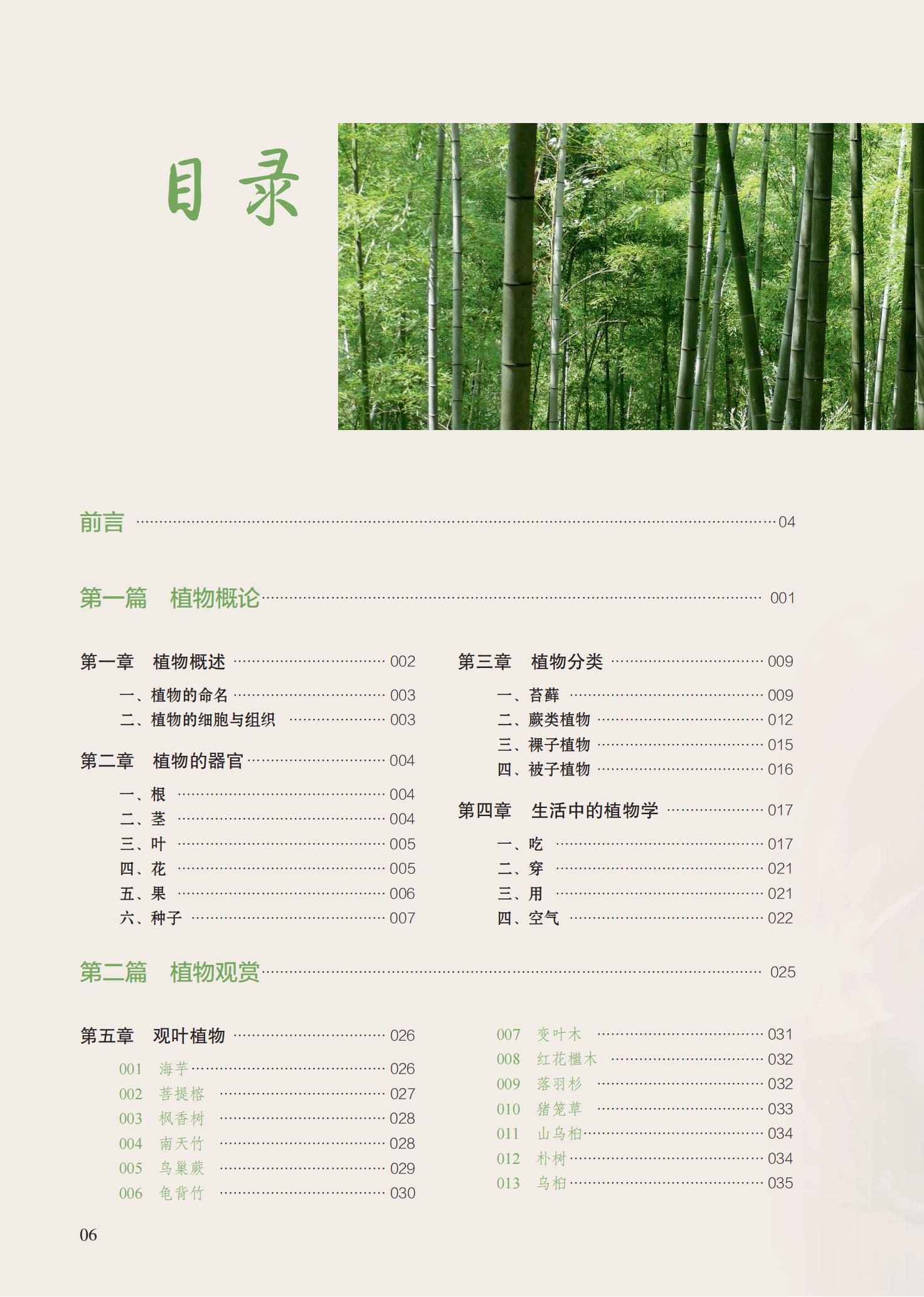 本书由植物概论、植物观赏、专题植物、植物养护、森林康养五篇 31章组成。从微小的苔藓到参天的大树,从绚烂的花朵到沉静的果实,从独特的形态到药用价值,从文化意义到艺术气息,从病虫害防治到绿地保护,从观赏到生活中的吃、穿、用,多角度多维度解析植物。并且针对社会老龄化发展趋势,增加了由保健专家编写的森林康养内容,从健康监测管理、药物准备及应急措施等方面,提供全方位的生命安全保障指导。