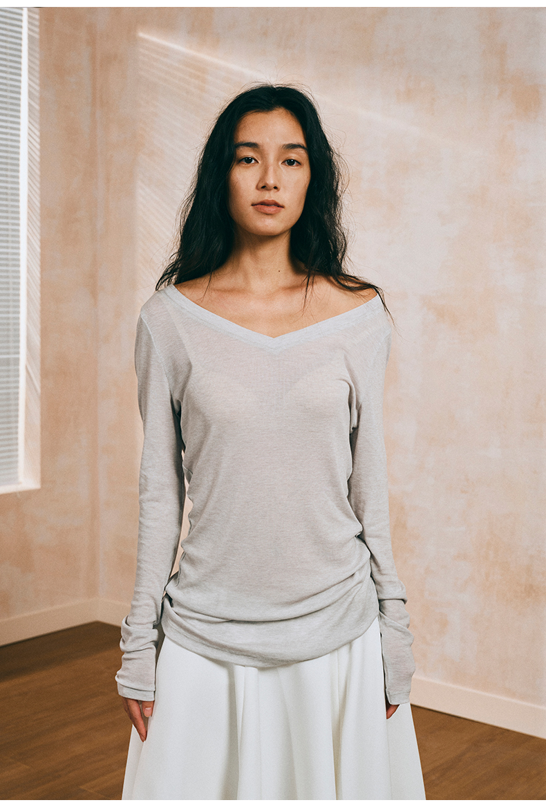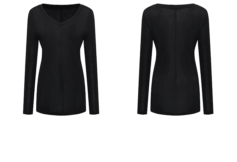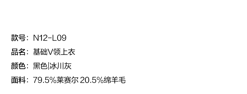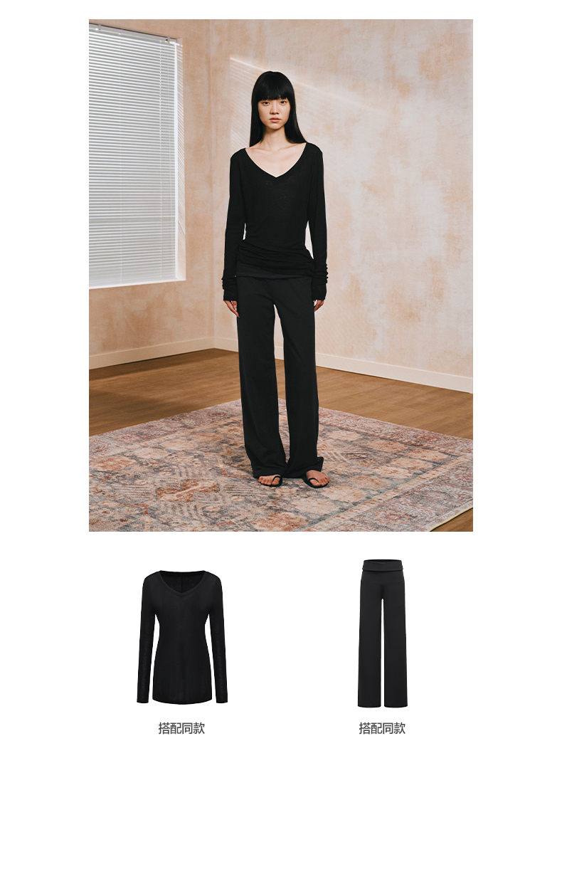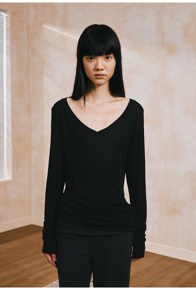 NUTH柔软亲肤透感打底衫V领针织长袖T恤 黑色/冰川灰