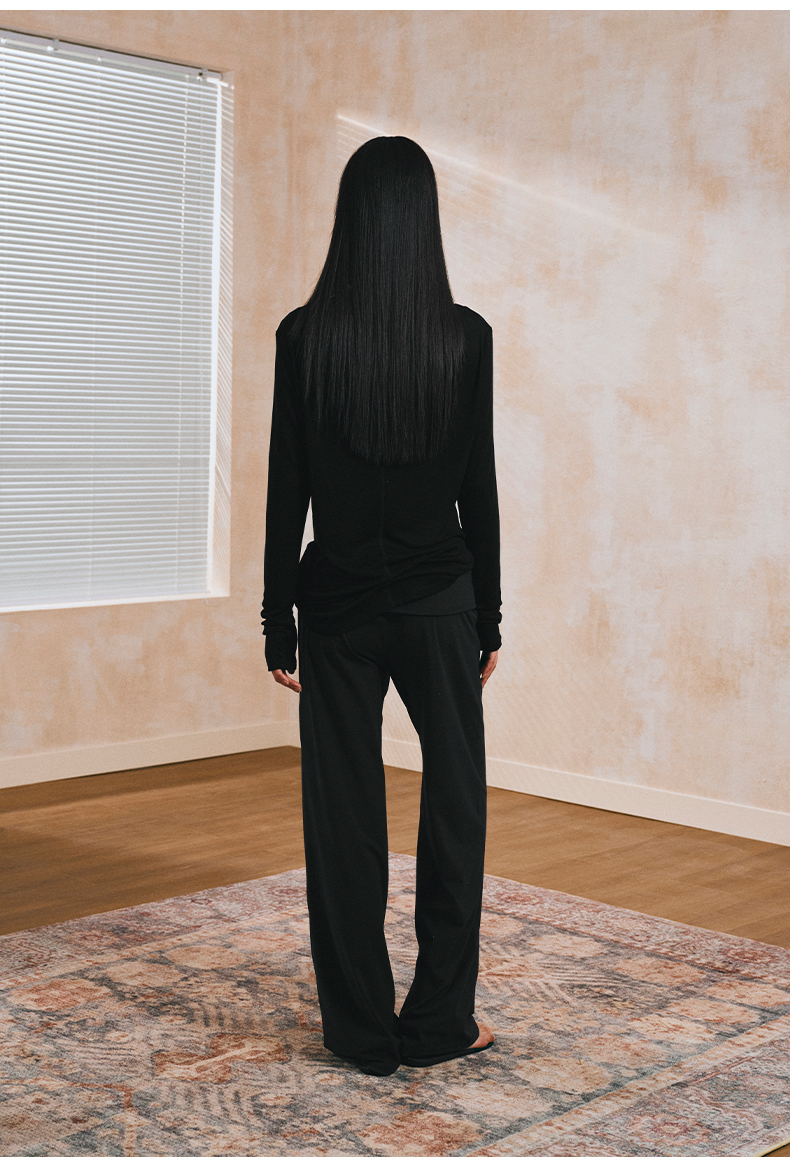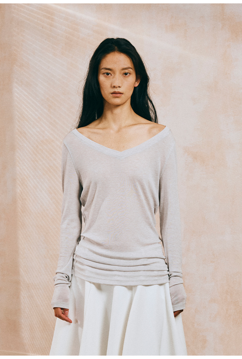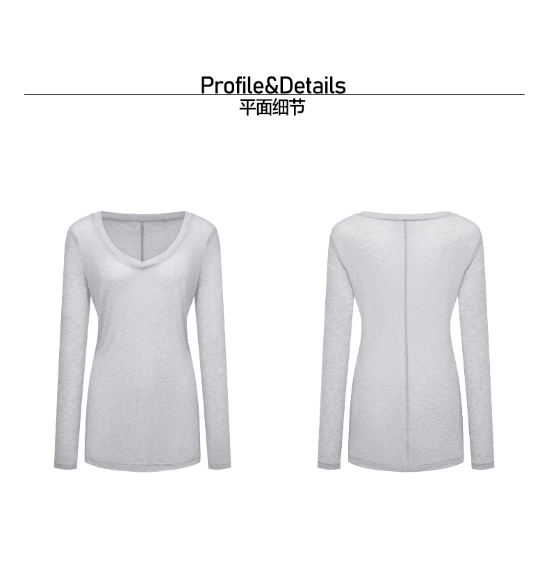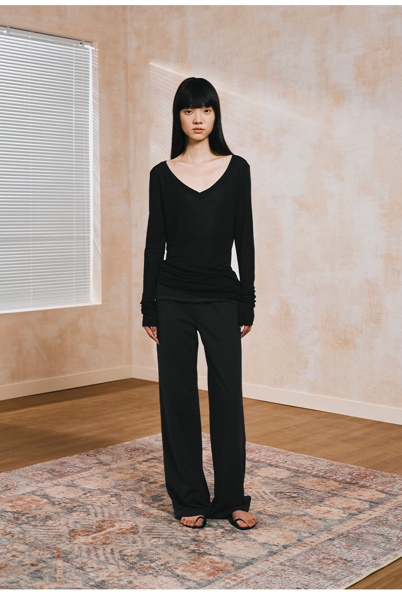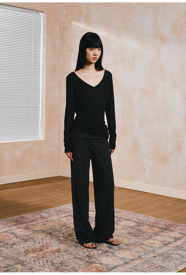 NUTH柔软亲肤透感打底衫V领针织长袖T恤 黑色/冰川灰