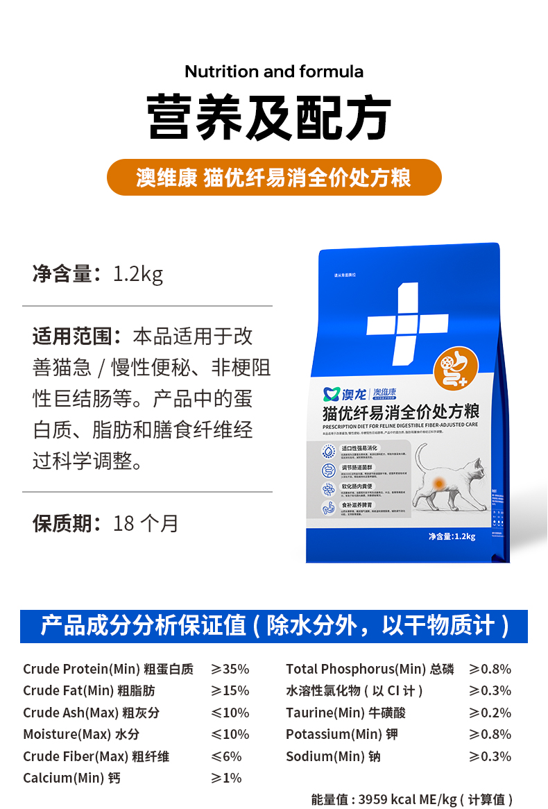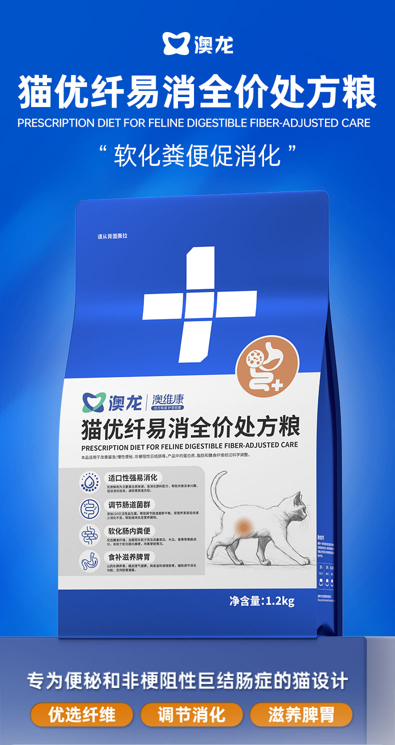 澳龙澳维康猫优纤易消全价处方粮 1.2k赠50g试吃
