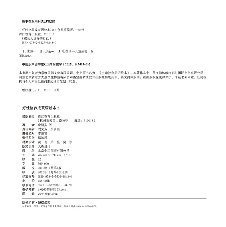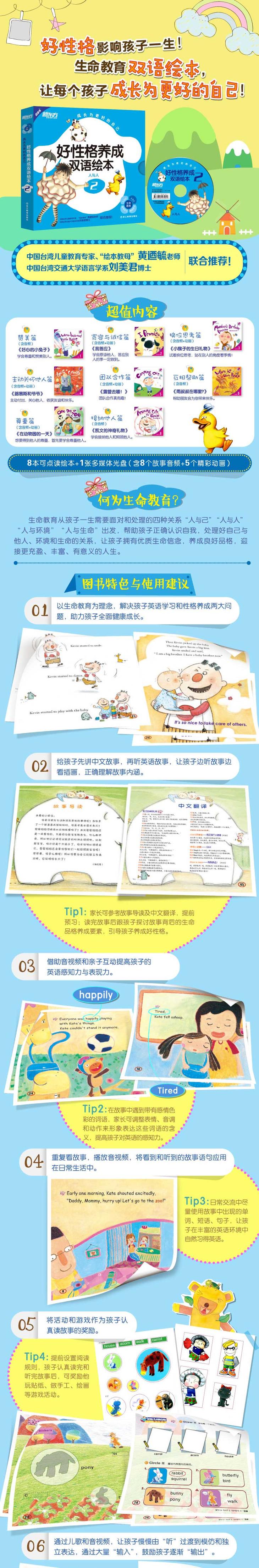 本系列绘本共分为三个套装,其中《成长为更好的自己:好性格养成双语绘本2》共8册,包含了“赞美篇”“宽容与诚信篇”“换位思考篇”“主动关怀他人篇”“团队合作篇”“互相帮助篇”“尊重篇”“接纳他人篇”8个主题,通过围绕着这些主题的8个妙趣横生的故事,探讨了人与人的关系,教孩子接纳他人,体谅他人,学会与他人分工合作,履行对他人的承诺,拥有尊重他人、关怀他人、团队合作、诚实守信等好品格。