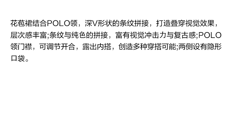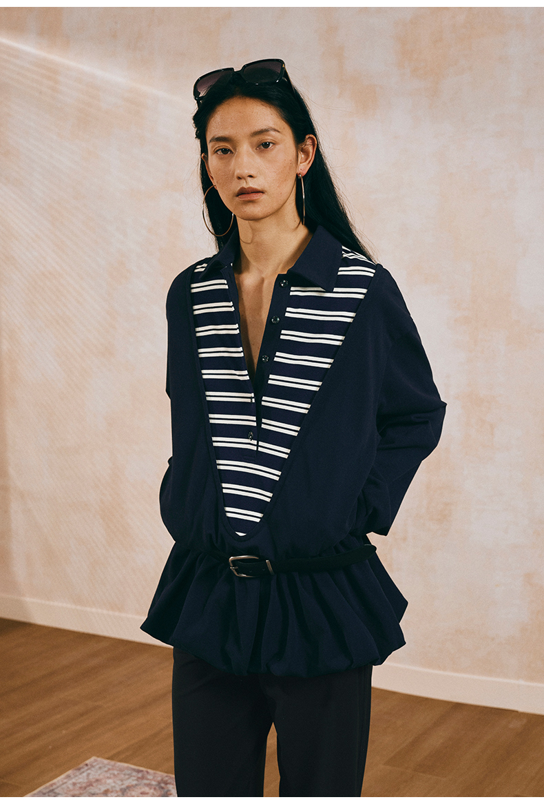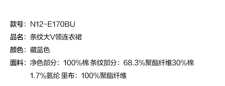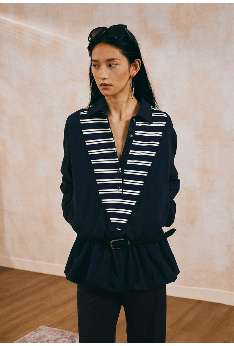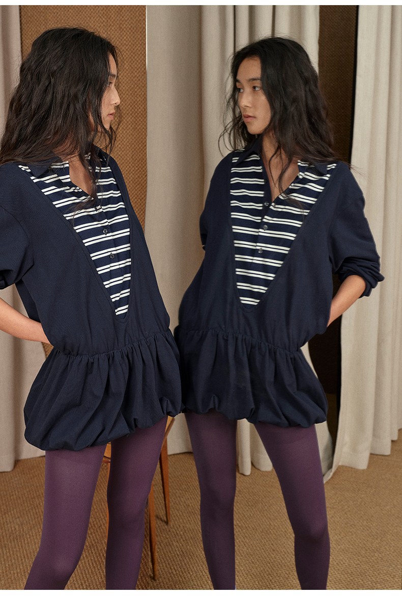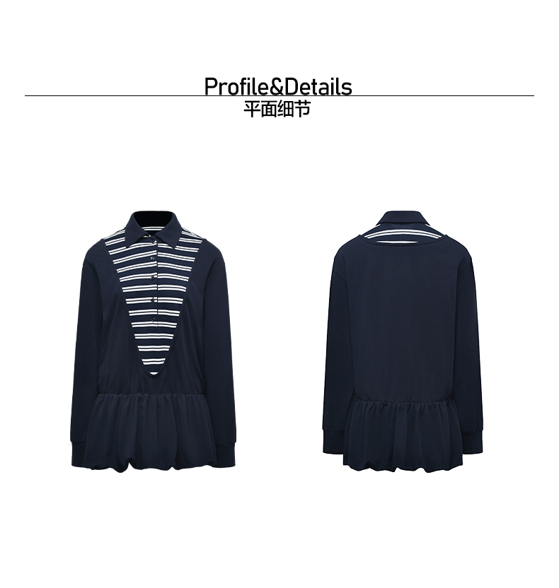 NUTH V领条纹拼接假两件长袖花苞连衣裙女 藏蓝色