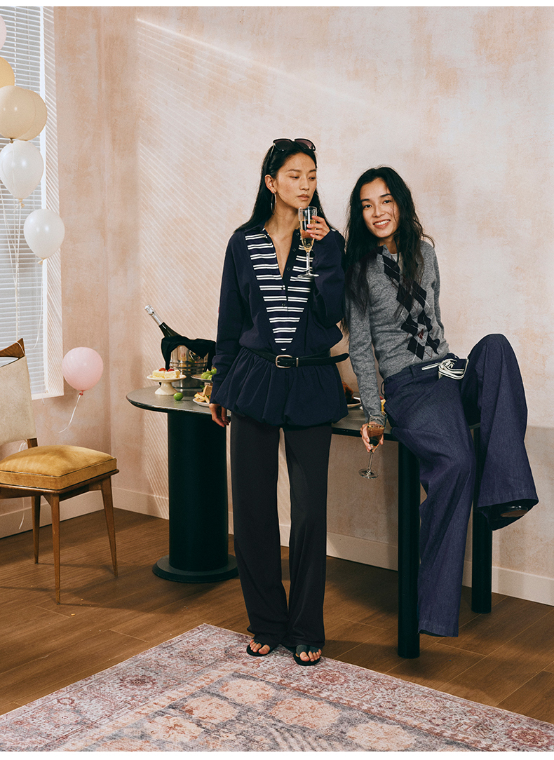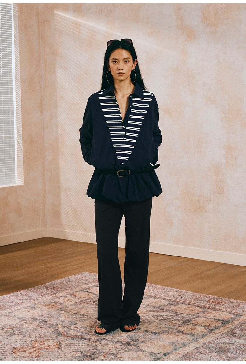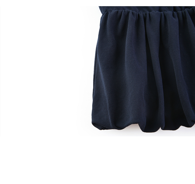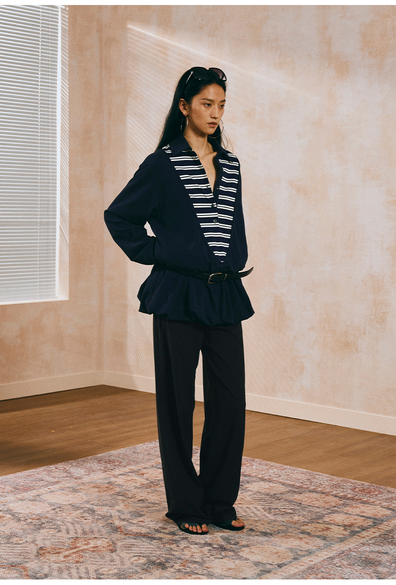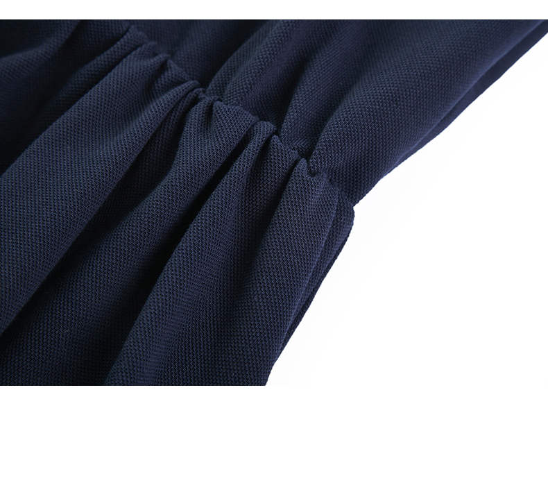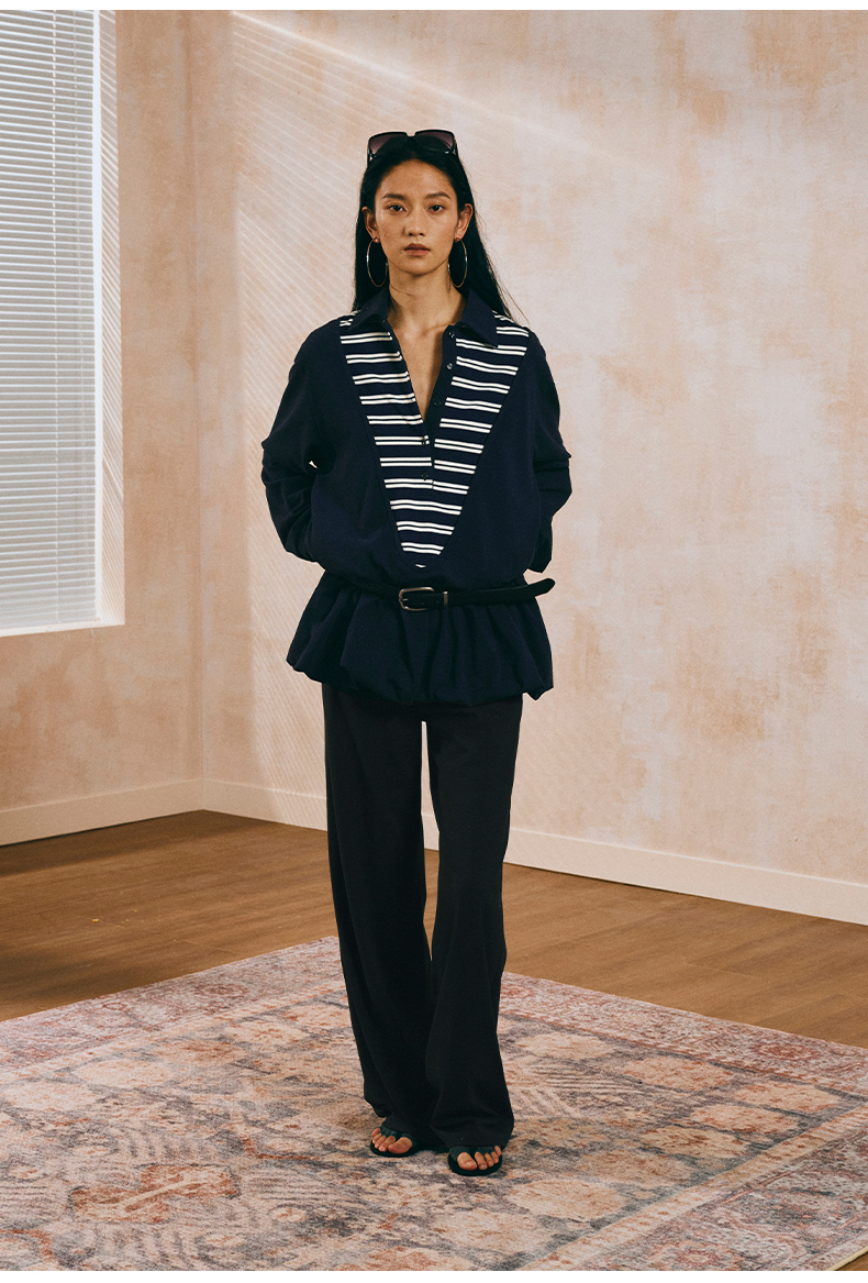 NUTH V领条纹拼接假两件长袖花苞连衣裙女 藏蓝色