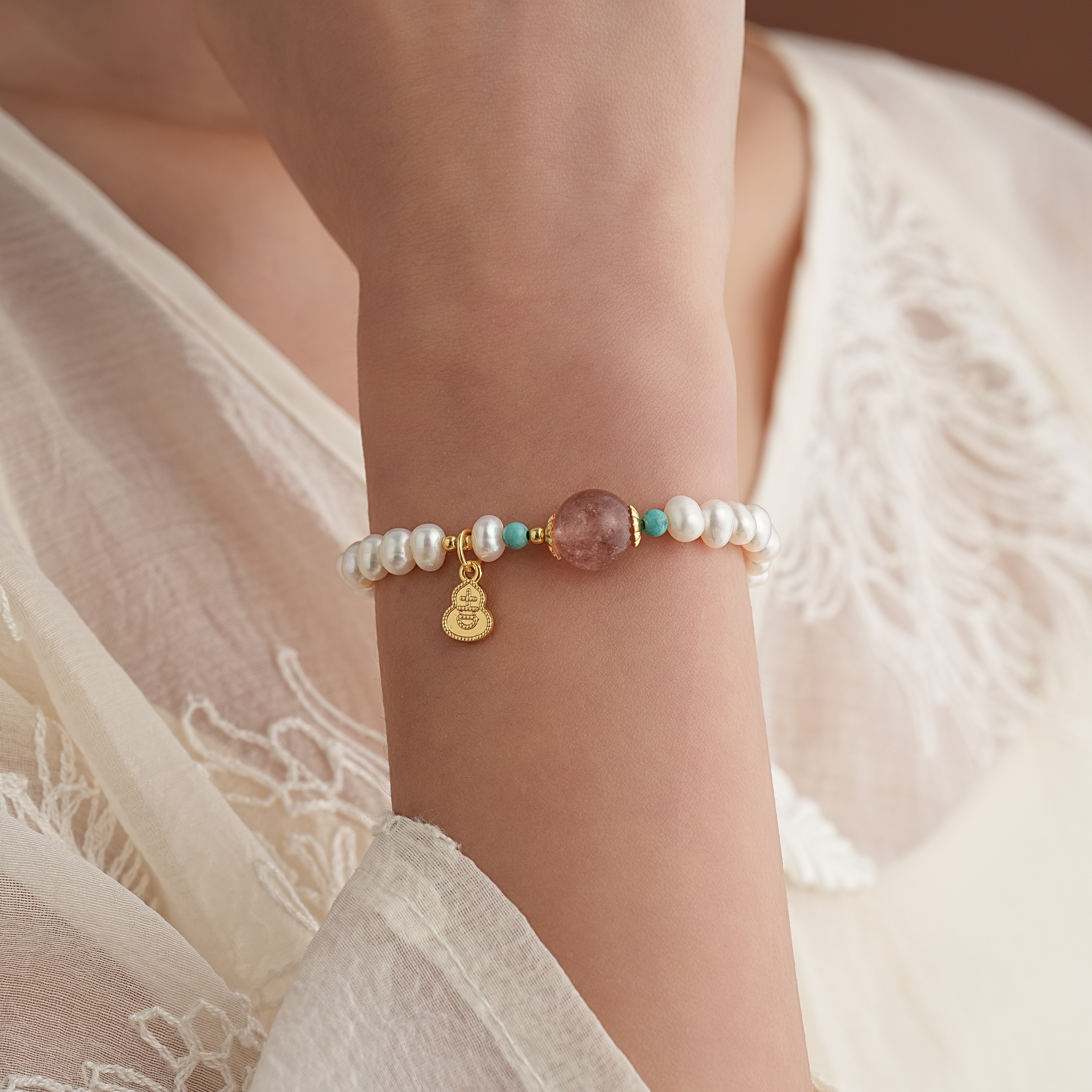 【材质】草莓晶、天然绿松、淡水珍珠、铜镀金隔珠、铜镀金花托、铜镀金吉字葫芦提溜