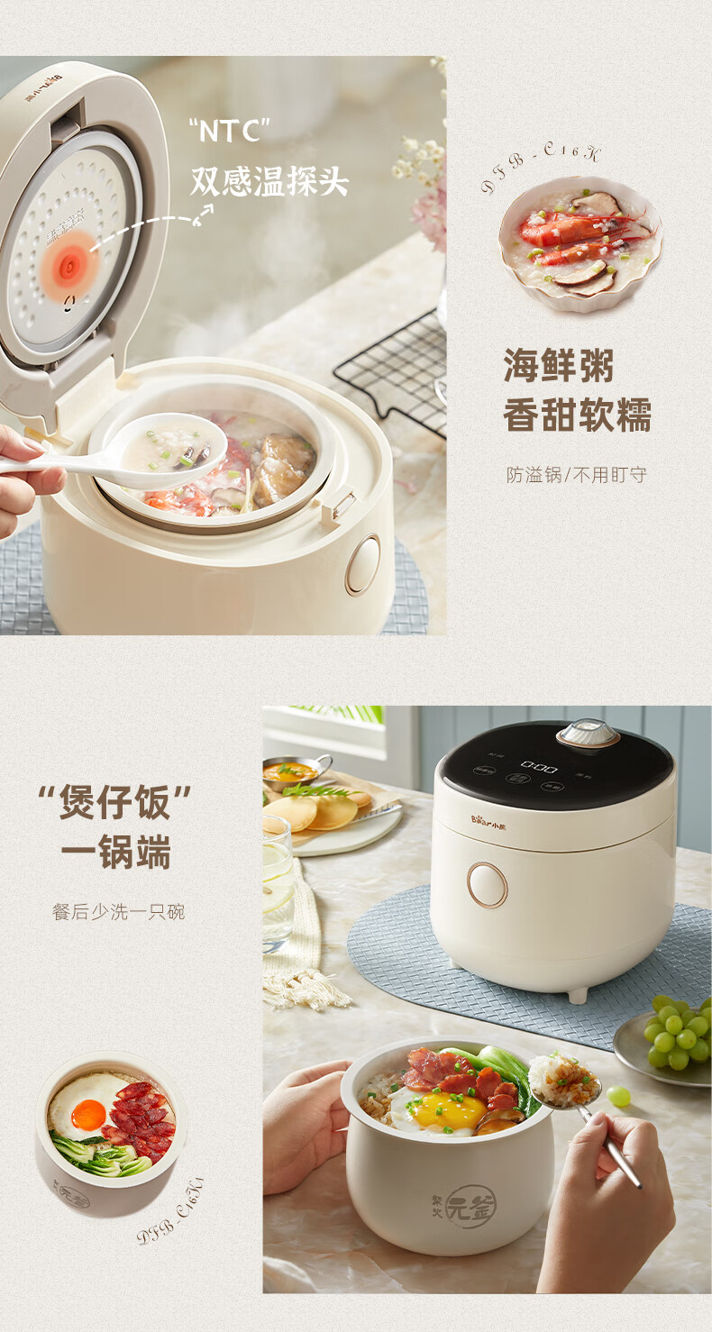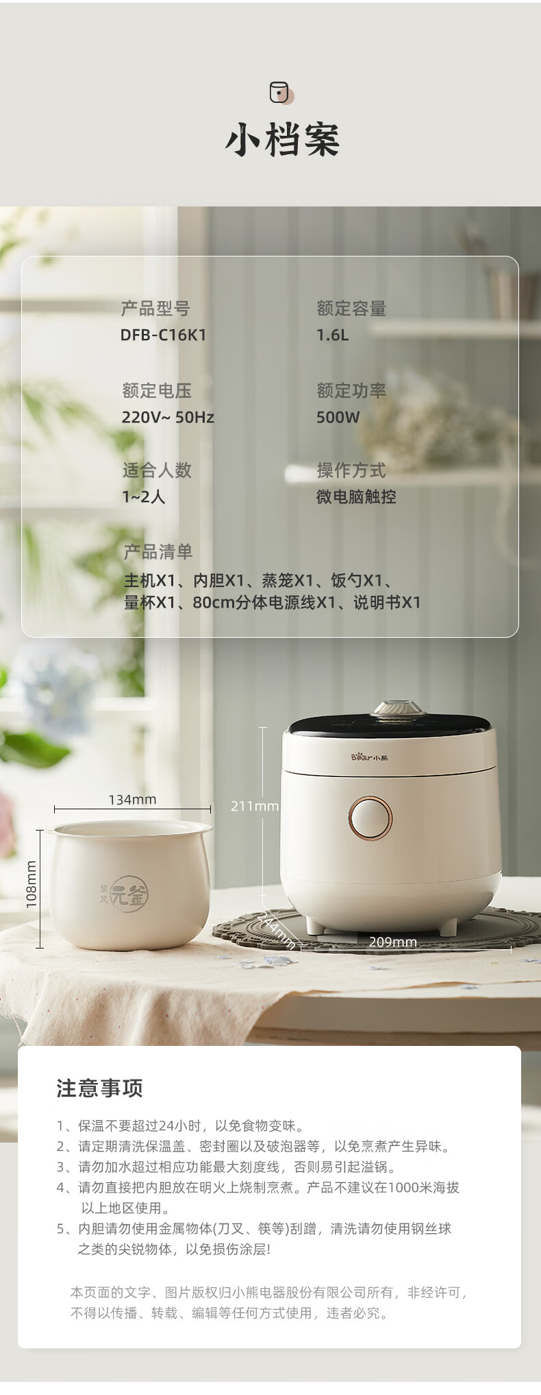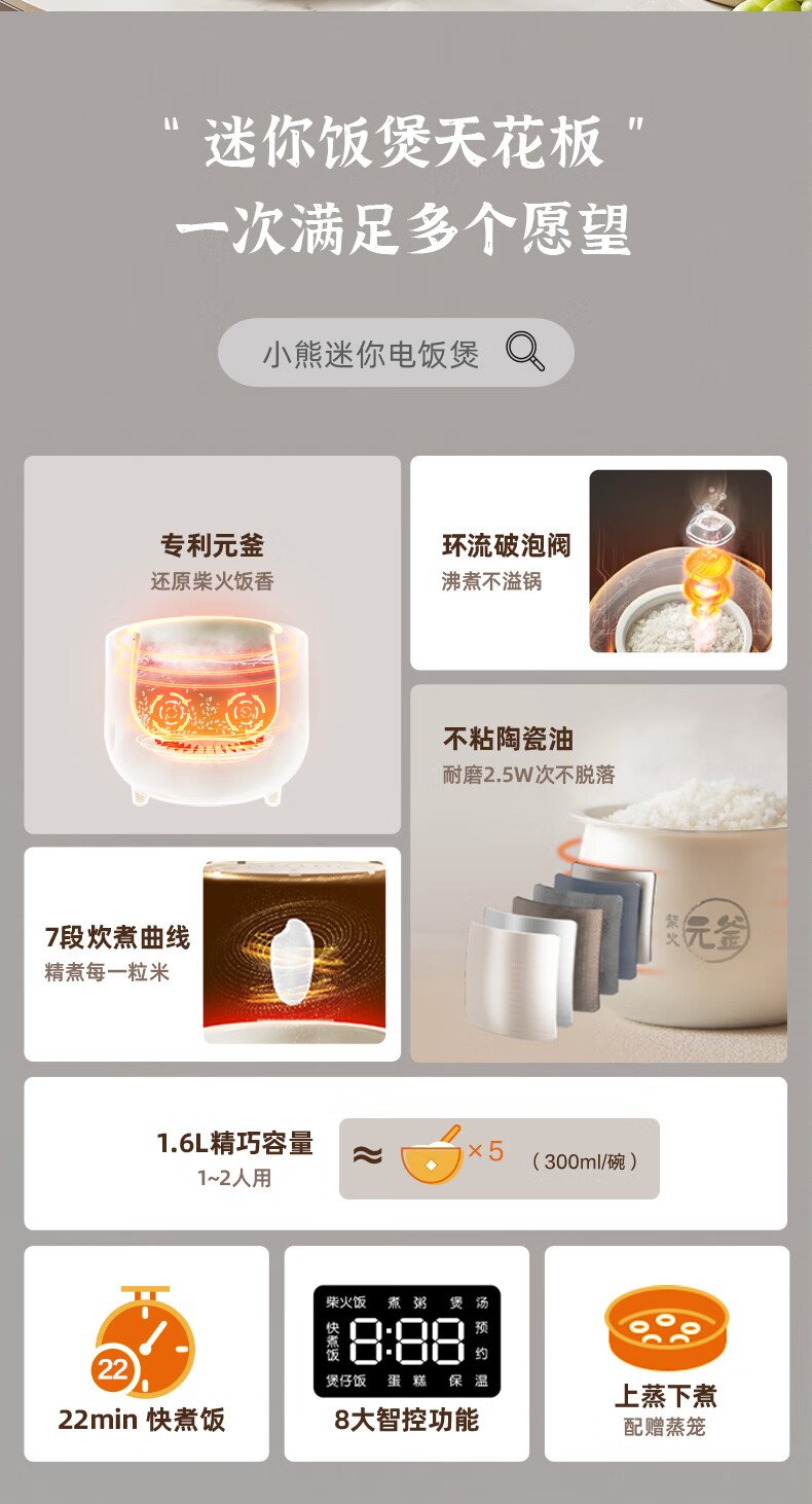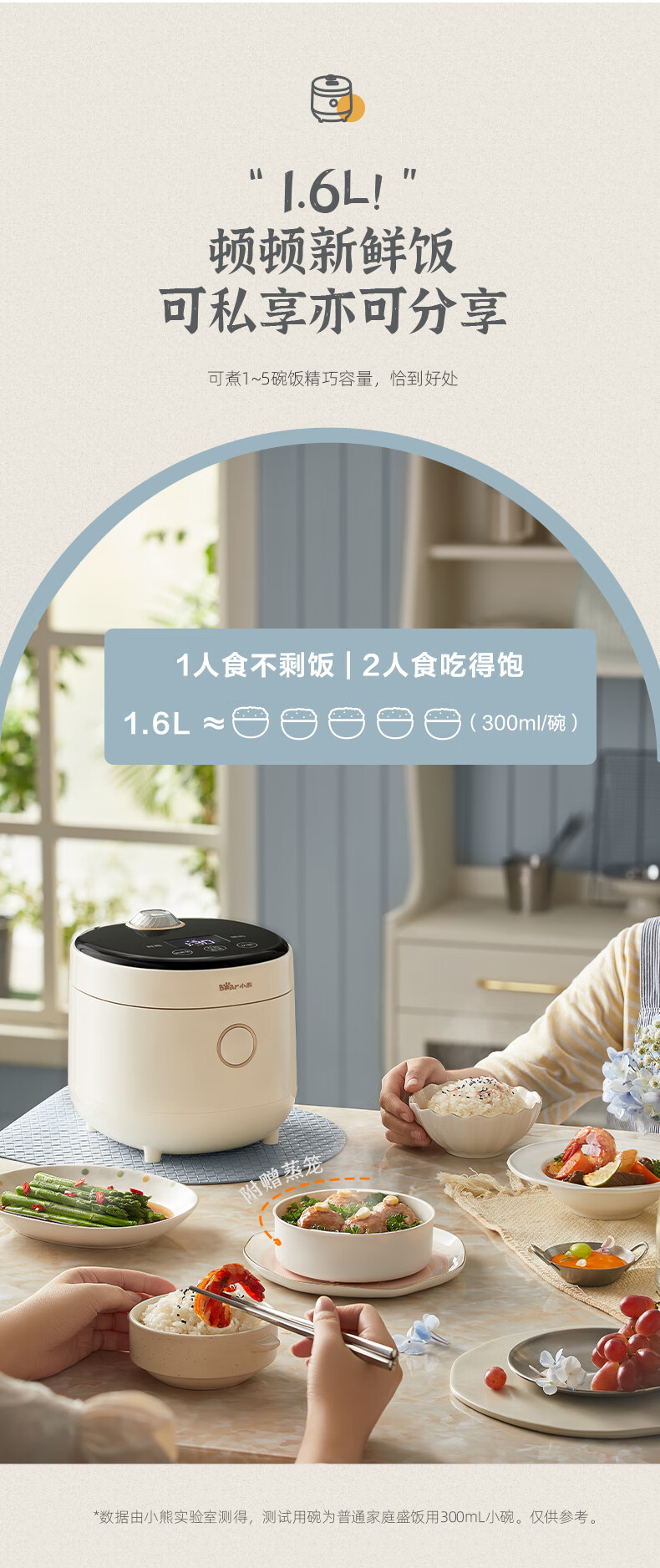 积分免费兑:小熊(Bear)电饭煲 电饭锅迷你家用小容量一键快煮饭多功能预约定时配蒸笼1.6L蒸饭器小型小2人 DFB-C16K1