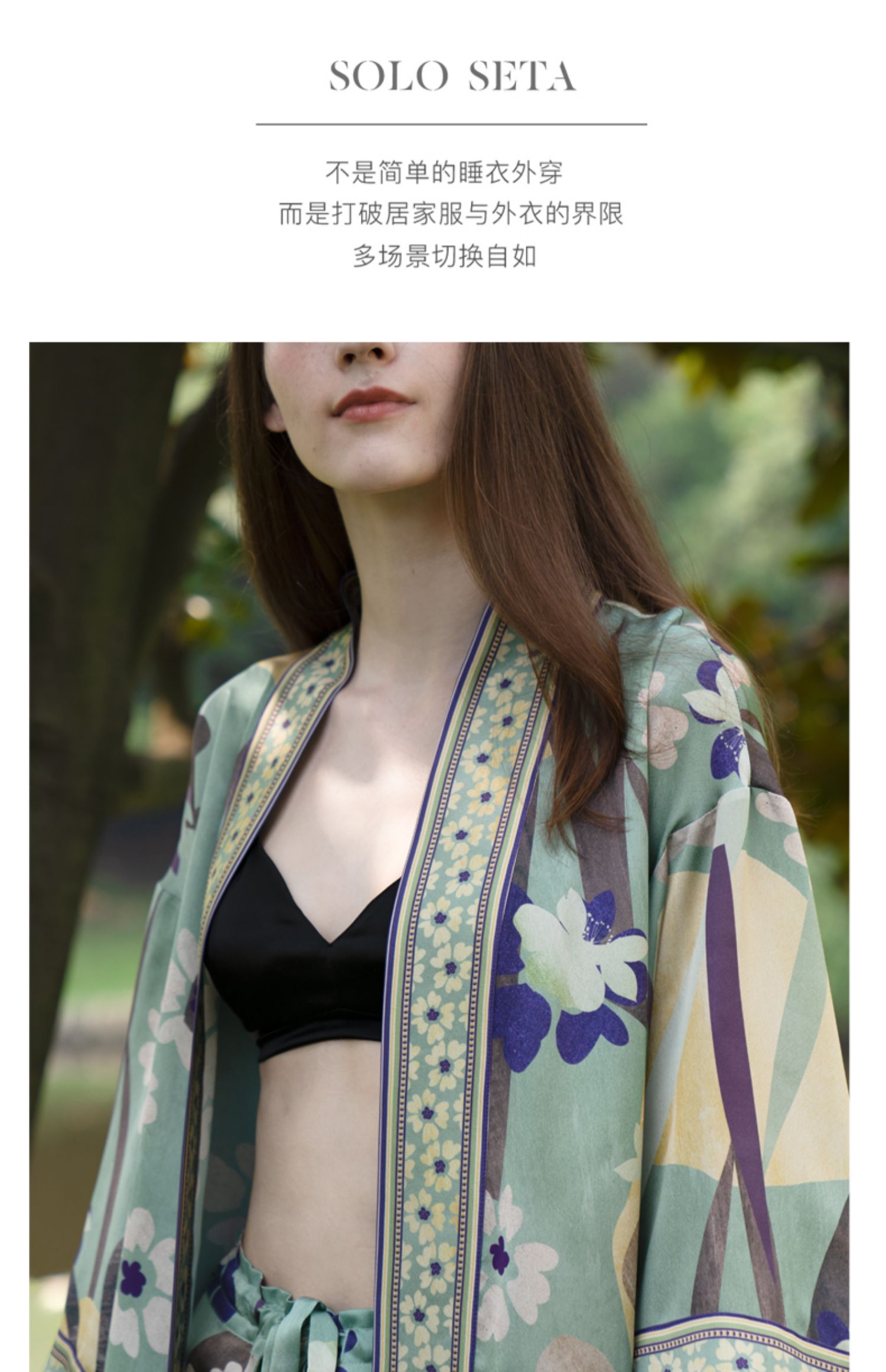 - soloseta专注于真丝织物,灵感源自意大利语,中文含义为“只做真丝”的意思。让睡衣变时尚,居家和外出瞬间切换,使其更具有出街,度假,参加宴会等功能。