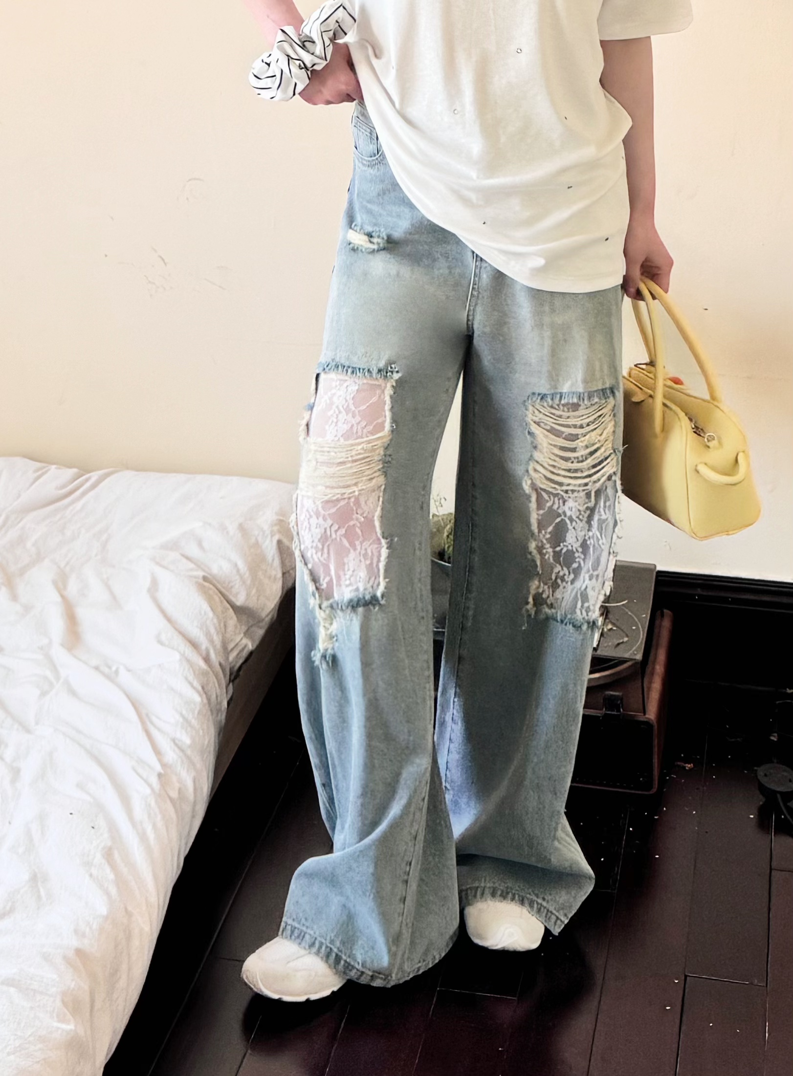 2025新品 蕾蕾同款【甜酷预警】蕾丝拼接破洞宽松高腰直筒牛仔裤百搭时尚