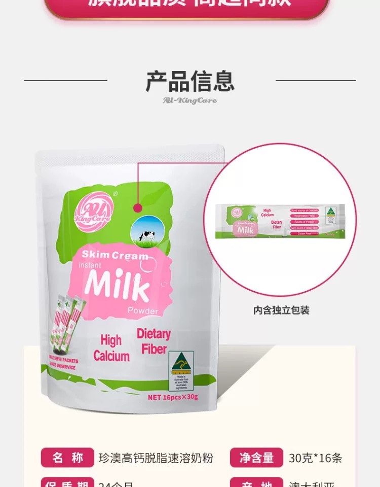 珍澳澳洲进口高钙脱脂速溶奶粉便携独立小条装成人青少年480g