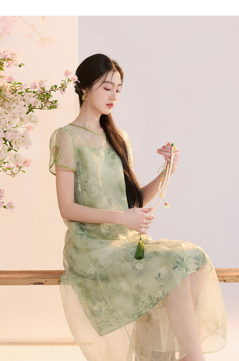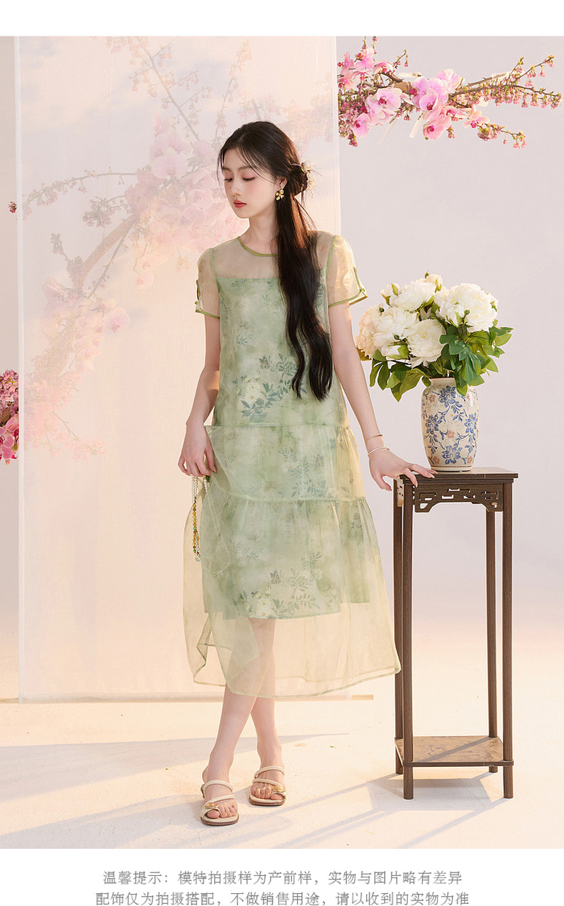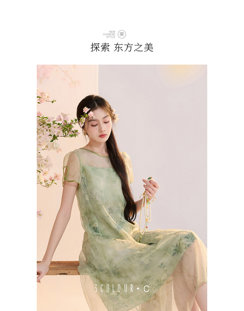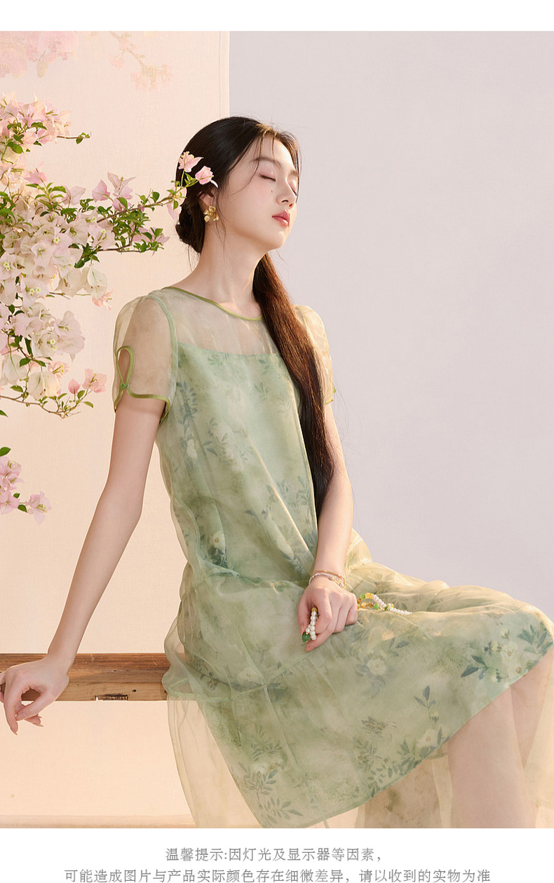 【柳色含烟】三彩2026夏季新款假两件连衣裙新中式A字裙C