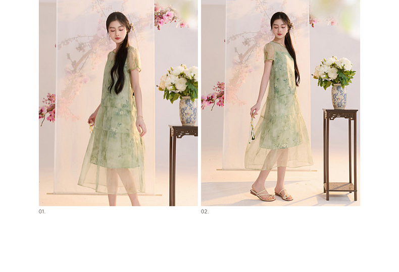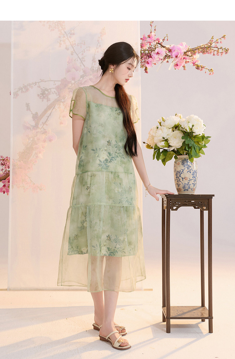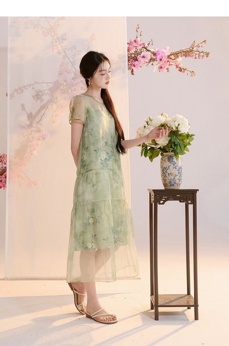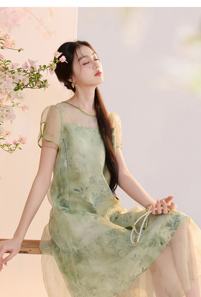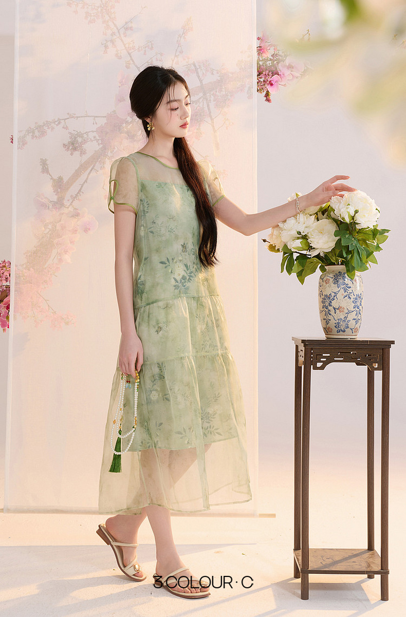 【柳色含烟】三彩2026夏季新款假两件连衣裙新中式A字裙C
