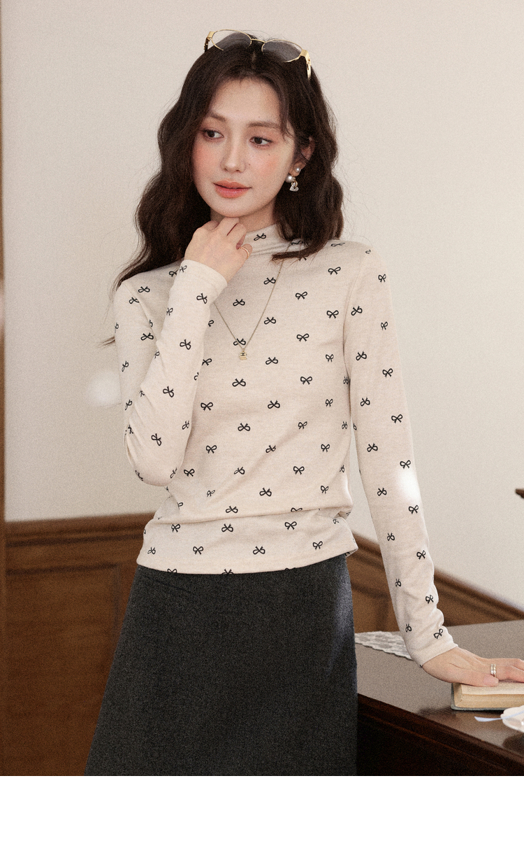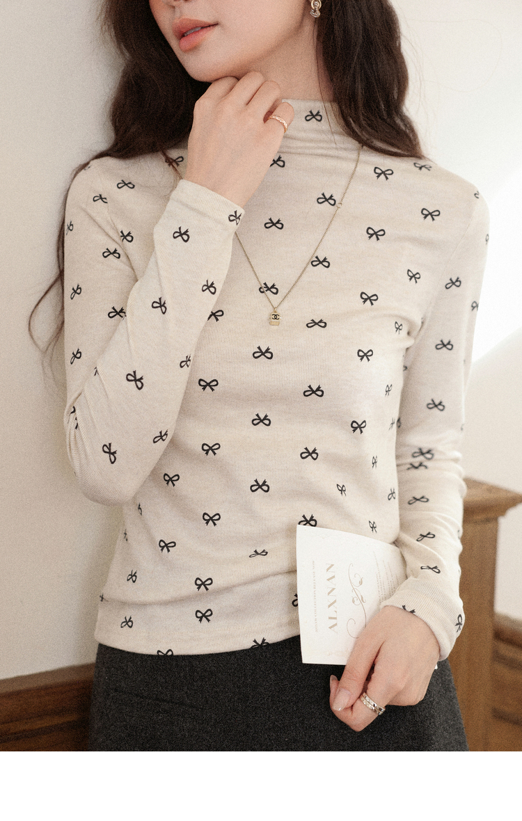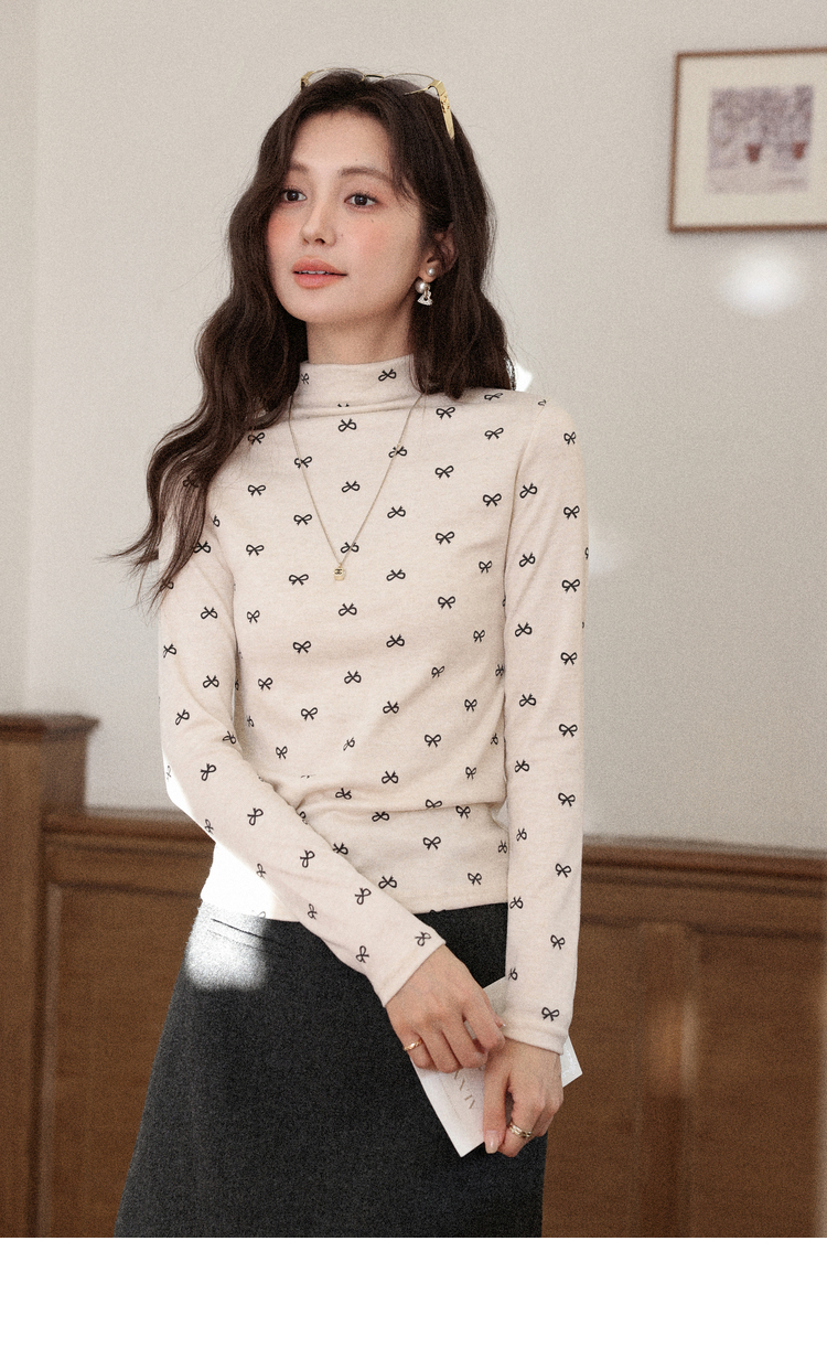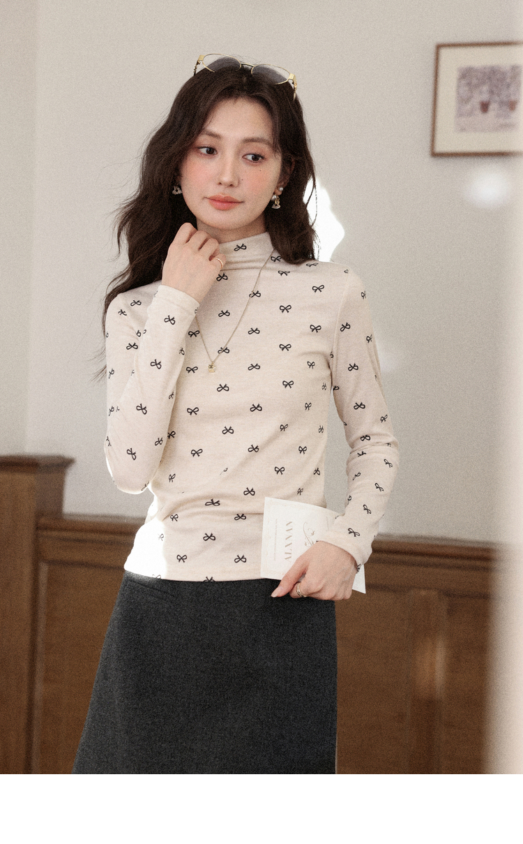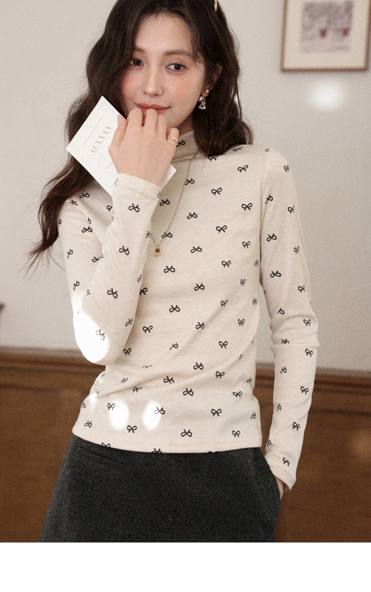 鹿向南「月白香颂」燕麦色蝴蝶结碎花显瘦长袖上衣女秋半高领内搭