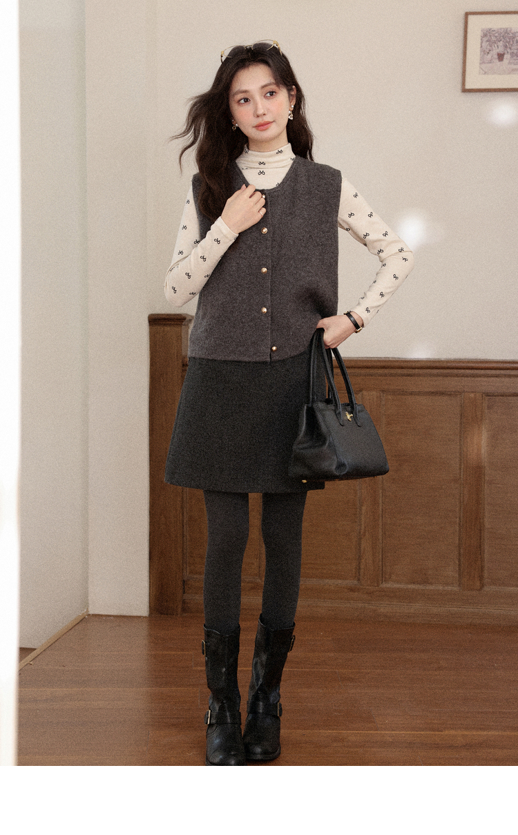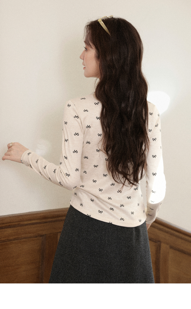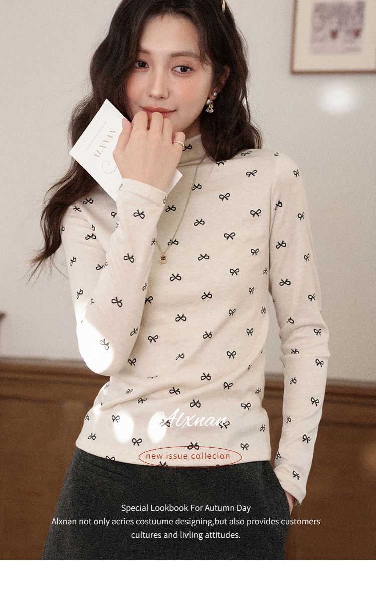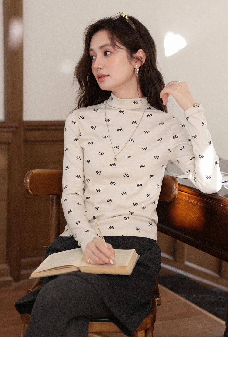 鹿向南「月白香颂」燕麦色蝴蝶结碎花显瘦长袖上衣女秋半高领内搭