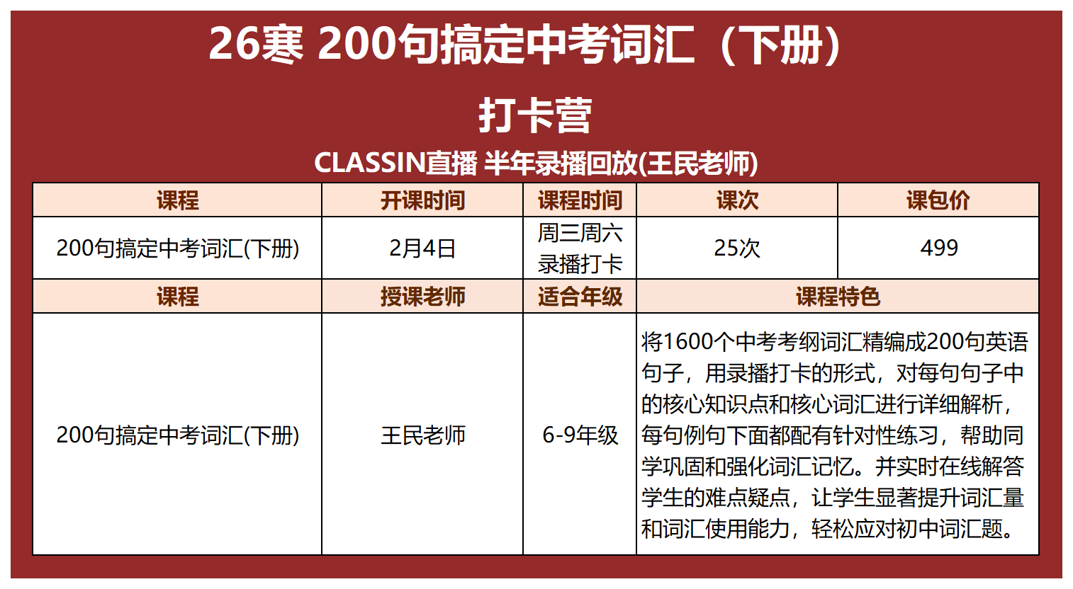 🍁整个课程一共分两期(上册+下册),一期25次课,1600个中考词汇全覆盖。