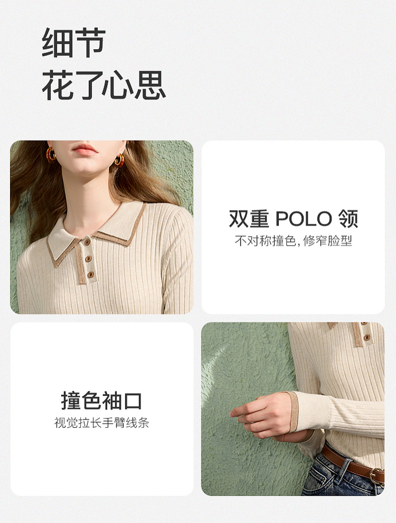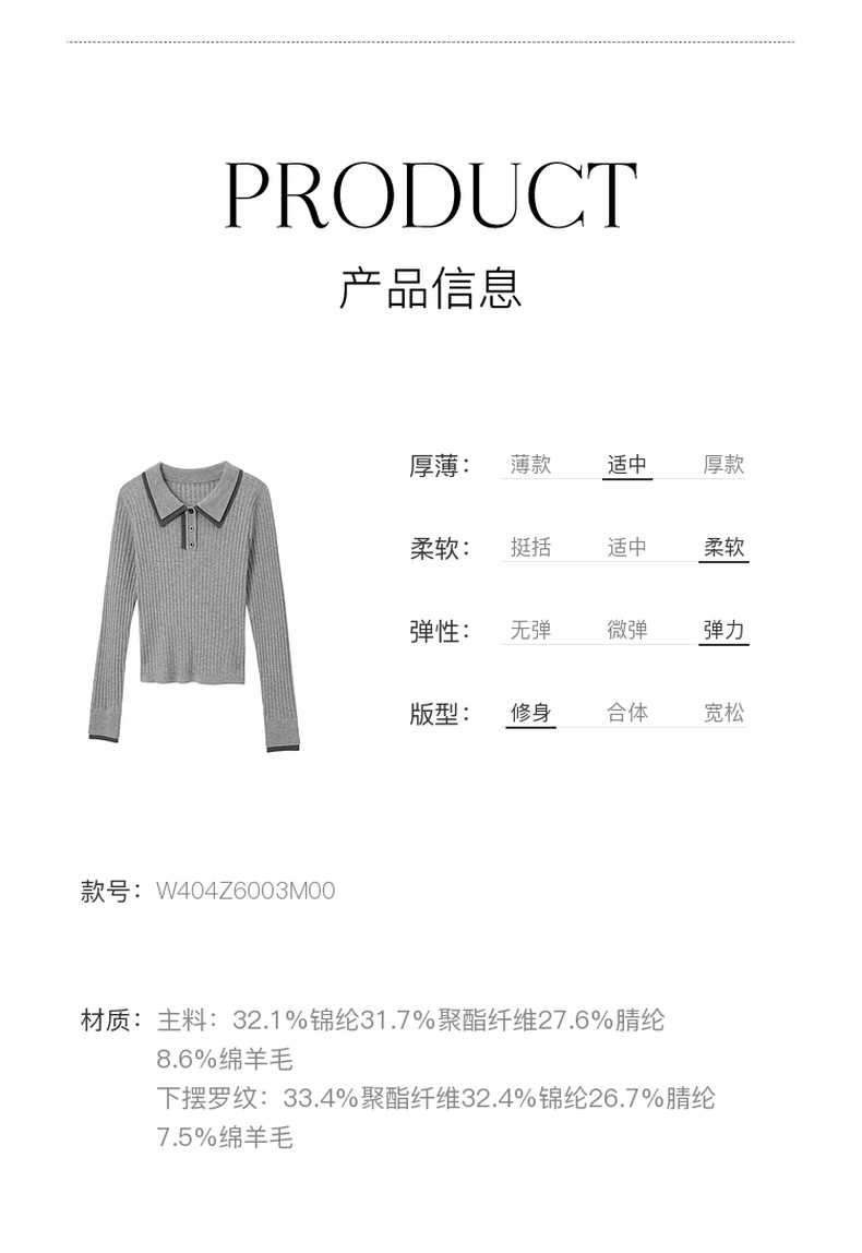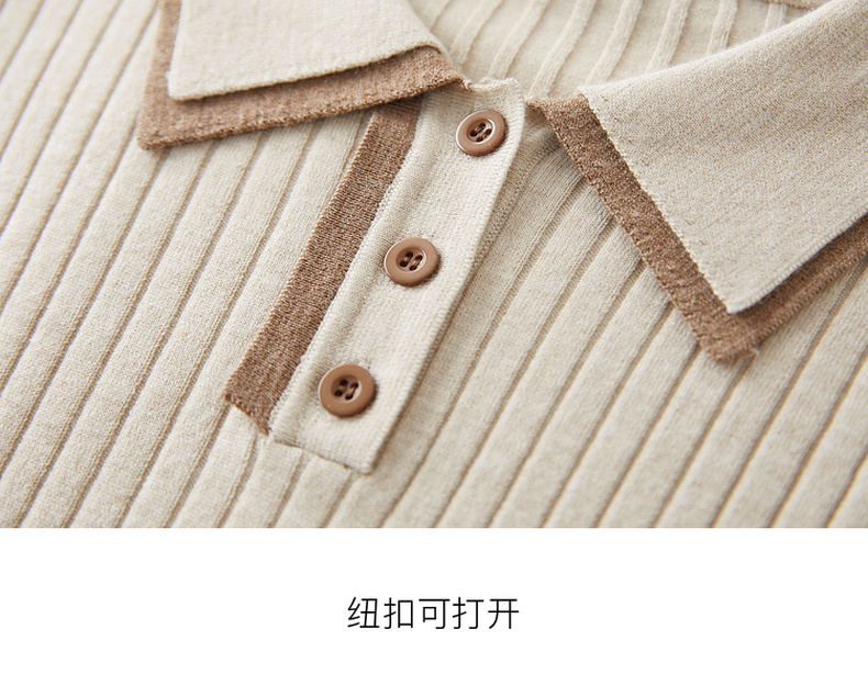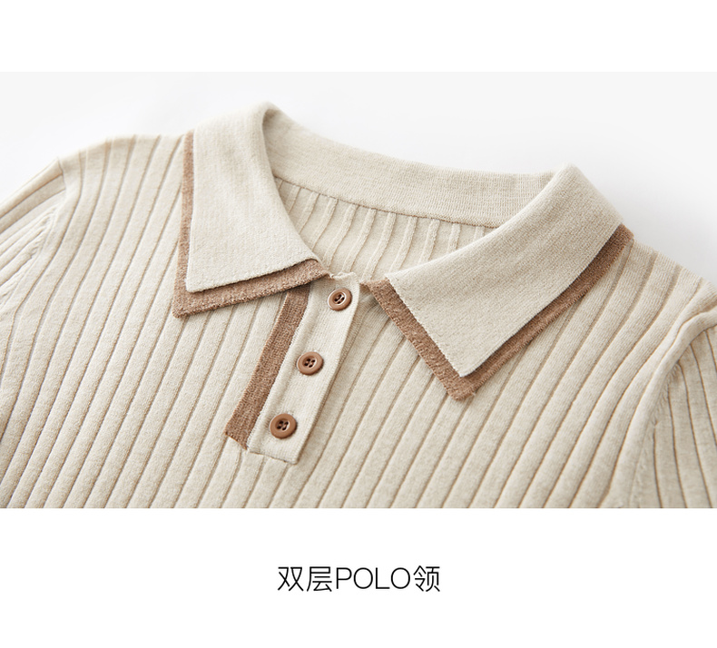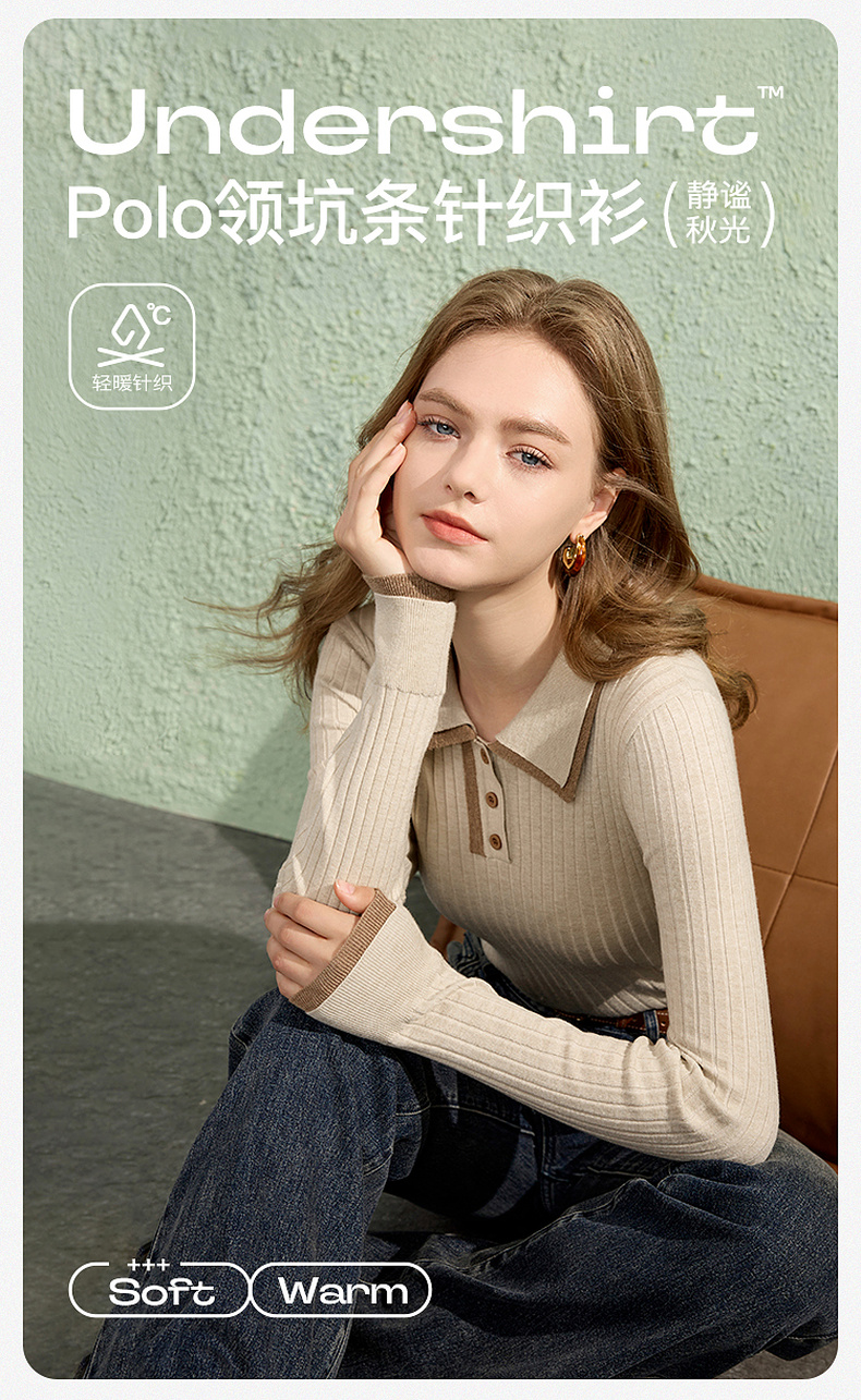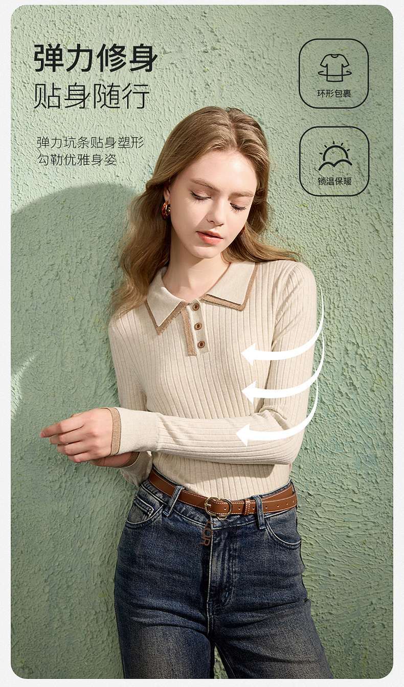 三彩2025冬季新款坑条针织衫POLO领毛衫修身显瘦内搭简约女