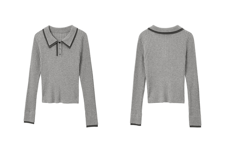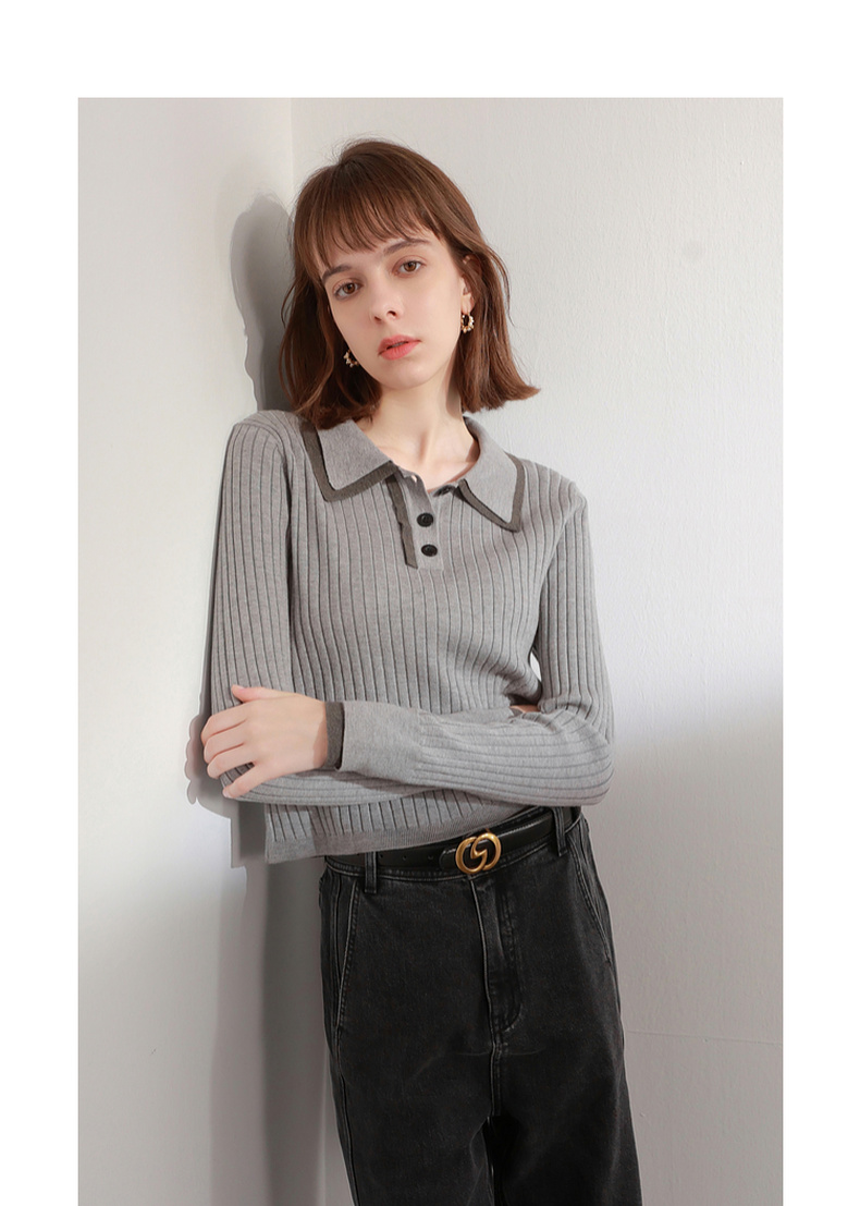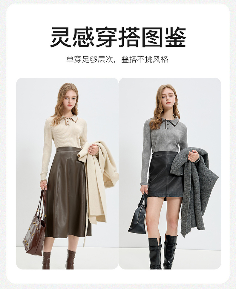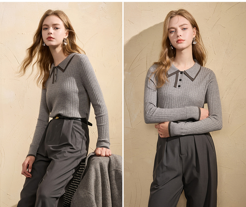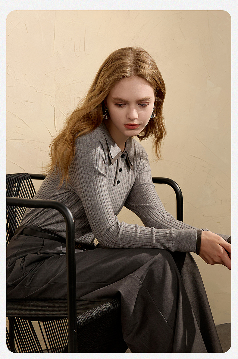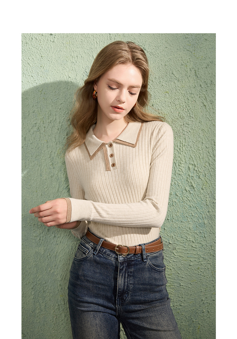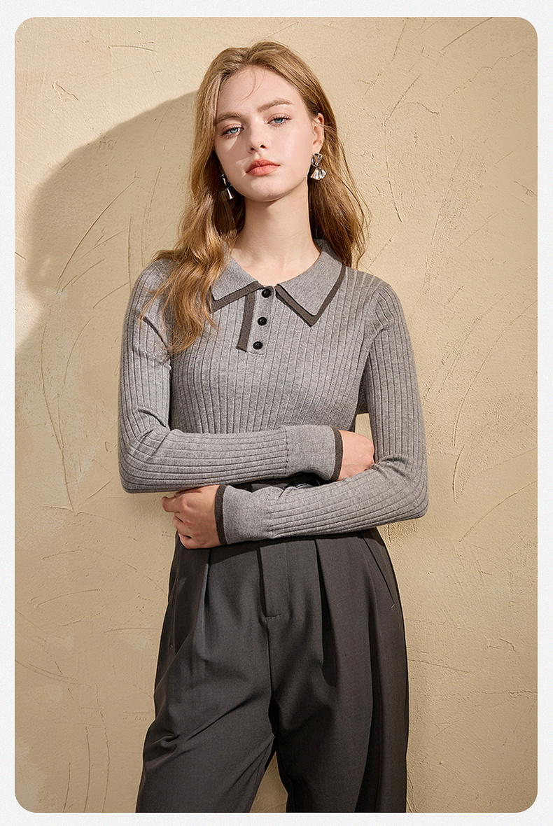三彩2025冬季新款坑条针织衫POLO领毛衫修身显瘦内搭简约女
