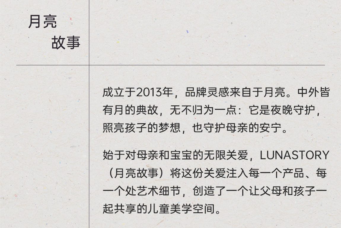 Lunastory是2017年全新推出的母婴用品高端品牌,致力于维护孩子的安全与健康。以父母之心,开发多种母婴用品,目标是让客户只用Lunastory就能打造出温馨的儿童房。
