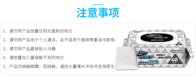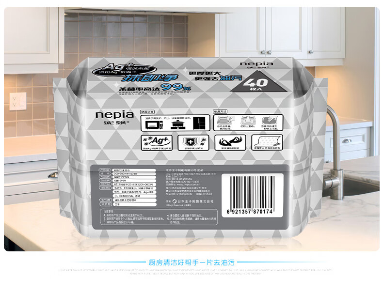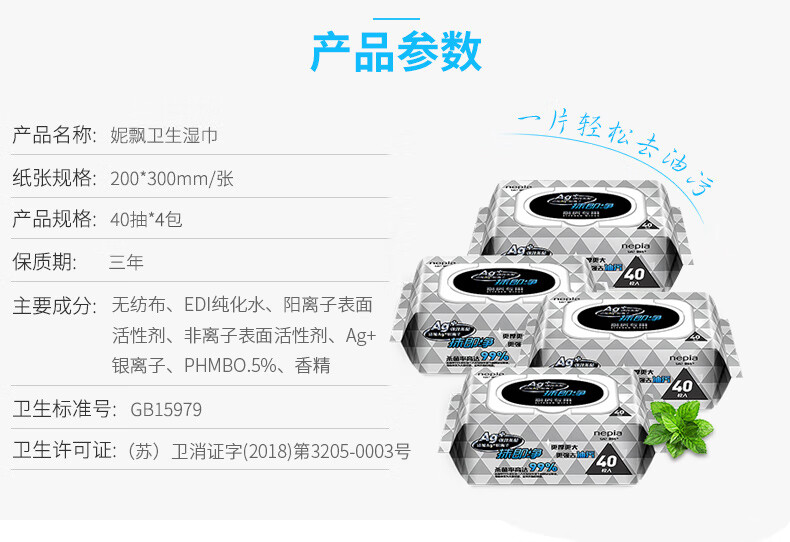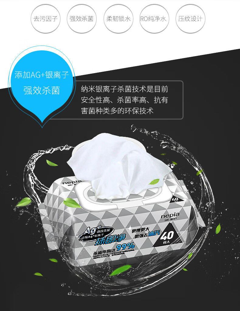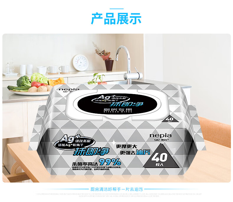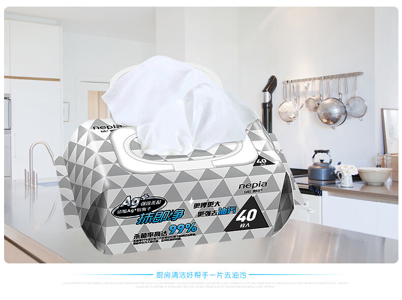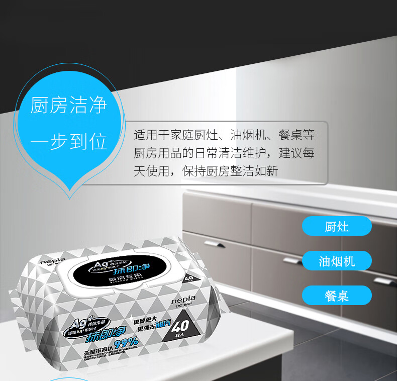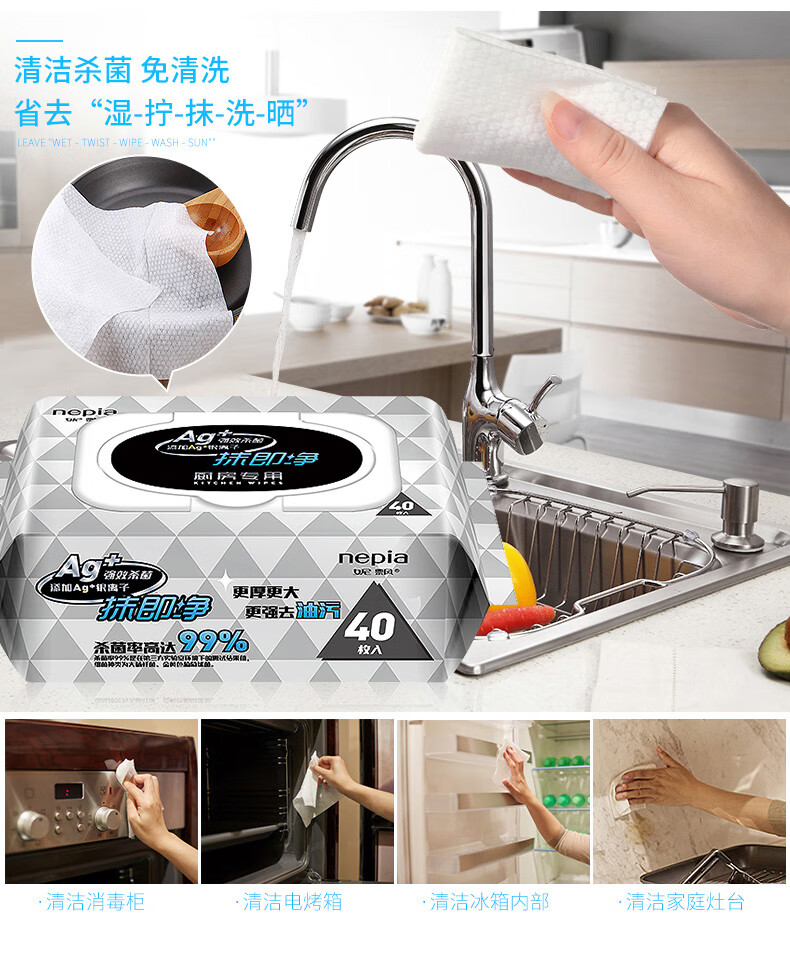 妮飘(Nepia)厨房湿巾40抽单包卫生湿巾99%杀菌率带盖抽取式消毒纸巾 1层 40抽*4包_MW