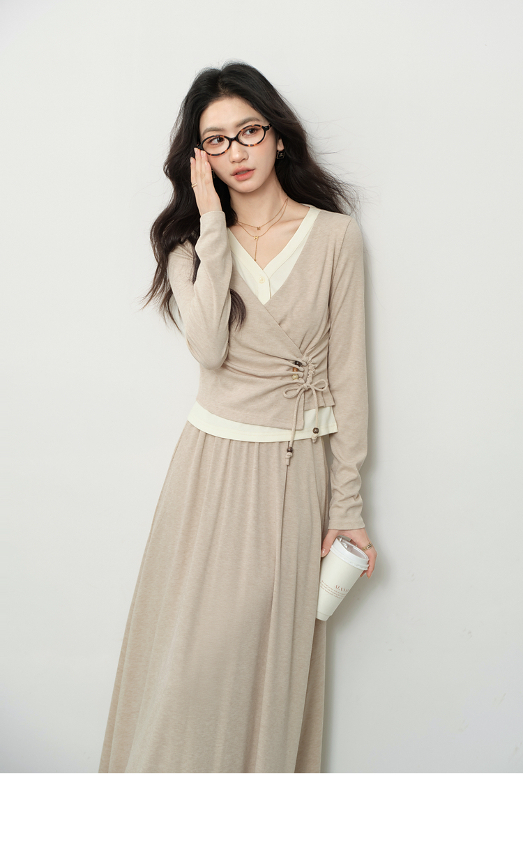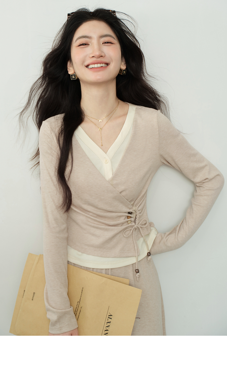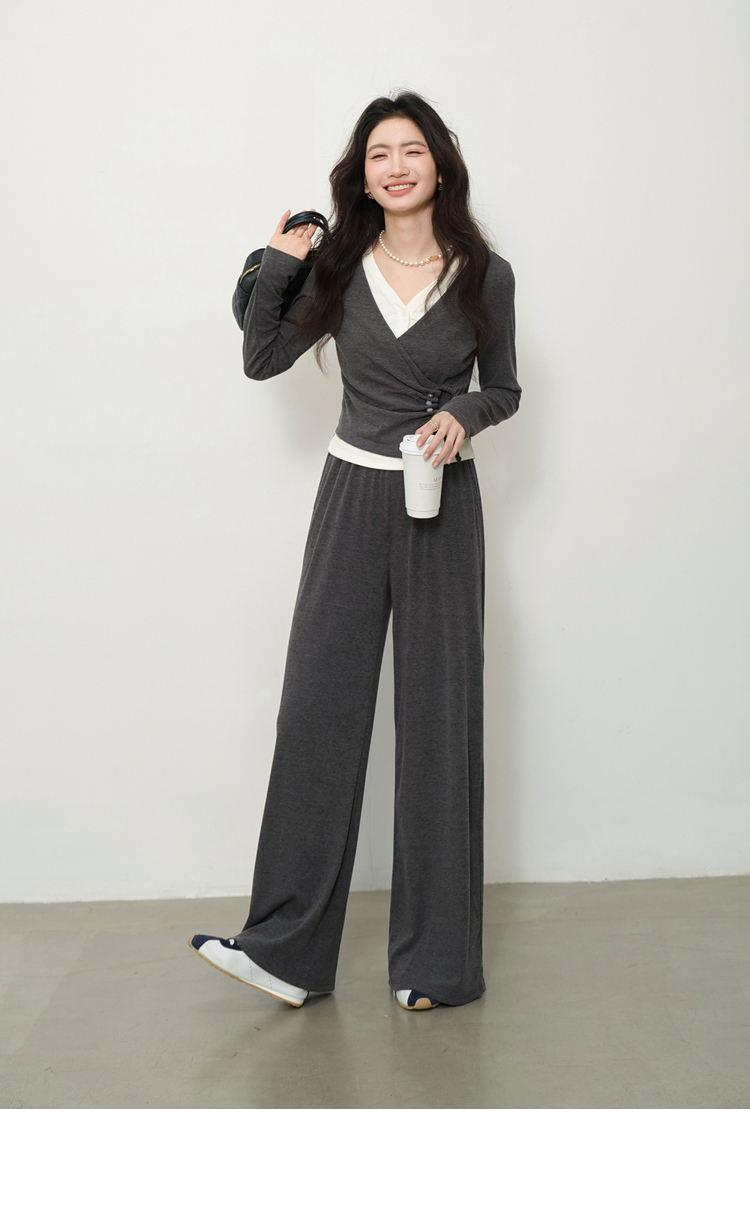 鹿向南「油画风铃」假两件百搭灰色长袖t恤休闲裤女秋穿搭两件套