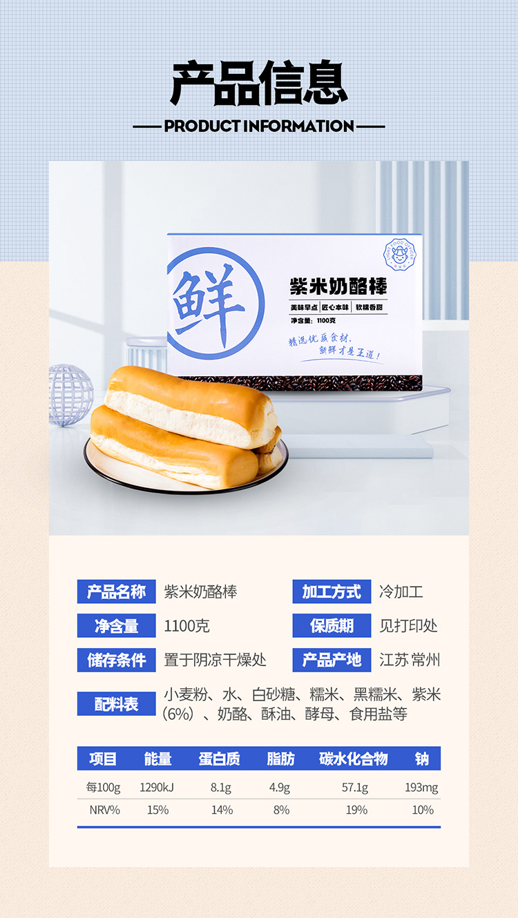 【产品】轻食官紫米奶酪棒面包 【净含量】110g*10袋 【保质期】10天(外包装日期钢印调整) (随着季节保质期更改) 【产地】江苏常州 【生产日期】现做现发,最新日期 【储存方式】于阴凉干燥处存放、避免阳光直射。 【食用方法】开袋即食,短保食品尽快食用 【发货时效】48小时内 【物流】中通/丰网不指定, 【不发地区】新疆,西藏,青海,内蒙,宁夏,海南,甘肃,海南,港澳台和疫情地区不发 【售后理赔标准】: 短保食品是根据订单按需生产,没有库存。下单3小时后,拒绝退款。介意者慎拍! 1.产品质量问题包售后; 2.短保食品下单信息务必准确,因地址不详/电话错误疑难件/拒收,签收超时,不赔付;改地址需要收费,运费到付; 3.物流破损,签收24小时内运单号和产品照反馈,补发或者退款 轻食官紫米系列面包🍞(轻食官紫米面包,肉松紫米面包,长条紫米奶酪棒)保质期变更为10天(含当天)‼届时包装袋上保质期会同步变更。请各位及时调整产品信息,以免造成售后问题 ✅另:再次友情提示--夏季多高温,雨水天气。紫米系列面包内含天然谷物--新鲜紫米,糯米等。烦请气温高于20°地区的客户,收到紫米面包后,请放冰箱冷藏,利于储存。(短保食品保质期随着天气变化改变,具体以食品外包装为准) 谢谢!