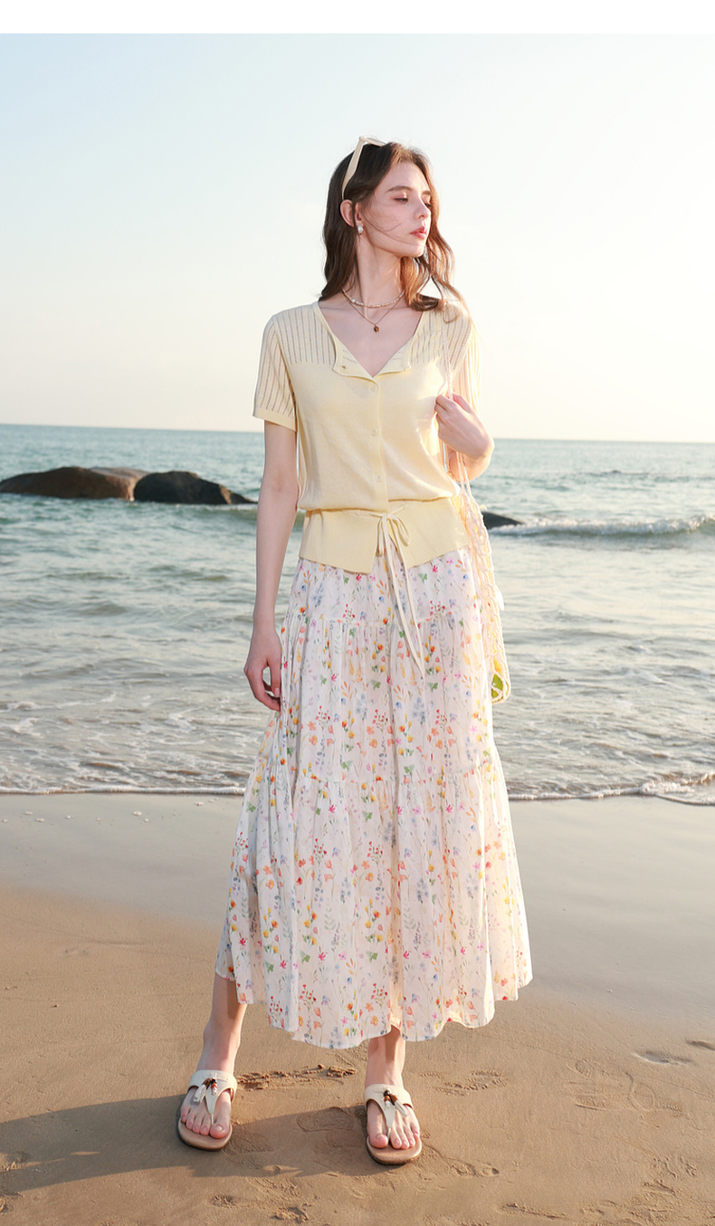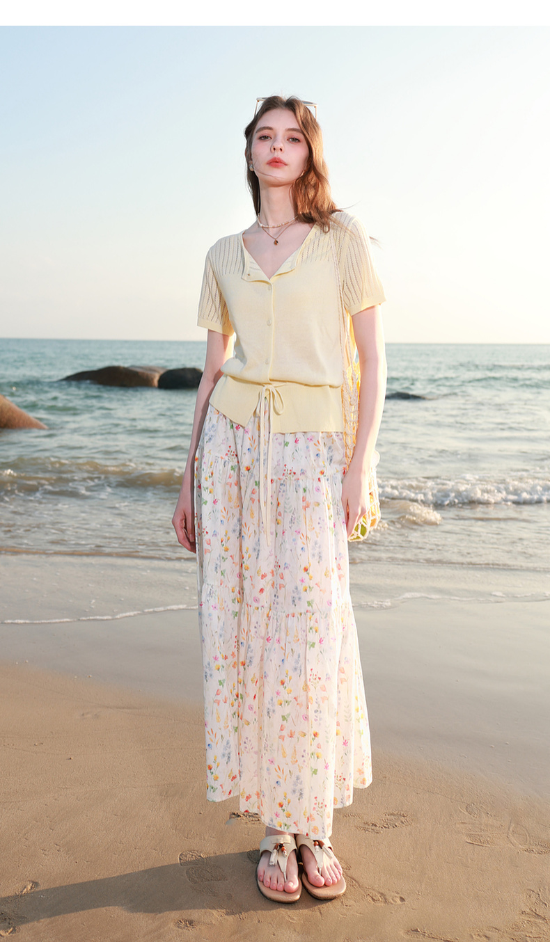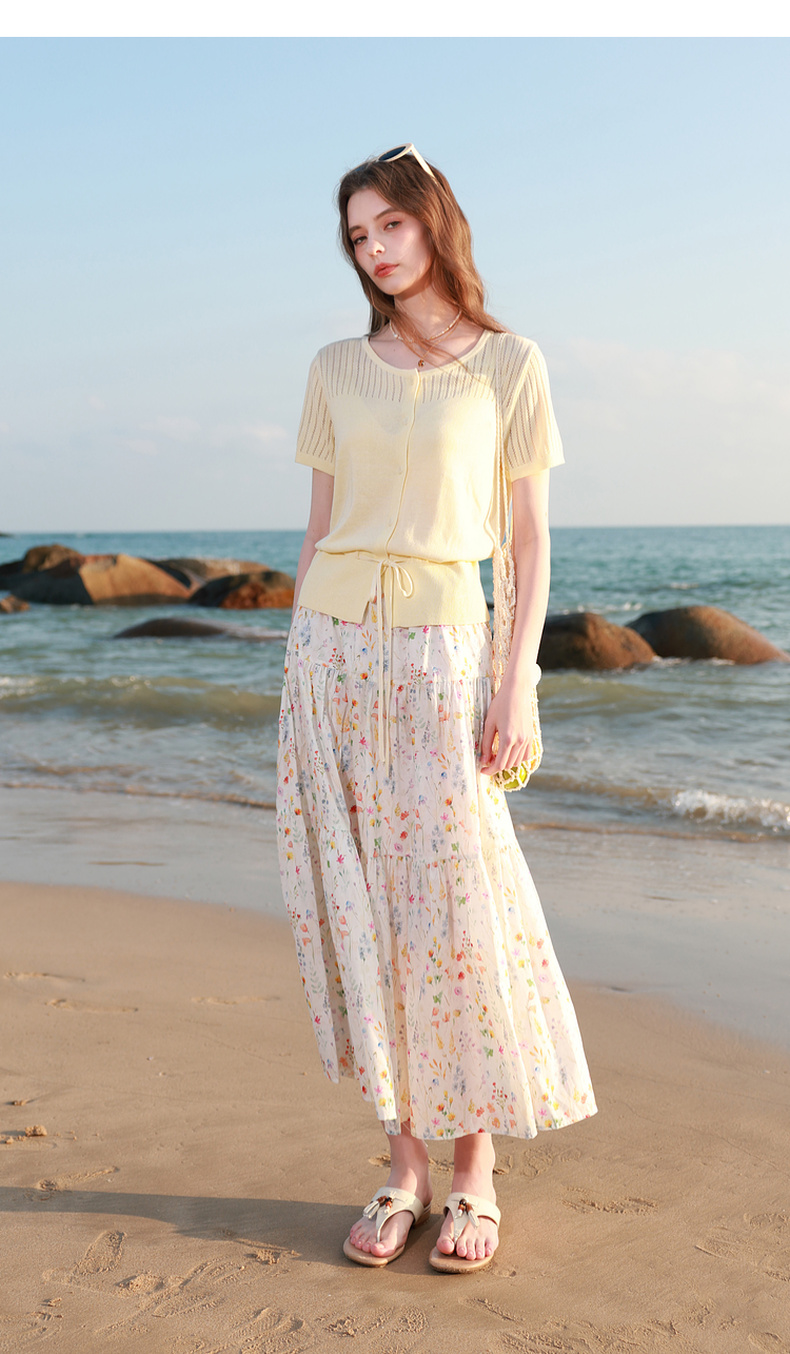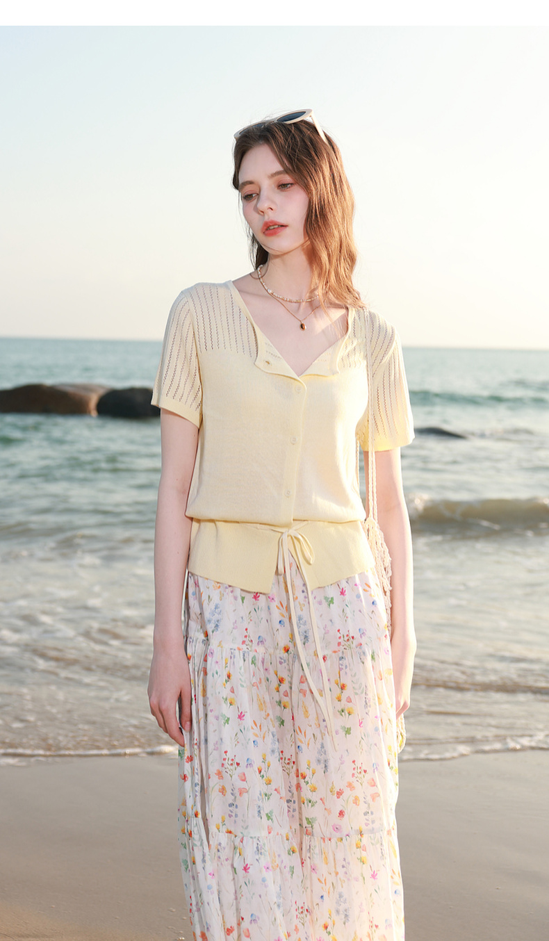三彩2026春季新款镂空圆领开衫短袖针织衫收腰上衣小外套M