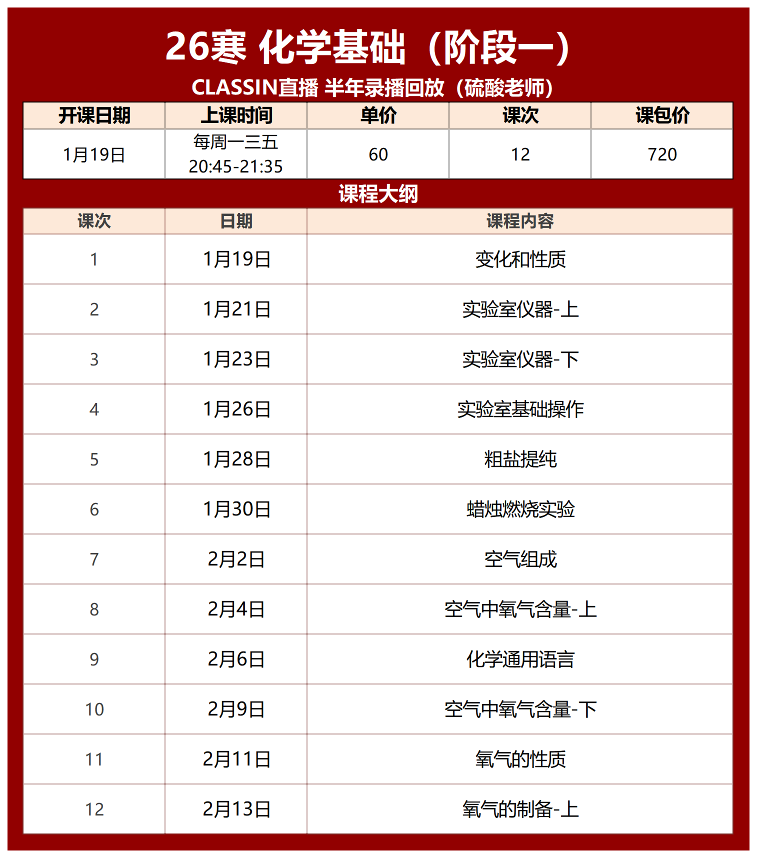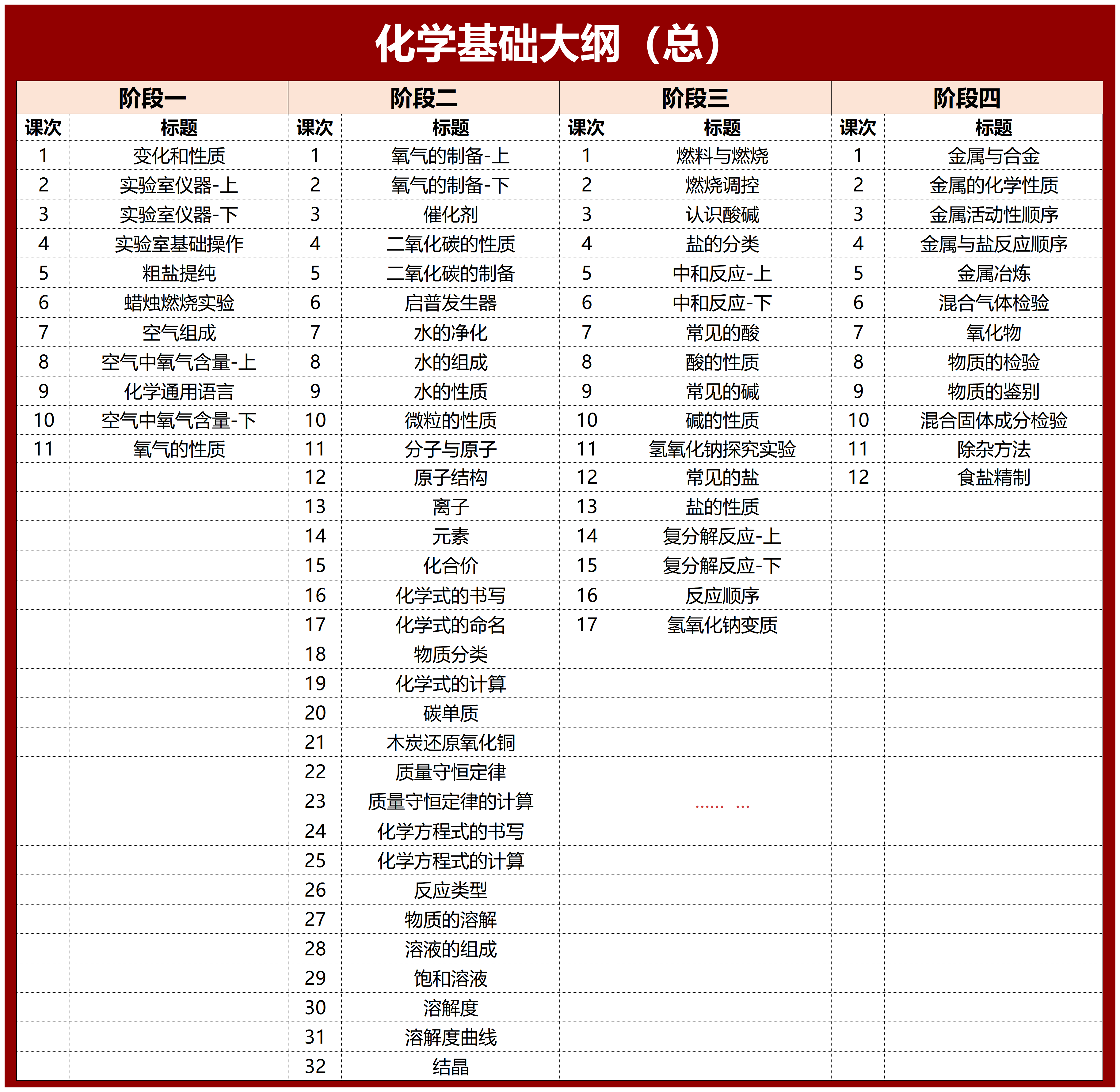 此课程共10个月四期,学完整个校内初中化学基础内容,跟校内知识点完全匹配,可作为校内化学的提前预习