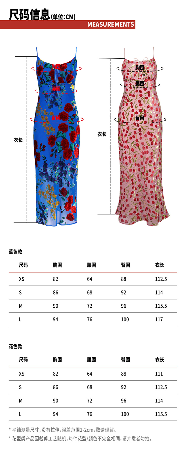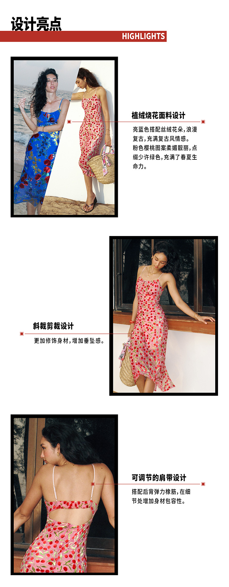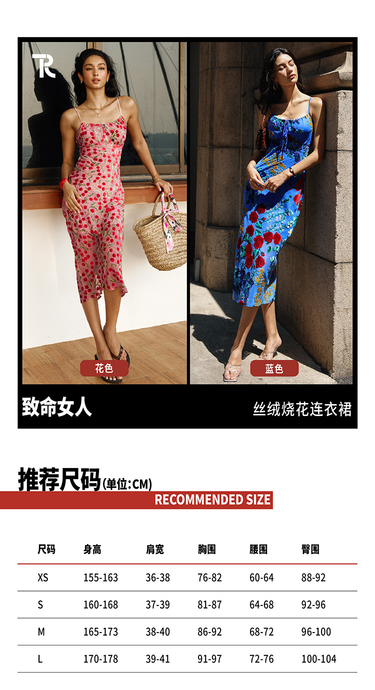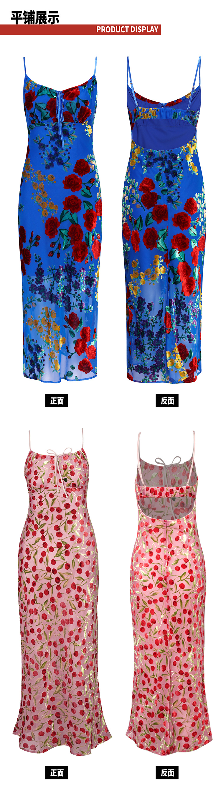 TR她热 致命女人 蓝色粉色丝绒烧花樱桃复古吊带辣妹显瘦连衣裙 蓝色L预售