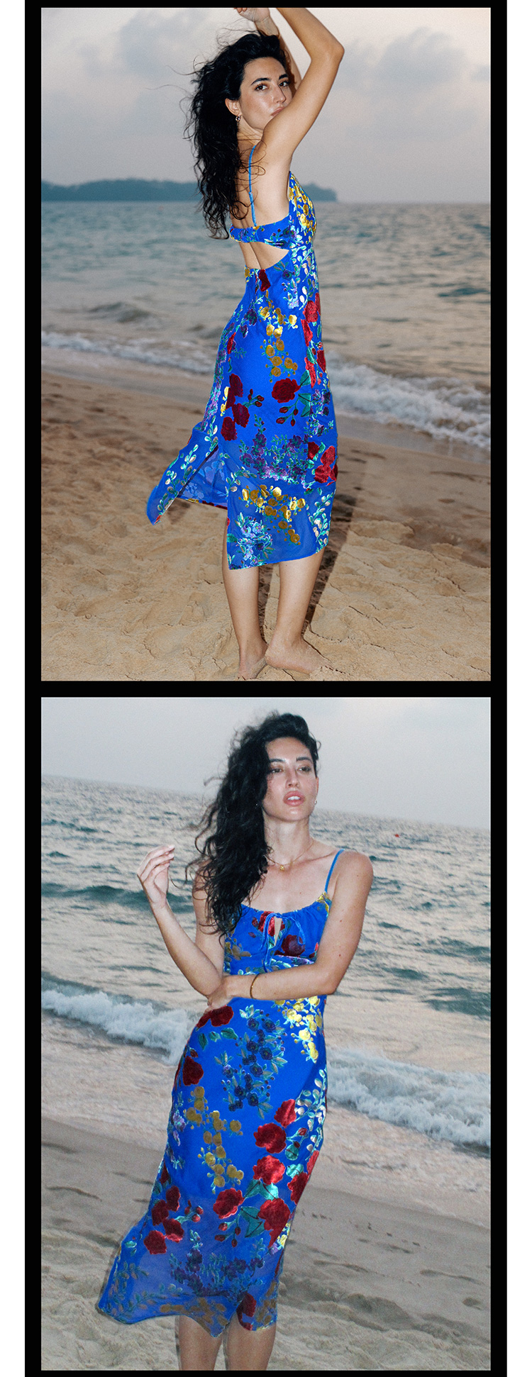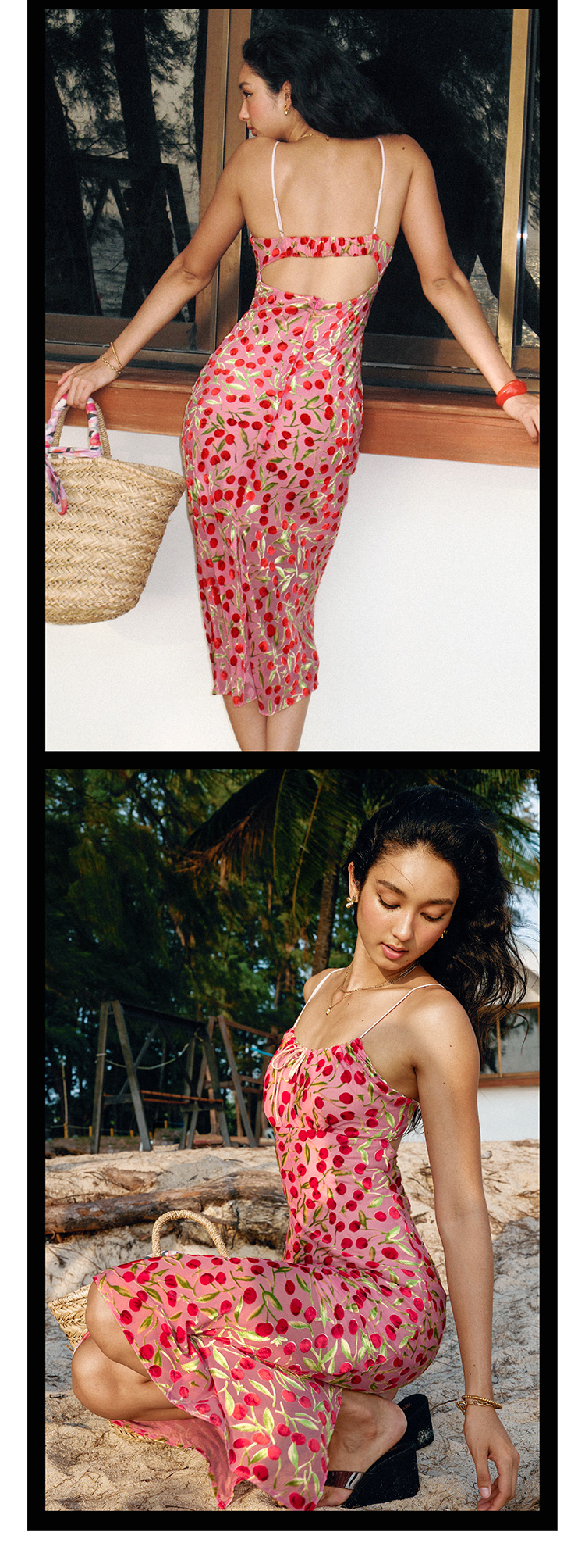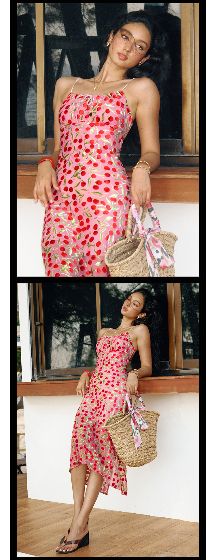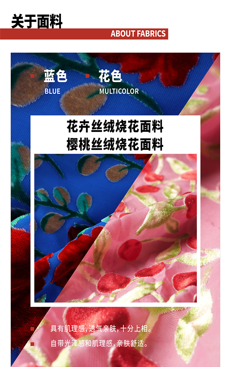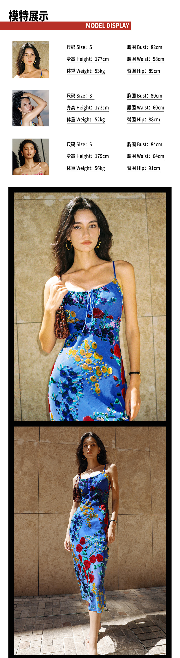 TR她热 致命女人 蓝色粉色丝绒烧花樱桃复古吊带辣妹显瘦连衣裙 蓝色L预售