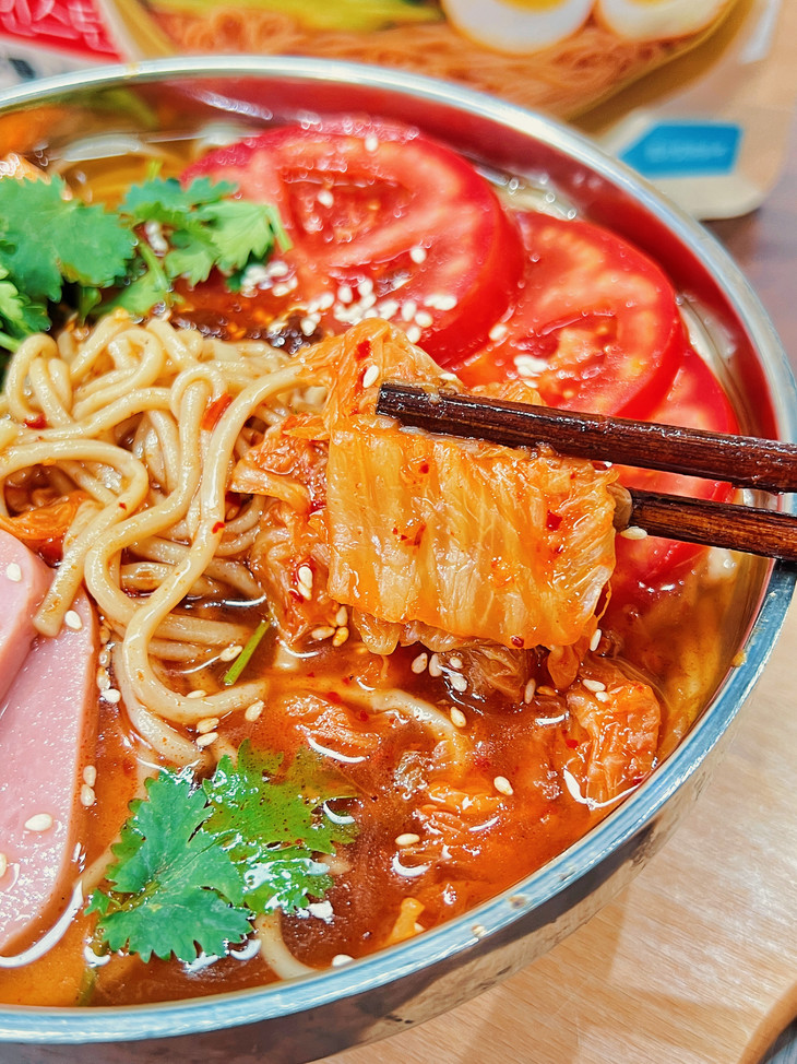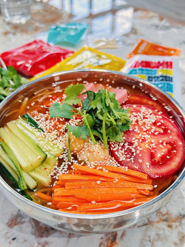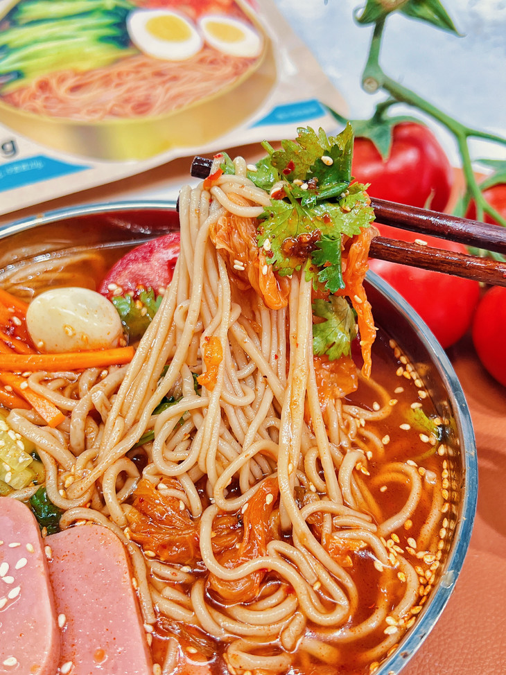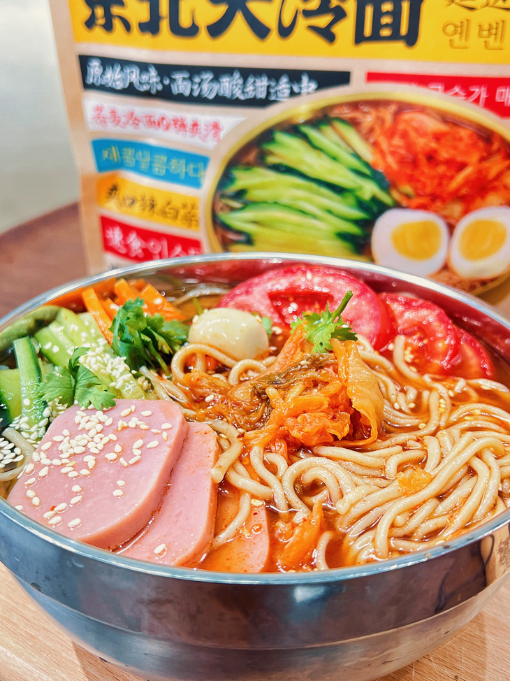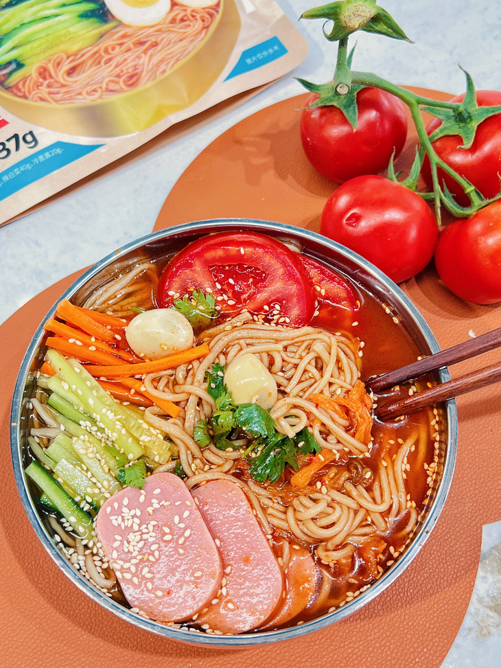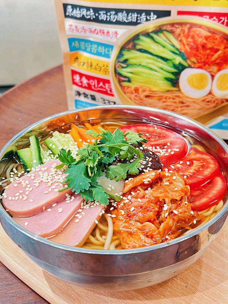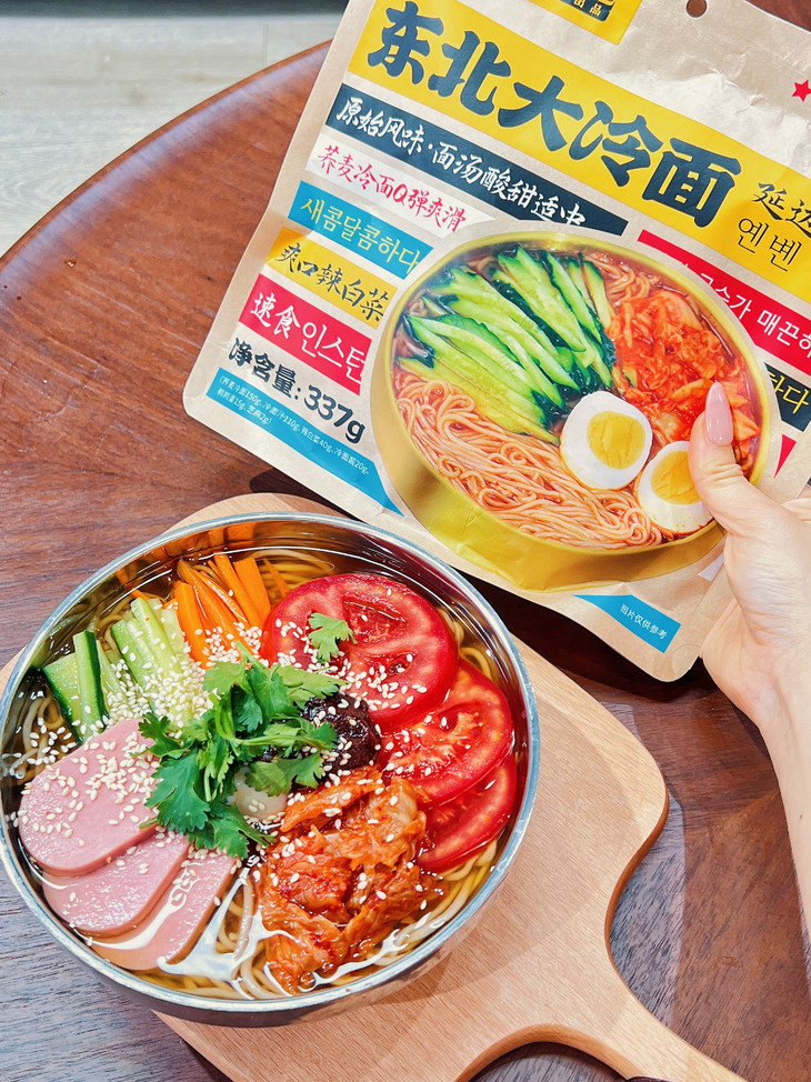 在家花十分钟就能搞定 随时随地享受吃冷面的快乐🍝 香气馥郁的辣椒油,酸辣开胃的辣白菜 提鲜增味的芝麻,个大饱满的鹌鹑蛋 诱人的酸甜口冷面,麦香扑鼻滑过喉咙 从酸到甜再顺势过渡到咸和辣 各种滋味在唇齿间跌宕起伏 裹挟着清新酸爽在口中肆意冲撞,无比过瘾~