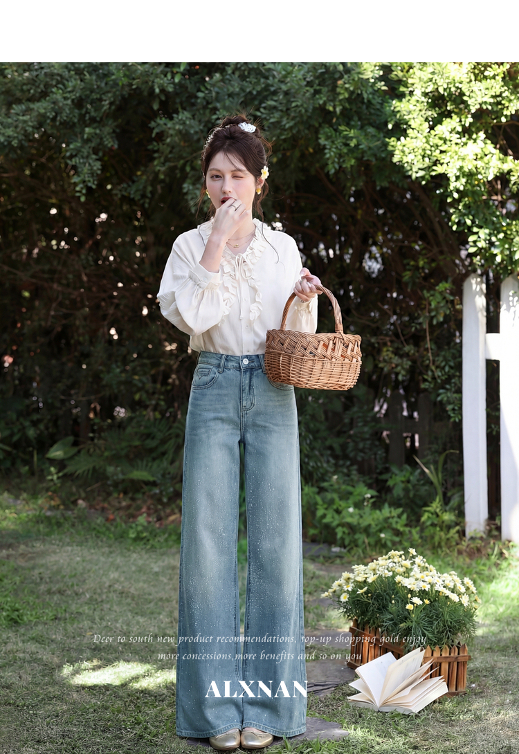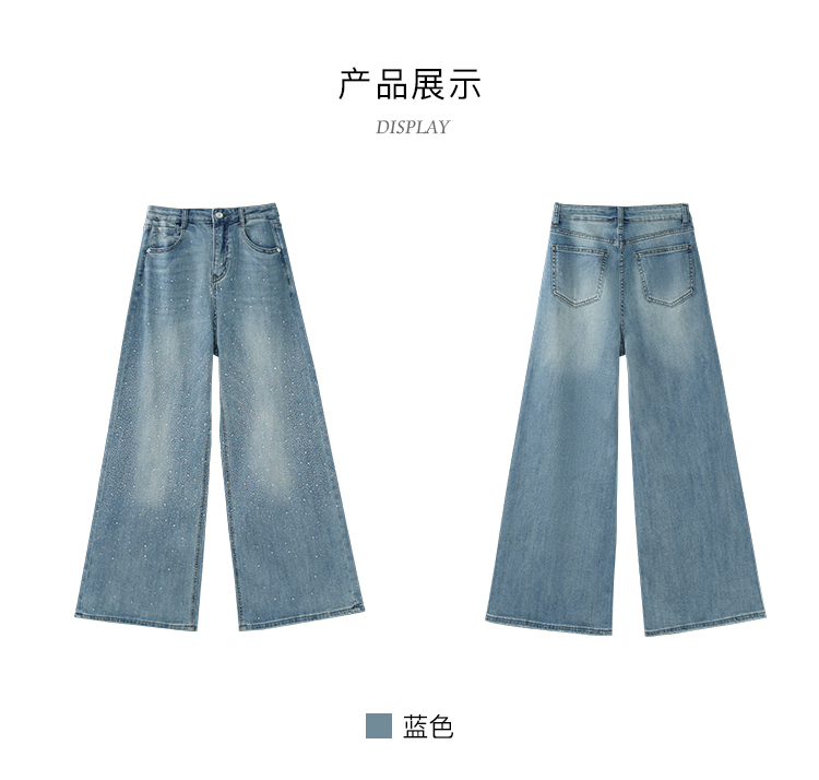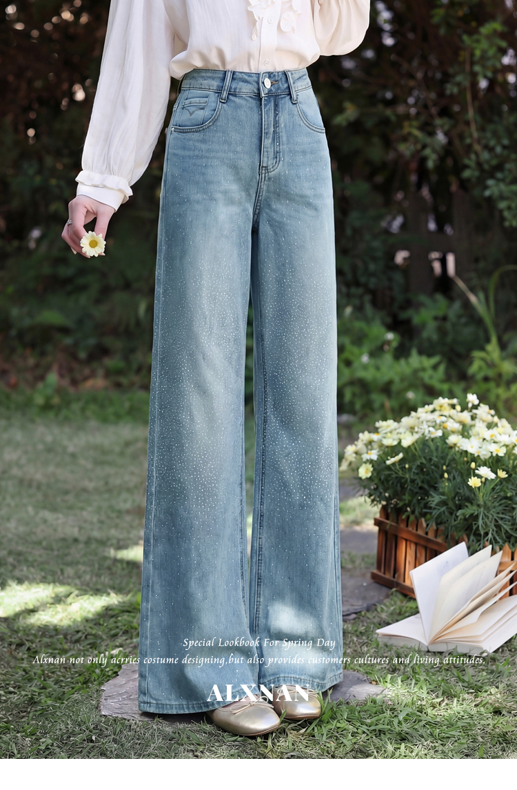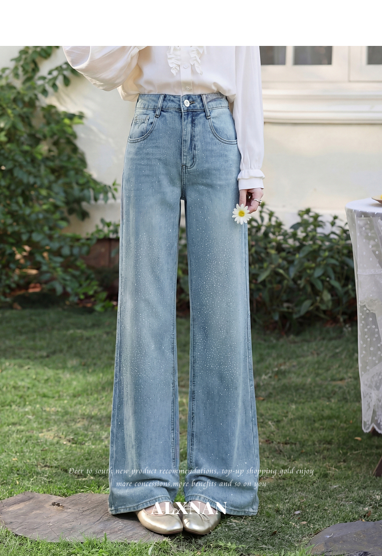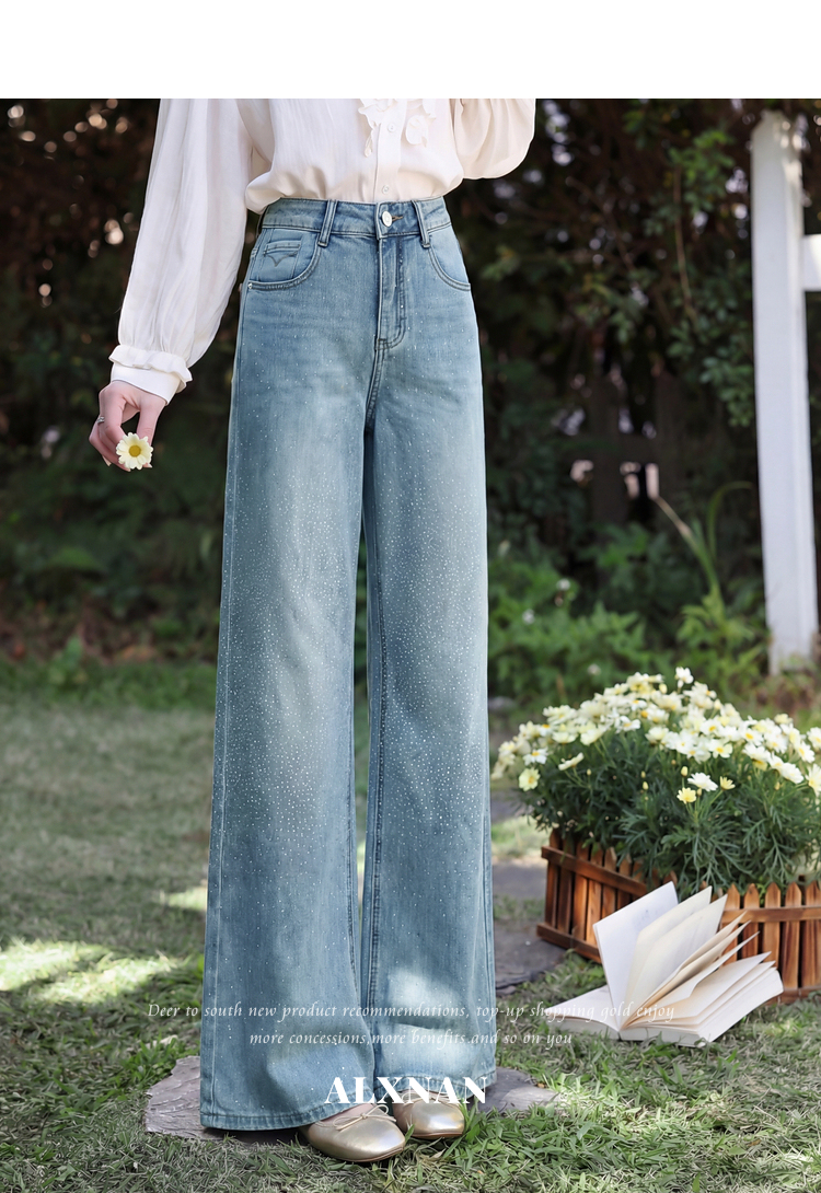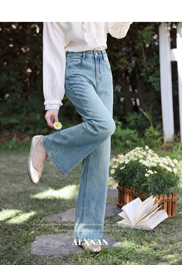 鹿向南「午后漫步」慵懒风蓝色烫钻牛仔裤女夏季新款显瘦气质长裤
