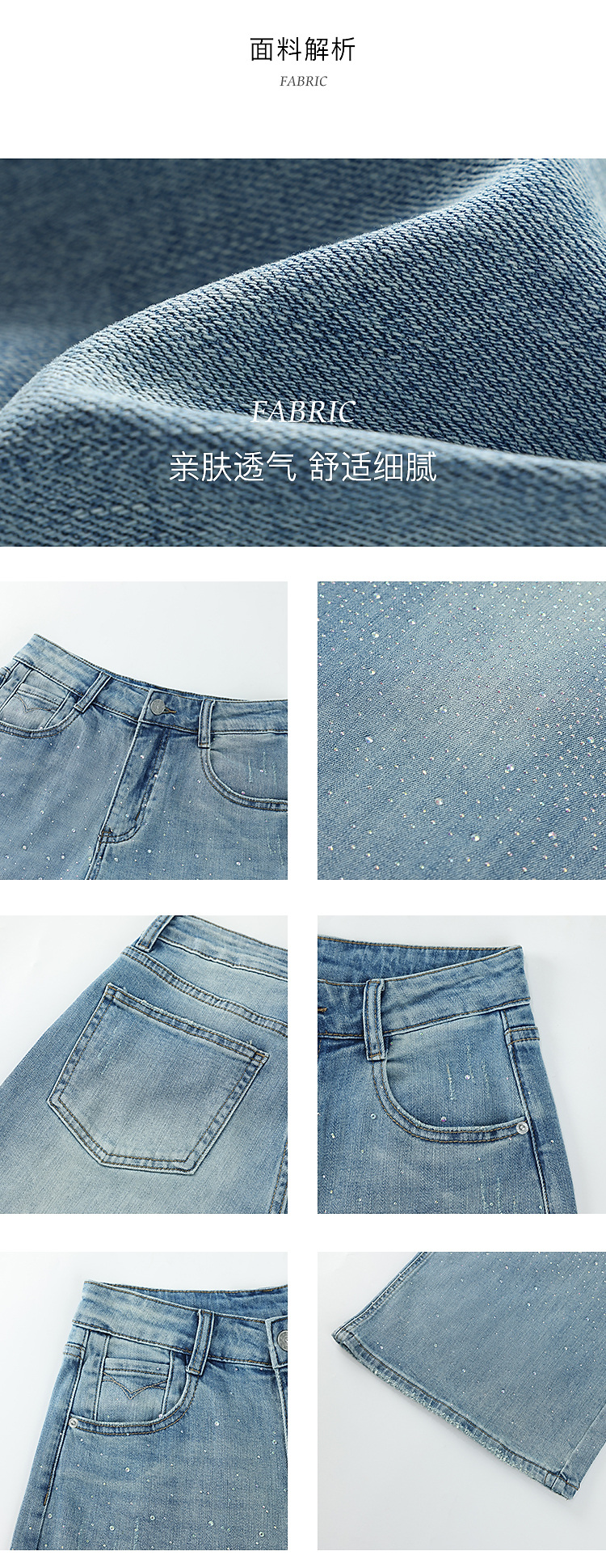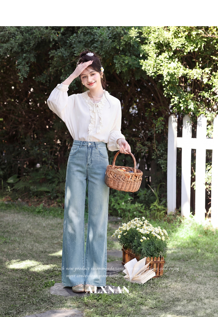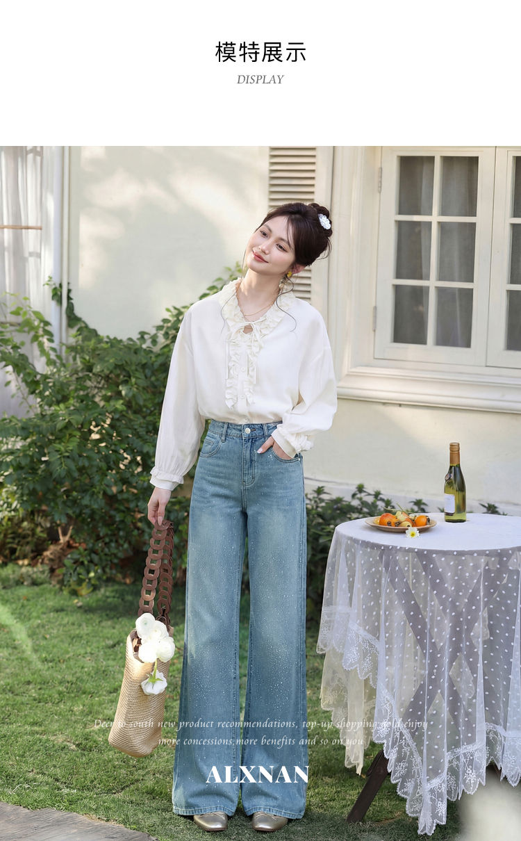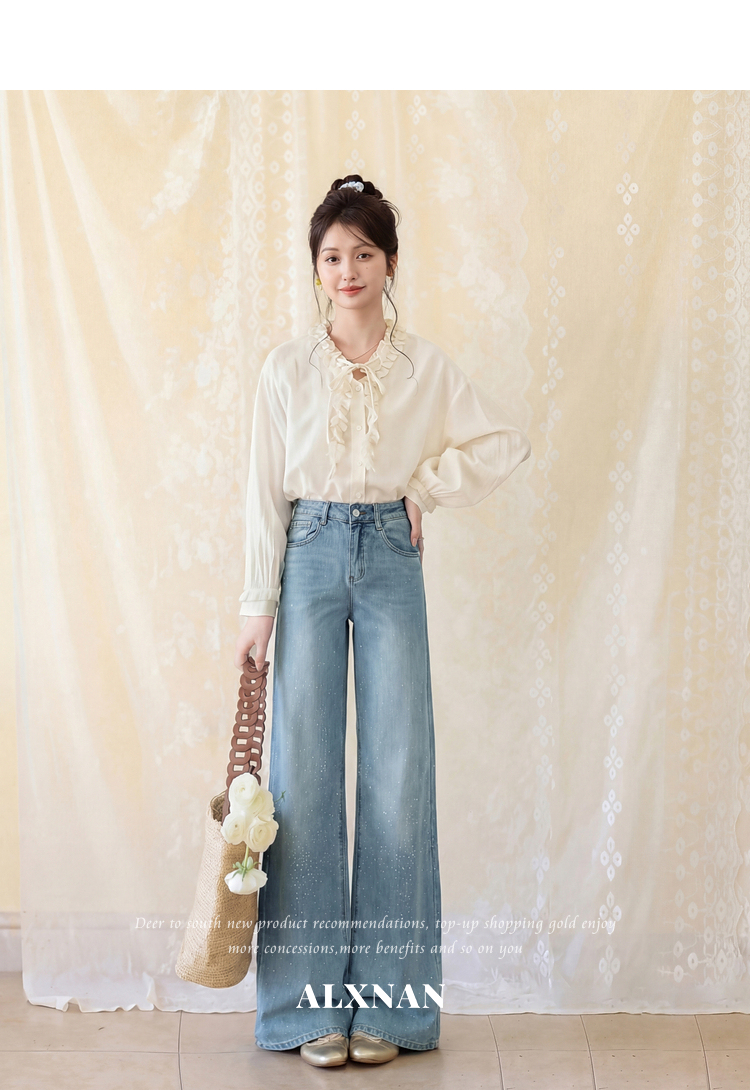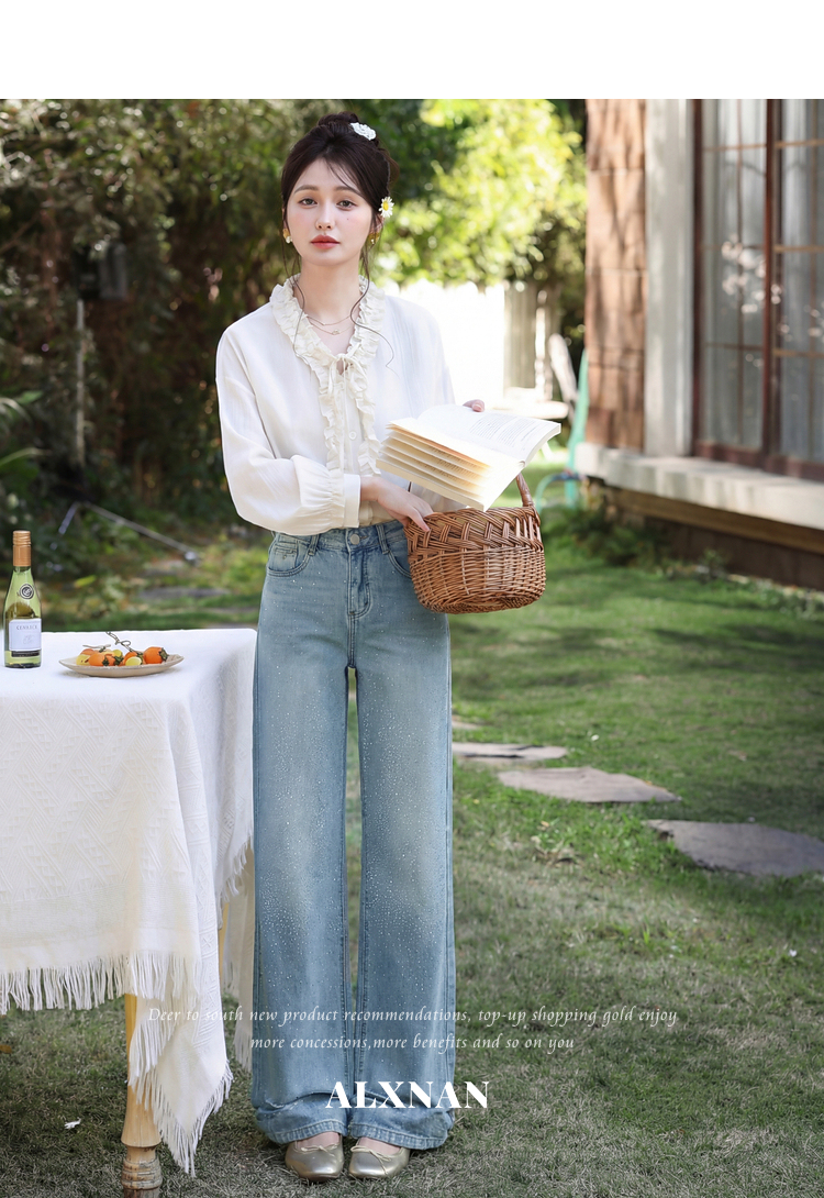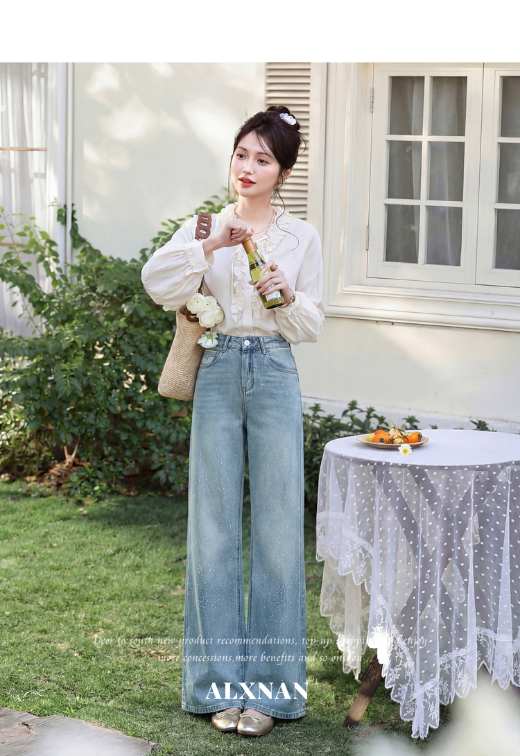 鹿向南「午后漫步」慵懒风蓝色烫钻牛仔裤女夏季新款显瘦气质长裤