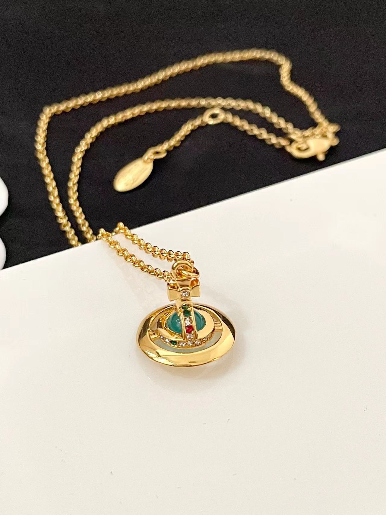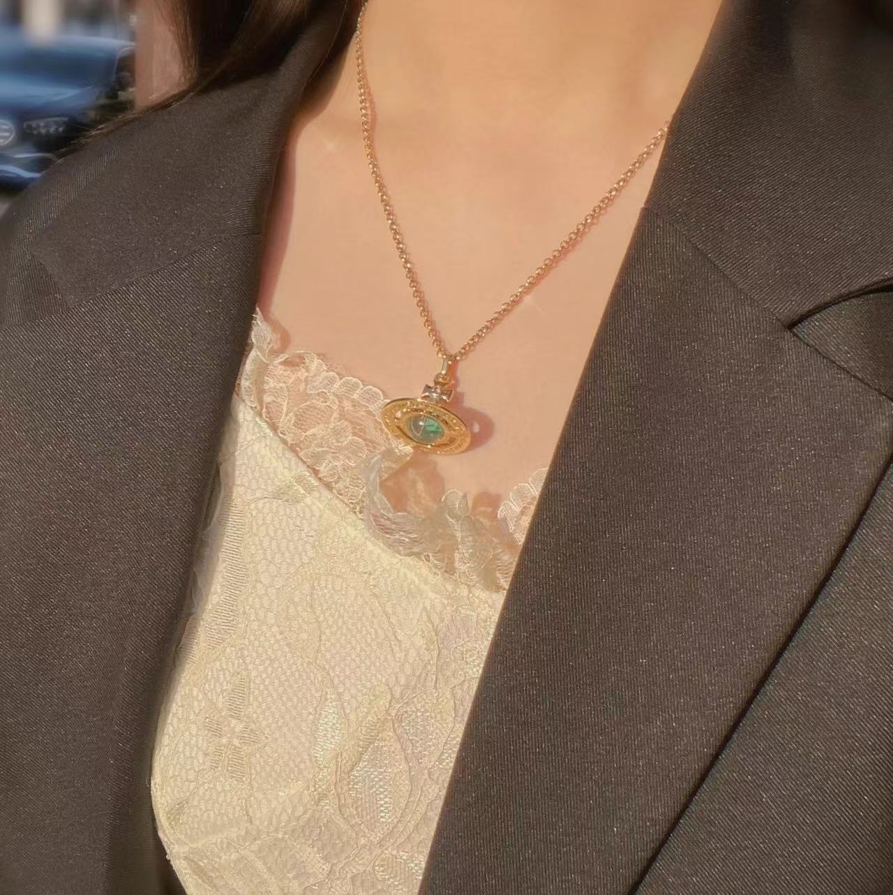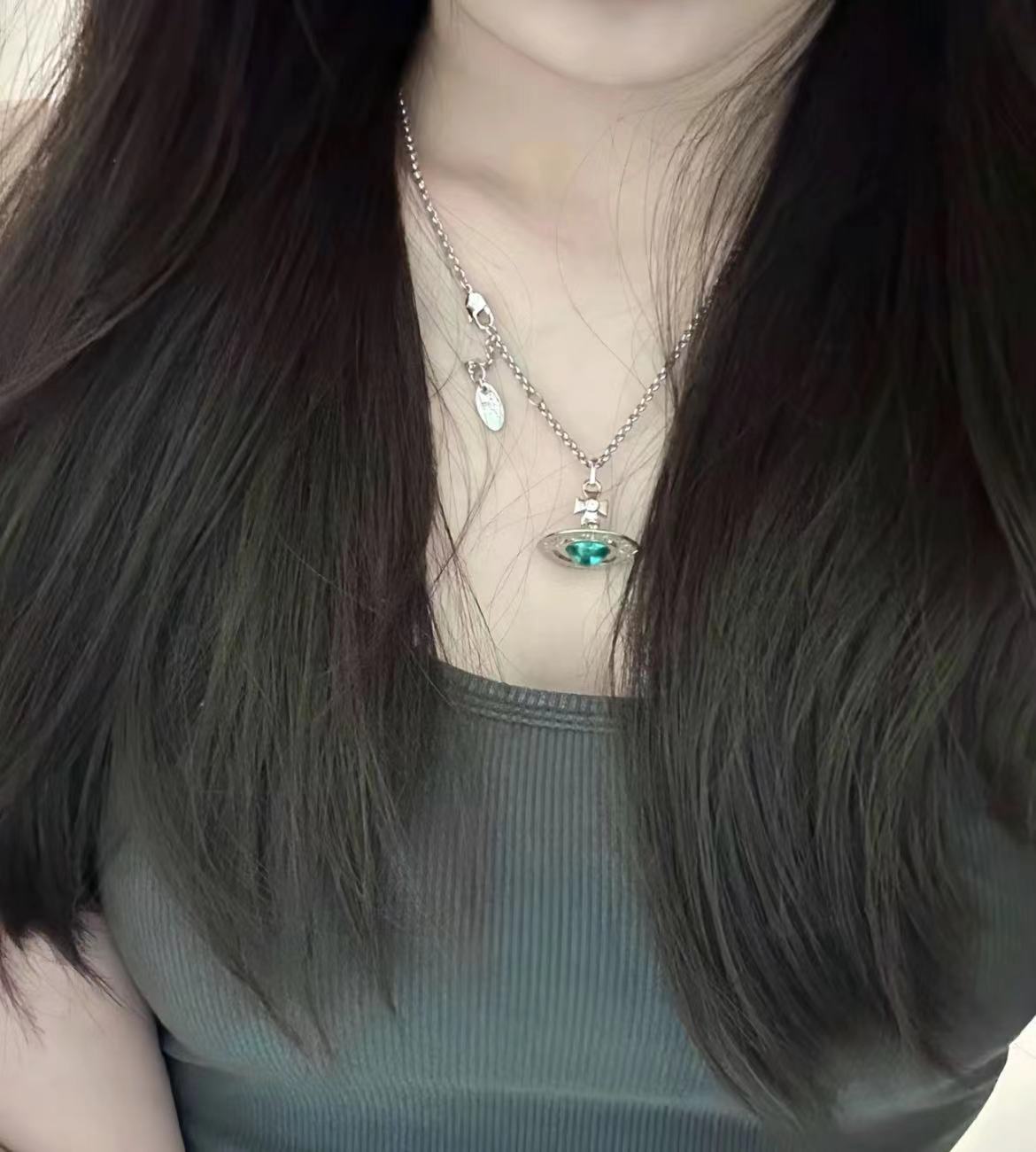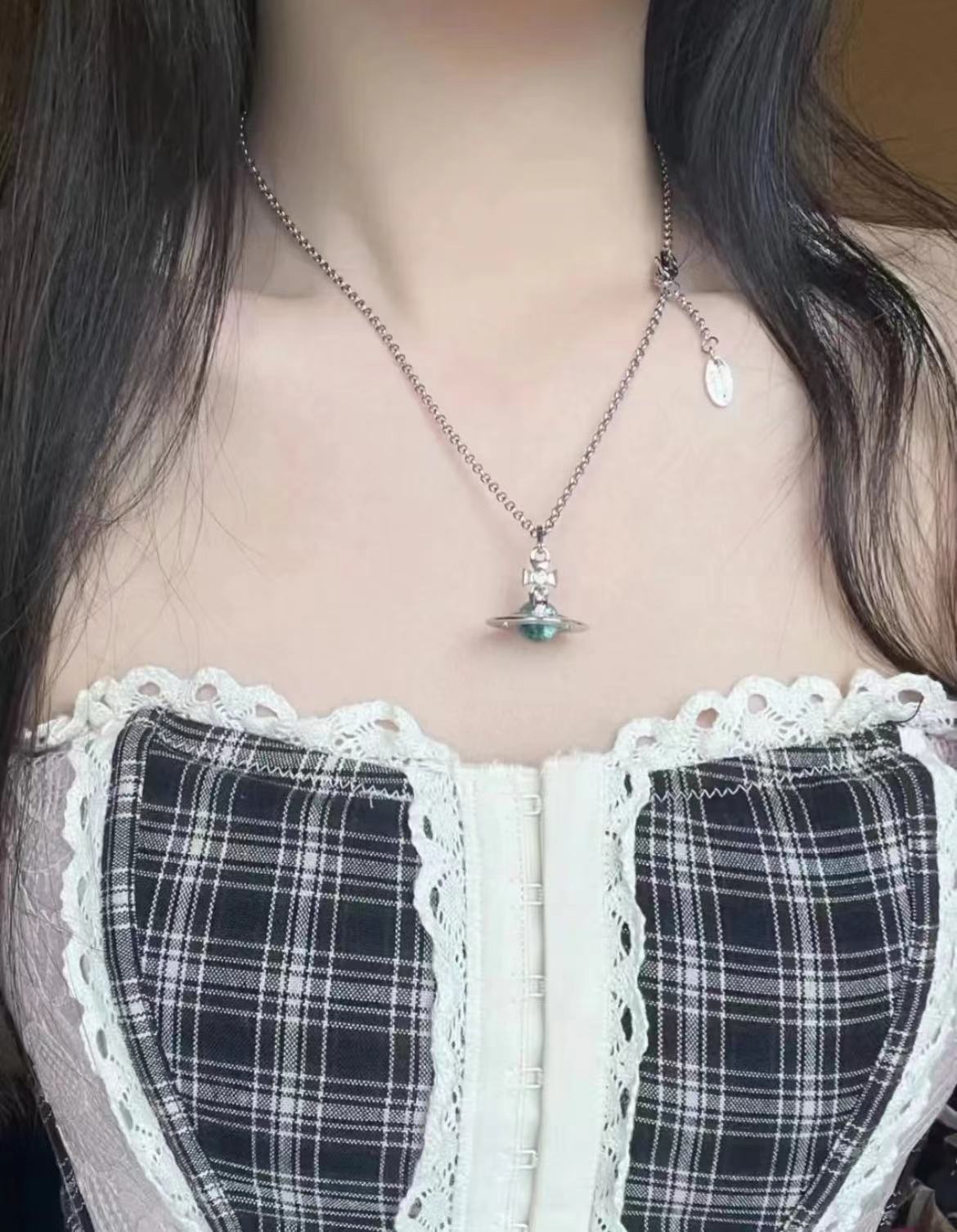 高品质 细节如图【VivienneWestwood】两色有货 金色配薄荷绿珠,银色配薄荷绿珠 宝宝,什么是快乐星球,来,这就是快乐星球!绝美立体土星项链,,重磅推荐,闭眼入准没错!纯粹王冠球是经典的象征,闪耀土星环勾勒未来波光流转间,开启一场与未来的崭新际遇!土星造型简直不要太有辨识度,设计感超赞,土星上边的钻采用定制的施华洛水钻,立体的设计,中间是特别定制的薄荷绿琉璃珠,一抹薄荷色真的很绝,很夏天,拿到手完完全全可以感受到它的质感,手感超nice👍🏻用水钻的点缀出现在土星的设计上,增添不少冷艳时髦的俏丽模样,使得朋克同时又有点小少女,自带一群时尚粉!真的敲好看,可盐可甜,可纯可欲!一眼便钟情,绝对是“实用+高级”界的杠把子,绝对的yyds,绝对的宝藏永不过时!