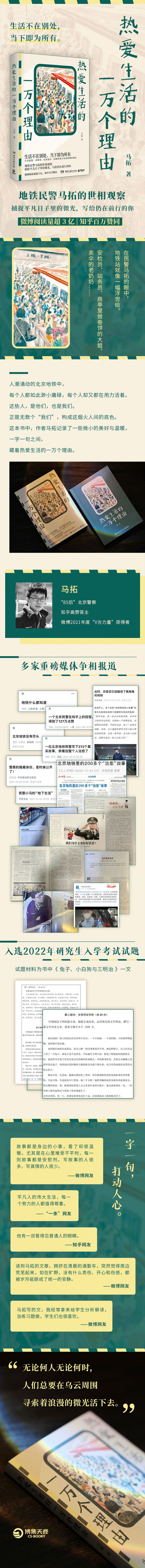 在民警马拓的眼中,地铁站就像一幅浮世绘。 安检员、站务员、商亭里做卷饼的大姐、卖伞的老奶奶…… 人潮涌动的北京地铁中,每个人都如此渺小庸碌,每个人却又都在用力活着。 这些人,是他们,也是我们。 正是无数个“我们”,构成这烟火人间的底色。 愿你从这些文字中,见众生,见自己。
