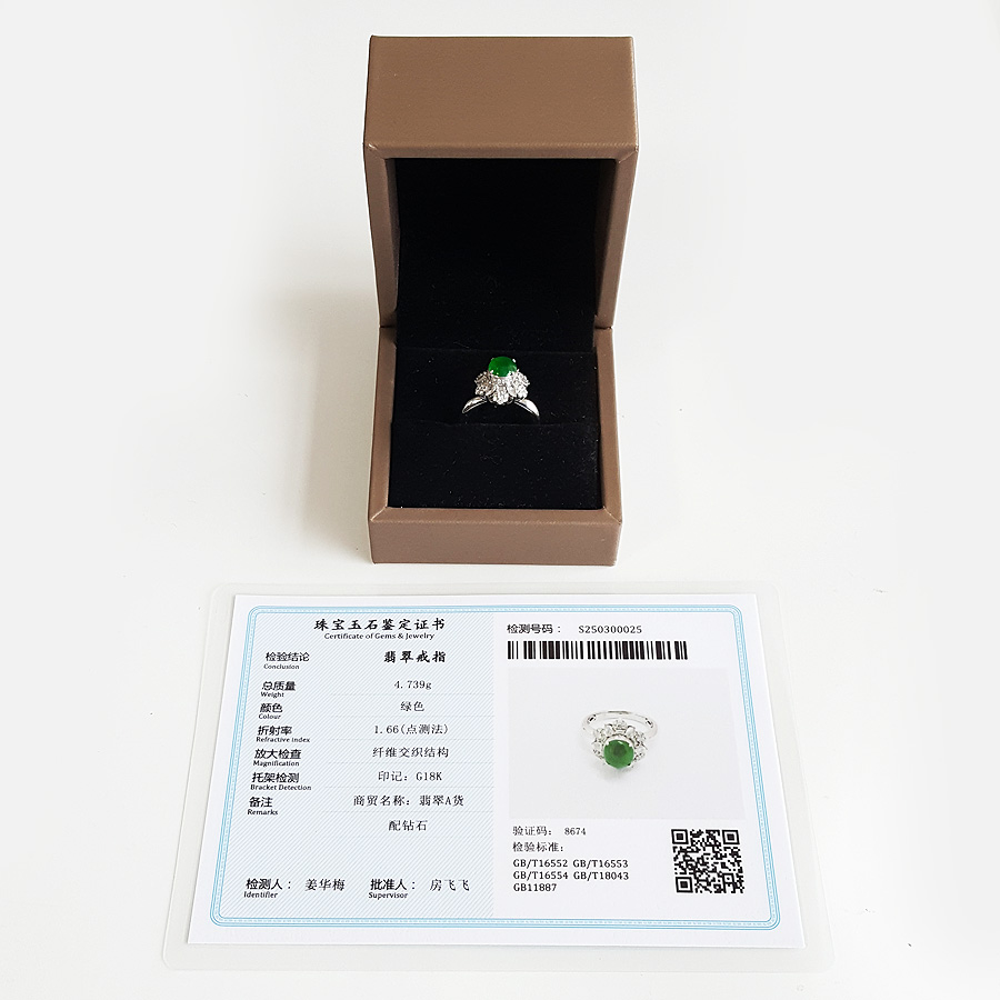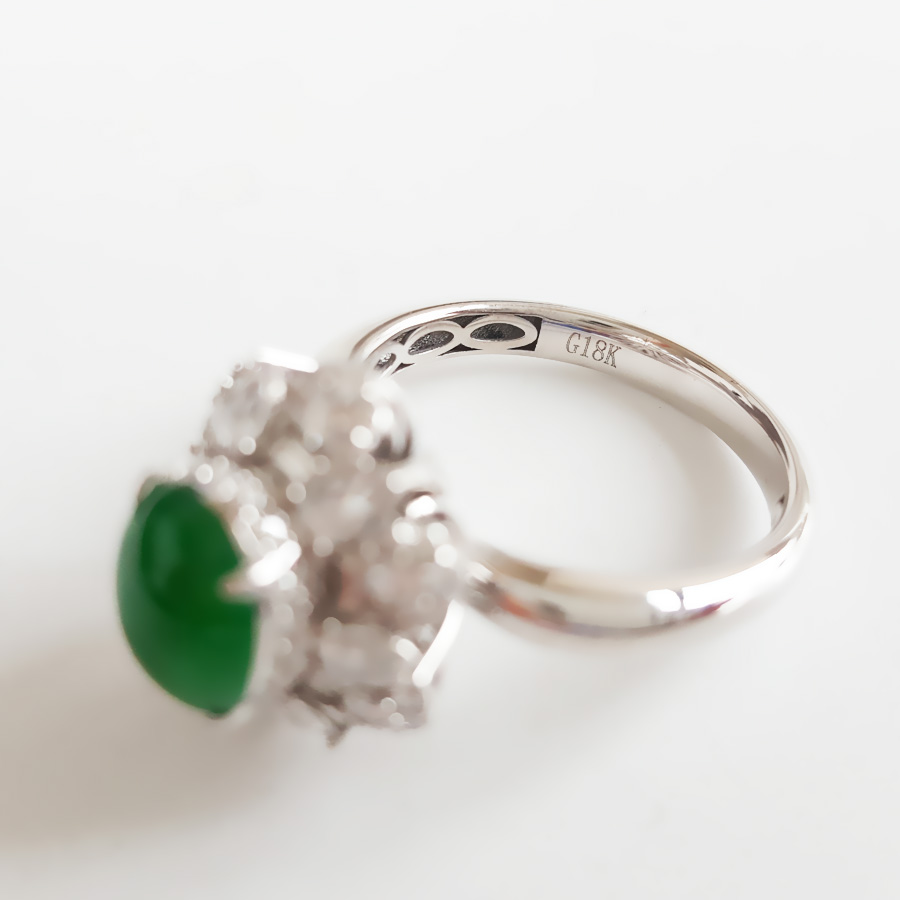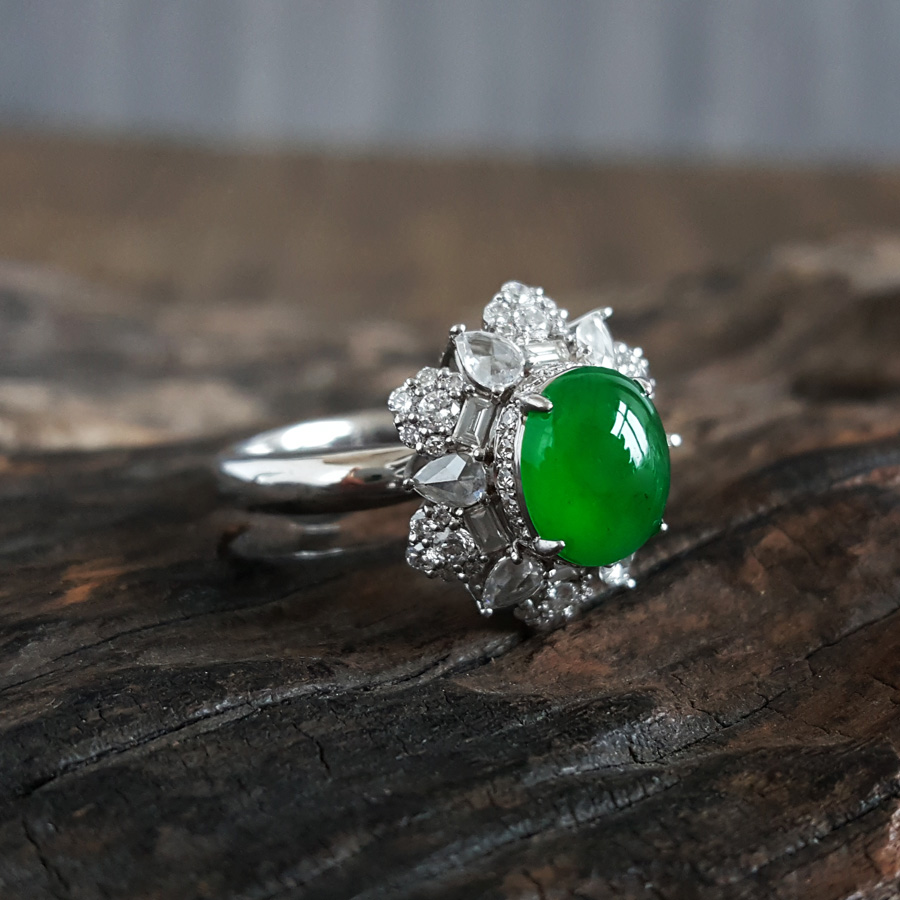 名称 | AU750收藏级白金豪镶钻镶天然冰种满绿蛋面翡翠戒指 |