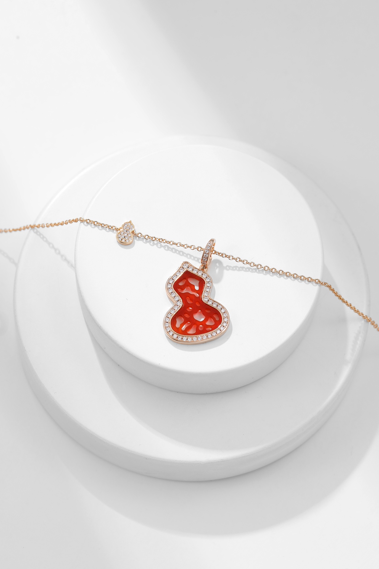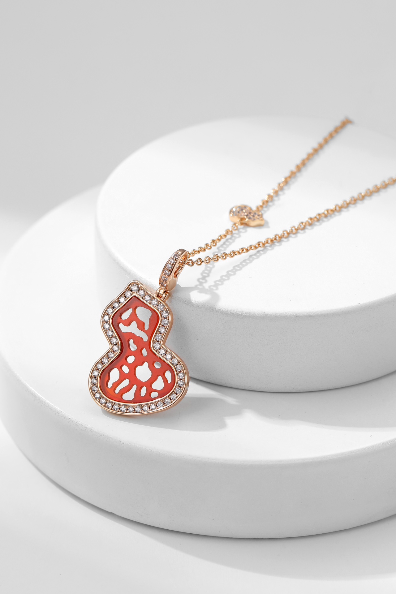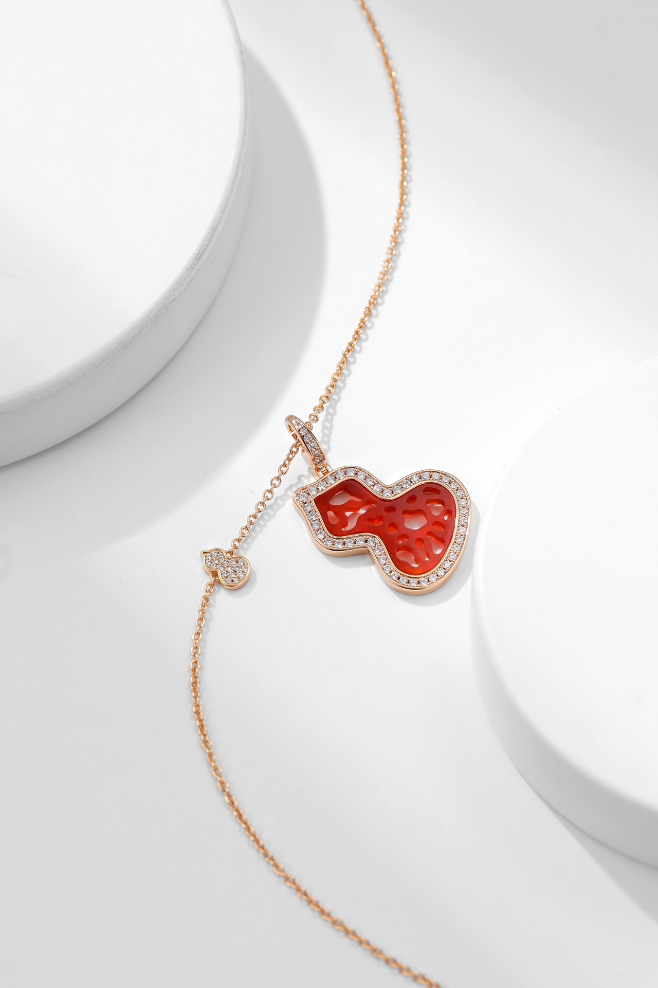 Qe*lin wulu红玛瑙蕾丝葫芦吊坠,中号尺寸:20*26mm,红玛瑙切割成不规则蕾丝形状镂空设计,灵感来自于敦煌石窟的中国艺术。搭配链长45cm,更佳合适日常佩戴。