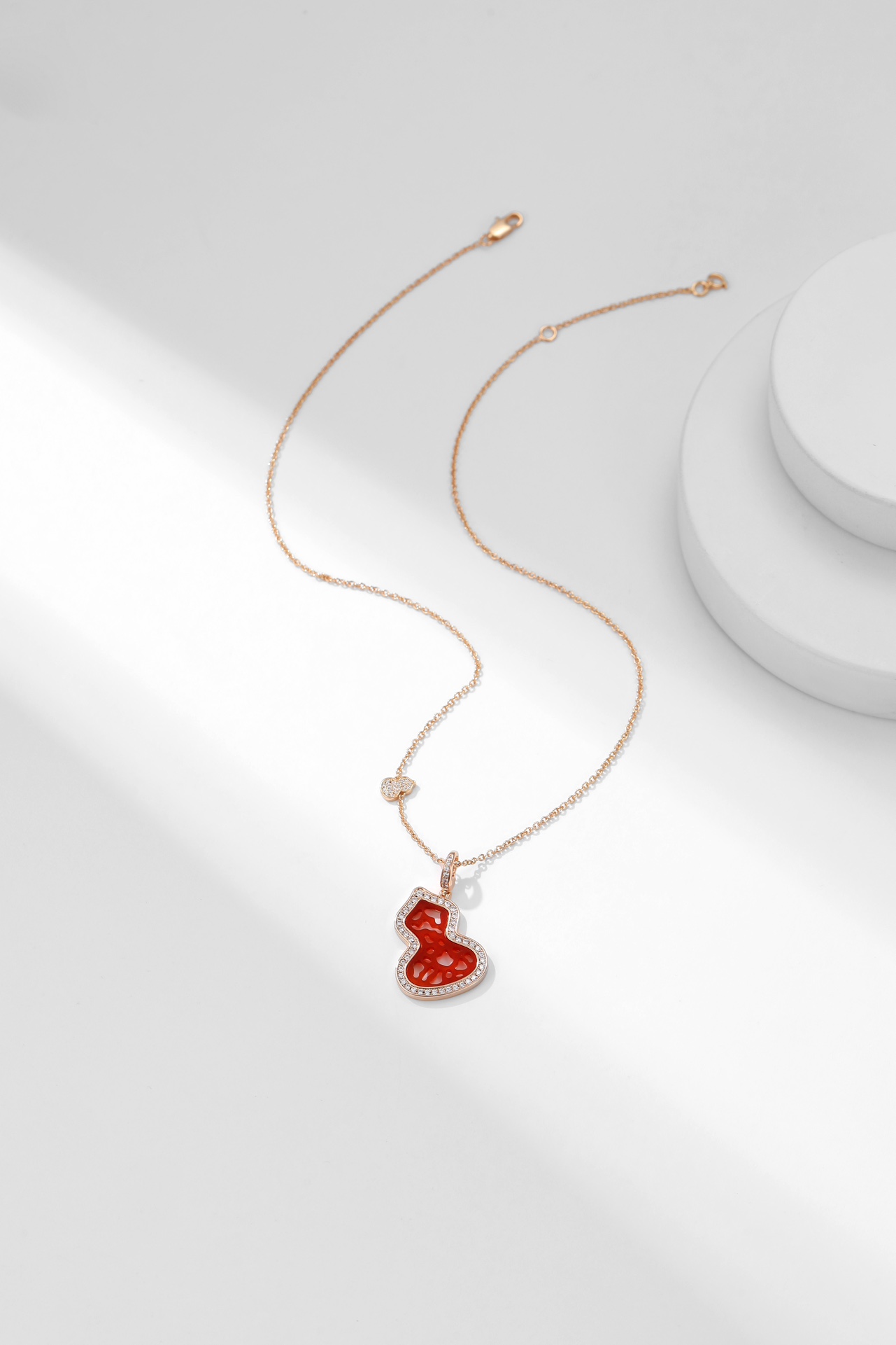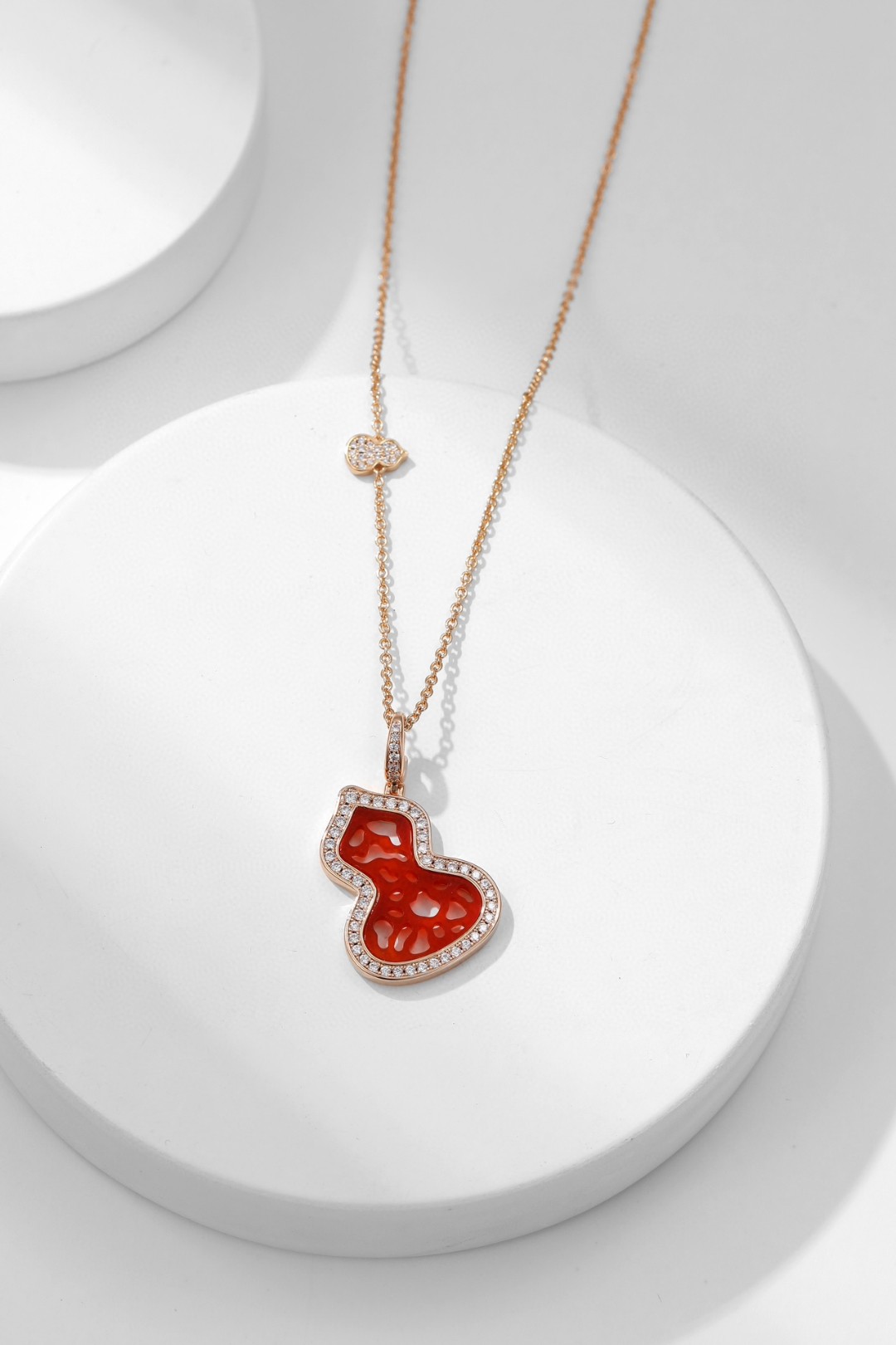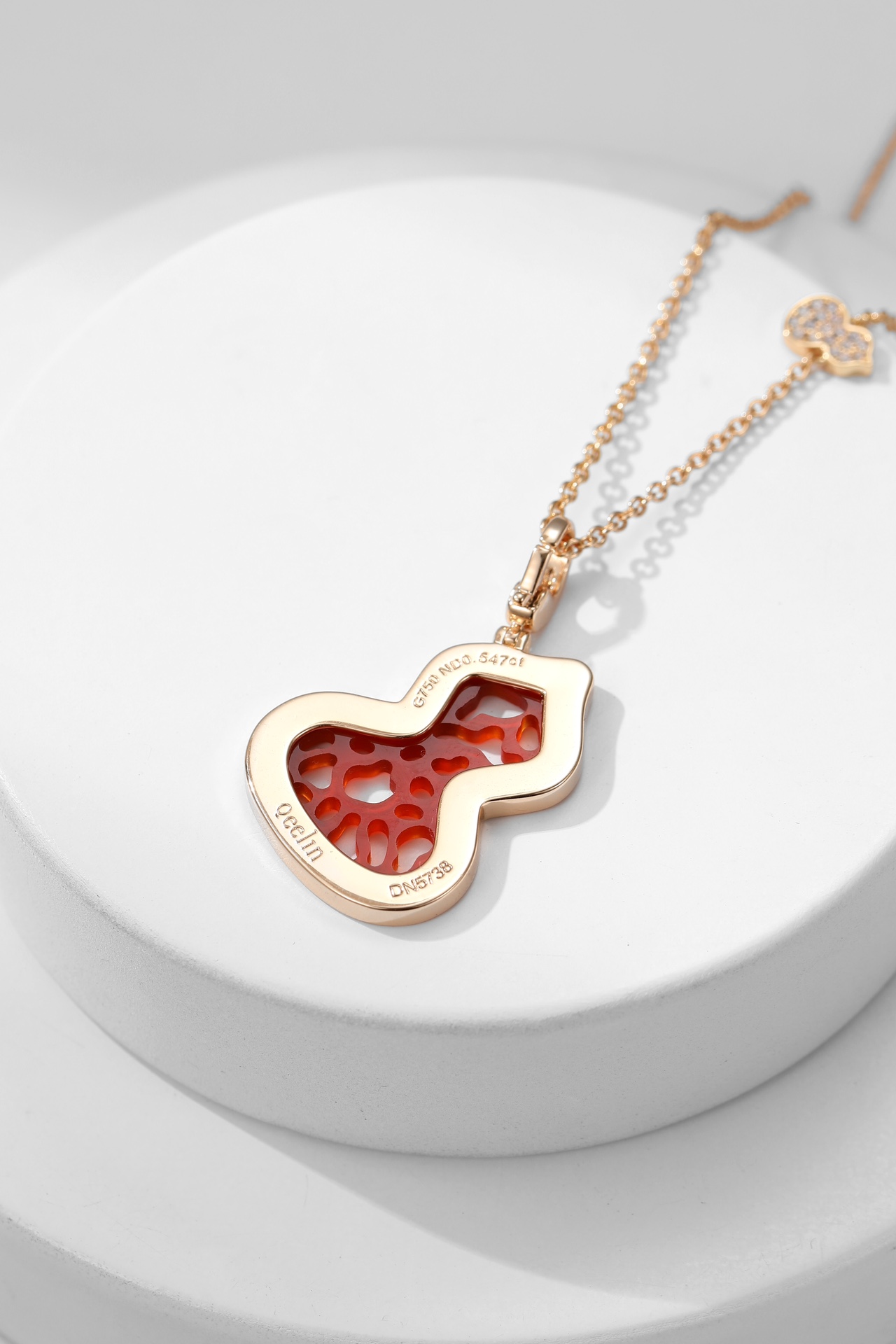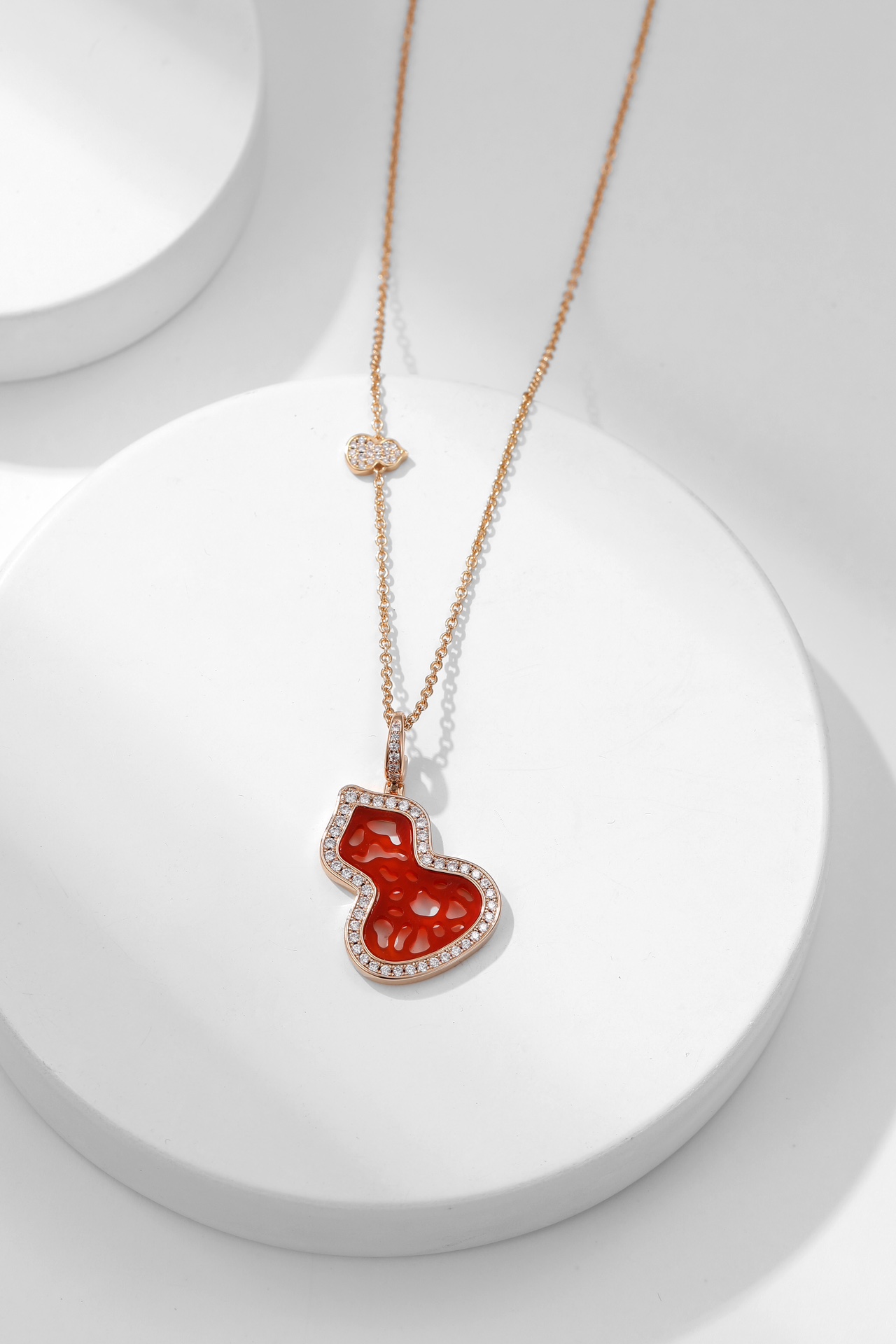 Qe*lin wulu红玛瑙蕾丝葫芦吊坠,中号尺寸:20*26mm,红玛瑙切割成不规则蕾丝形状镂空设计,灵感来自于敦煌石窟的中国艺术。搭配链长45cm,更佳合适日常佩戴。