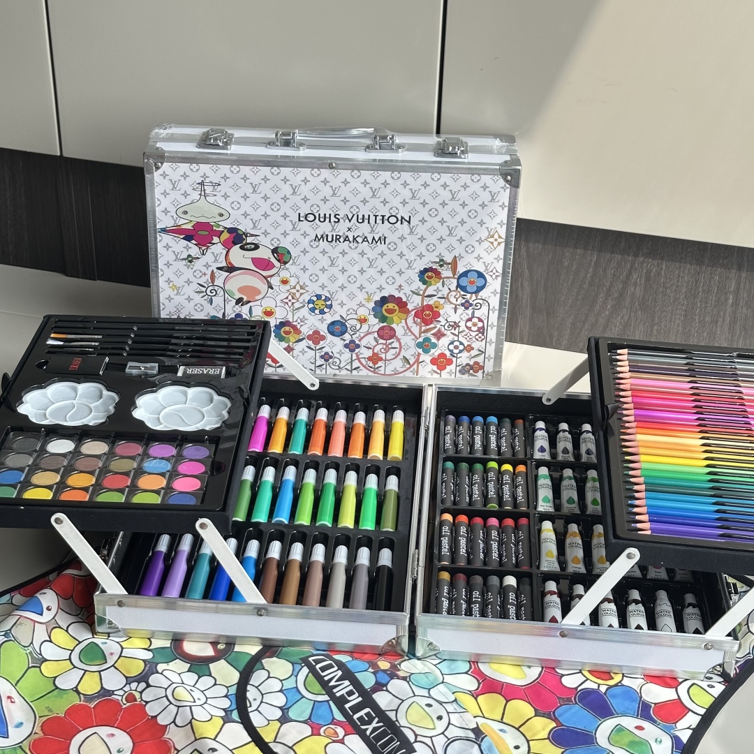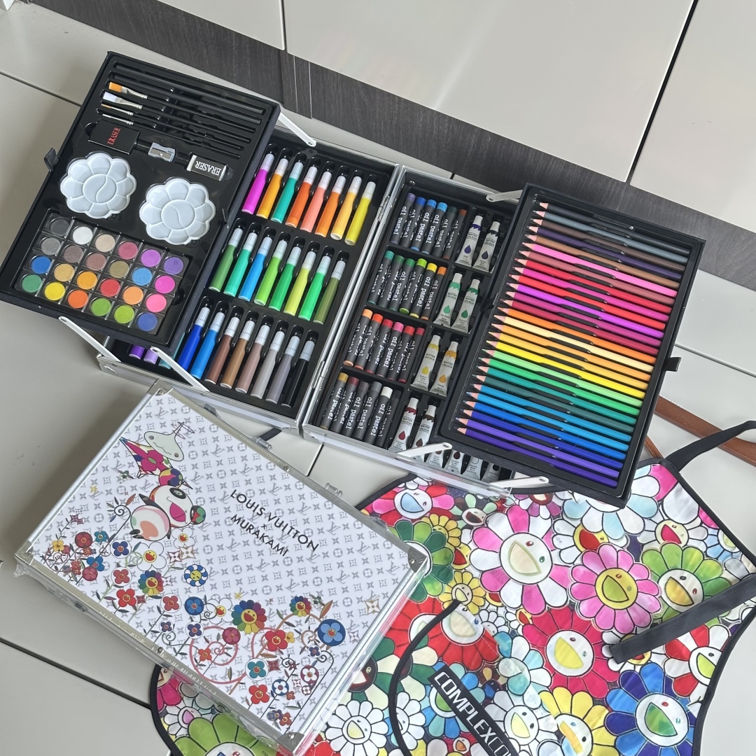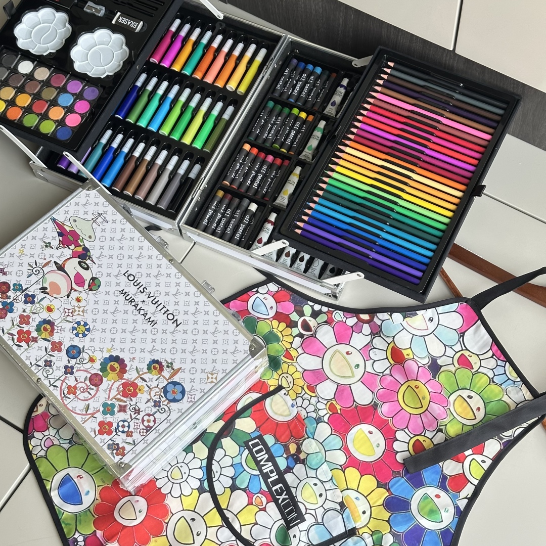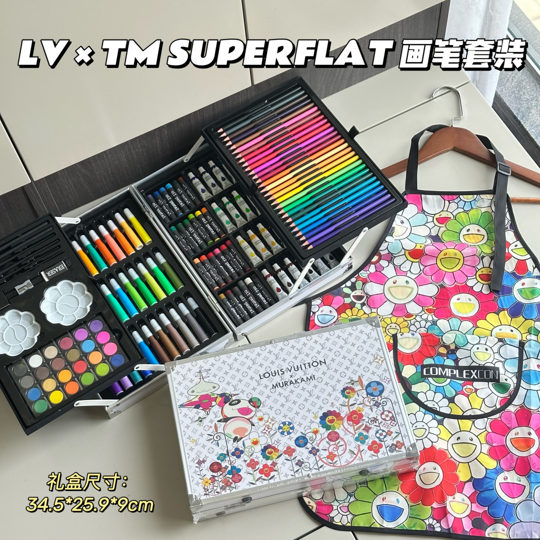 重磅推出六一限量好礼,LV x TM Superflat联名款画笔礼盒套装,路易威登与日本艺术家村上隆的经典之作,融合了村上隆标志性的“超扁平”艺术风格,将LV的经典Monogram图案与微笑的花卉元素巧妙结合,呈现出独特的视觉效果,缤纷的色彩与全幅MNG形成鲜明对比。高颜值的145件绘画套装,激发孩子创造力,释放涂鸦天性,颜值派+实力派,宝妈萌娃的喜爱,一套顶五套绘画大礼包,一站式买齐,满足孩子绘画需求,礼盒双层设计易于收纳,精选环保材料,权威质检,安全有保障,并且贴心为大家定制专属村上隆太阳花防水彩绘护衣儿童围裙,免除妈妈洗衣烦恼,怎么画都不怕,让孩子摆脱电子产品,开启益智亲子时光。 产品包含: 33色水彩笔➕28色彩铅➕24色油画棒➕24色水彩颜料➕24色固体水彩➕4支描笔➕2支绘画铅笔➕2个颜料调色盘➕2块橡皮擦➕1个卷笔刀➕1件防水儿童绘画围裙