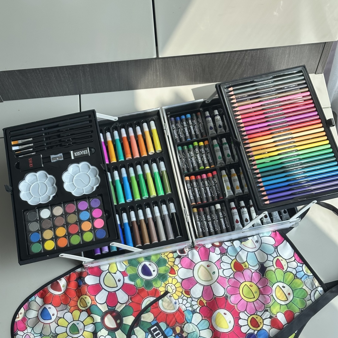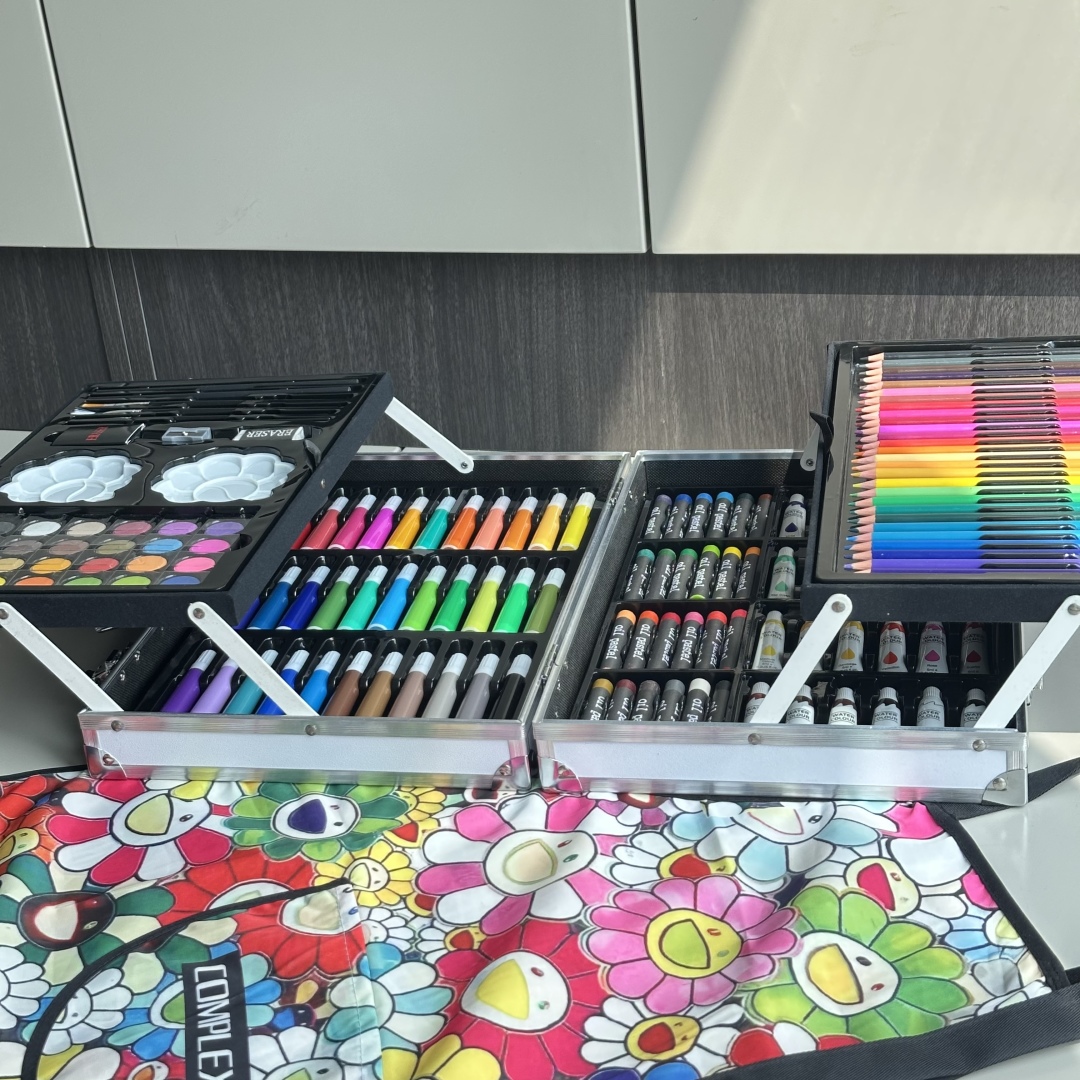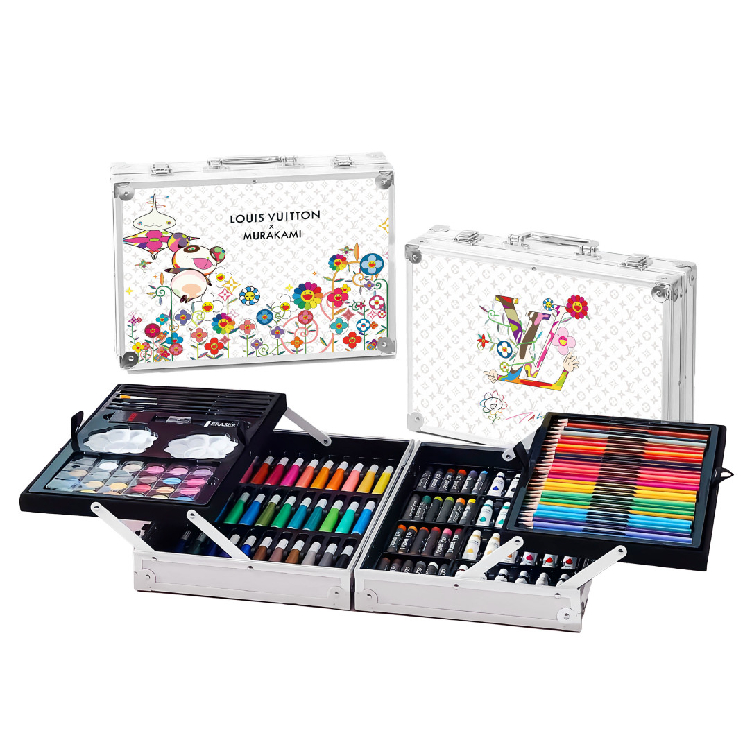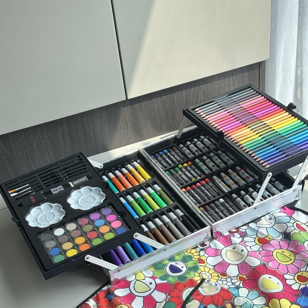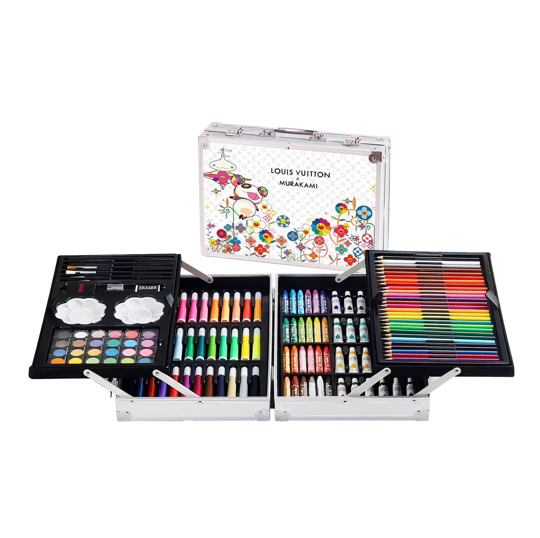 重磅推出六一限量好礼,LV x TM Superflat联名款画笔礼盒套装,路易威登与日本艺术家村上隆的经典之作,融合了村上隆标志性的“超扁平”艺术风格,将LV的经典Monogram图案与微笑的花卉元素巧妙结合,呈现出独特的视觉效果,缤纷的色彩与全幅MNG形成鲜明对比。高颜值的145件绘画套装,激发孩子创造力,释放涂鸦天性,颜值派+实力派,宝妈萌娃的喜爱,一套顶五套绘画大礼包,一站式买齐,满足孩子绘画需求,礼盒双层设计易于收纳,精选环保材料,权威质检,安全有保障,并且贴心为大家定制专属村上隆太阳花防水彩绘护衣儿童围裙,免除妈妈洗衣烦恼,怎么画都不怕,让孩子摆脱电子产品,开启益智亲子时光。 产品包含: 33色水彩笔➕28色彩铅➕24色油画棒➕24色水彩颜料➕24色固体水彩➕4支描笔➕2支绘画铅笔➕2个颜料调色盘➕2块橡皮擦➕1个卷笔刀➕1件防水儿童绘画围裙