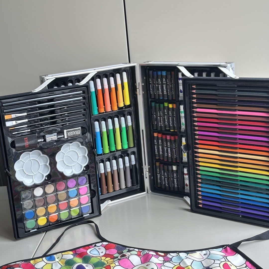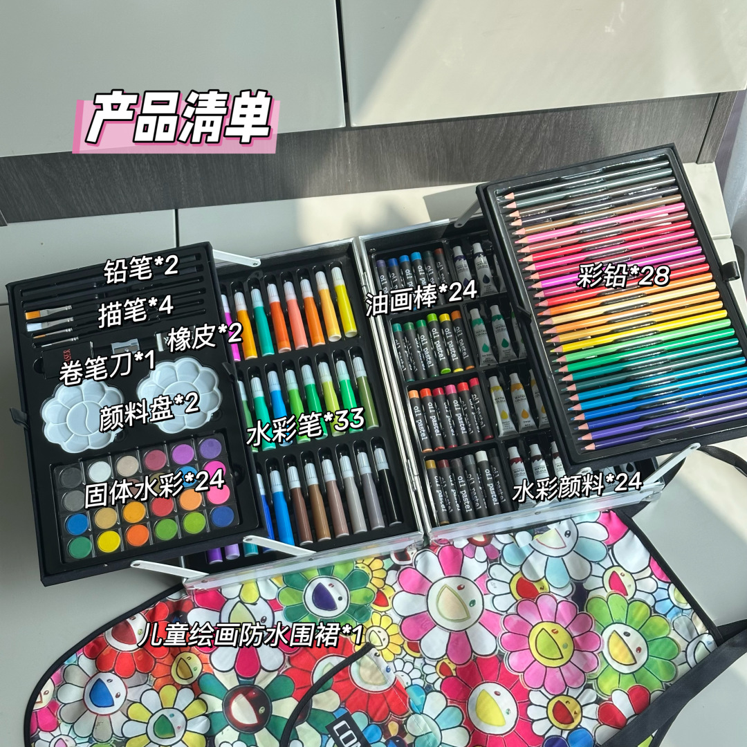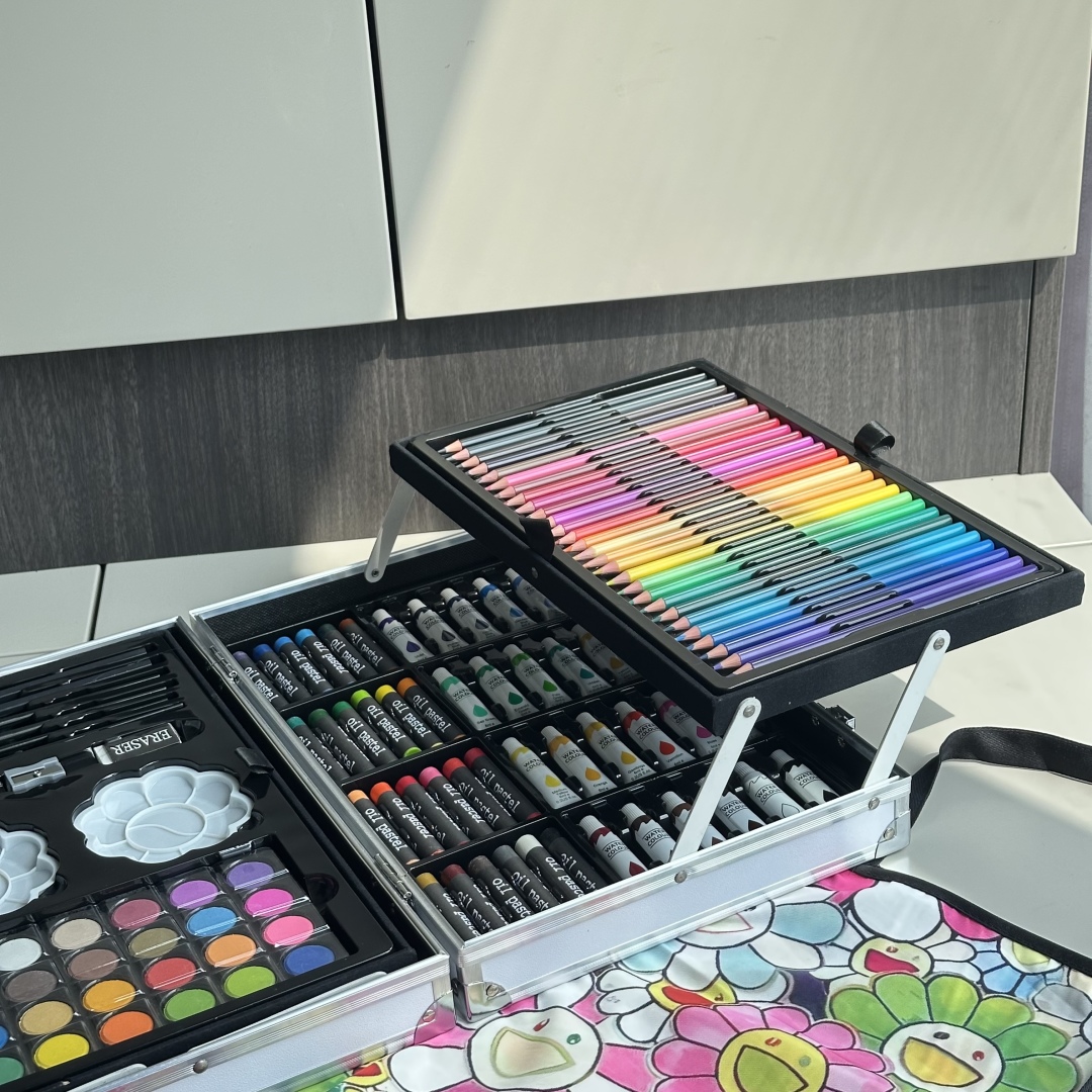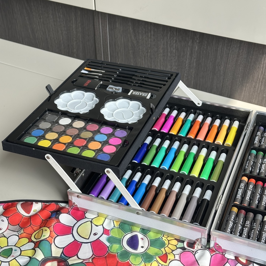 重磅推出六一限量好礼,LV x TM Superflat联名款画笔礼盒套装,路易威登与日本艺术家村上隆的经典之作,融合了村上隆标志性的“超扁平”艺术风格,将LV的经典Monogram图案与微笑的花卉元素巧妙结合,呈现出独特的视觉效果,缤纷的色彩与全幅MNG形成鲜明对比。高颜值的145件绘画套装,激发孩子创造力,释放涂鸦天性,颜值派+实力派,宝妈萌娃的喜爱,一套顶五套绘画大礼包,一站式买齐,满足孩子绘画需求,礼盒双层设计易于收纳,精选环保材料,权威质检,安全有保障,并且贴心为大家定制专属村上隆太阳花防水彩绘护衣儿童围裙,免除妈妈洗衣烦恼,怎么画都不怕,让孩子摆脱电子产品,开启益智亲子时光。 产品包含: 33色水彩笔➕28色彩铅➕24色油画棒➕24色水彩颜料➕24色固体水彩➕4支描笔➕2支绘画铅笔➕2个颜料调色盘➕2块橡皮擦➕1个卷笔刀➕1件防水儿童绘画围裙