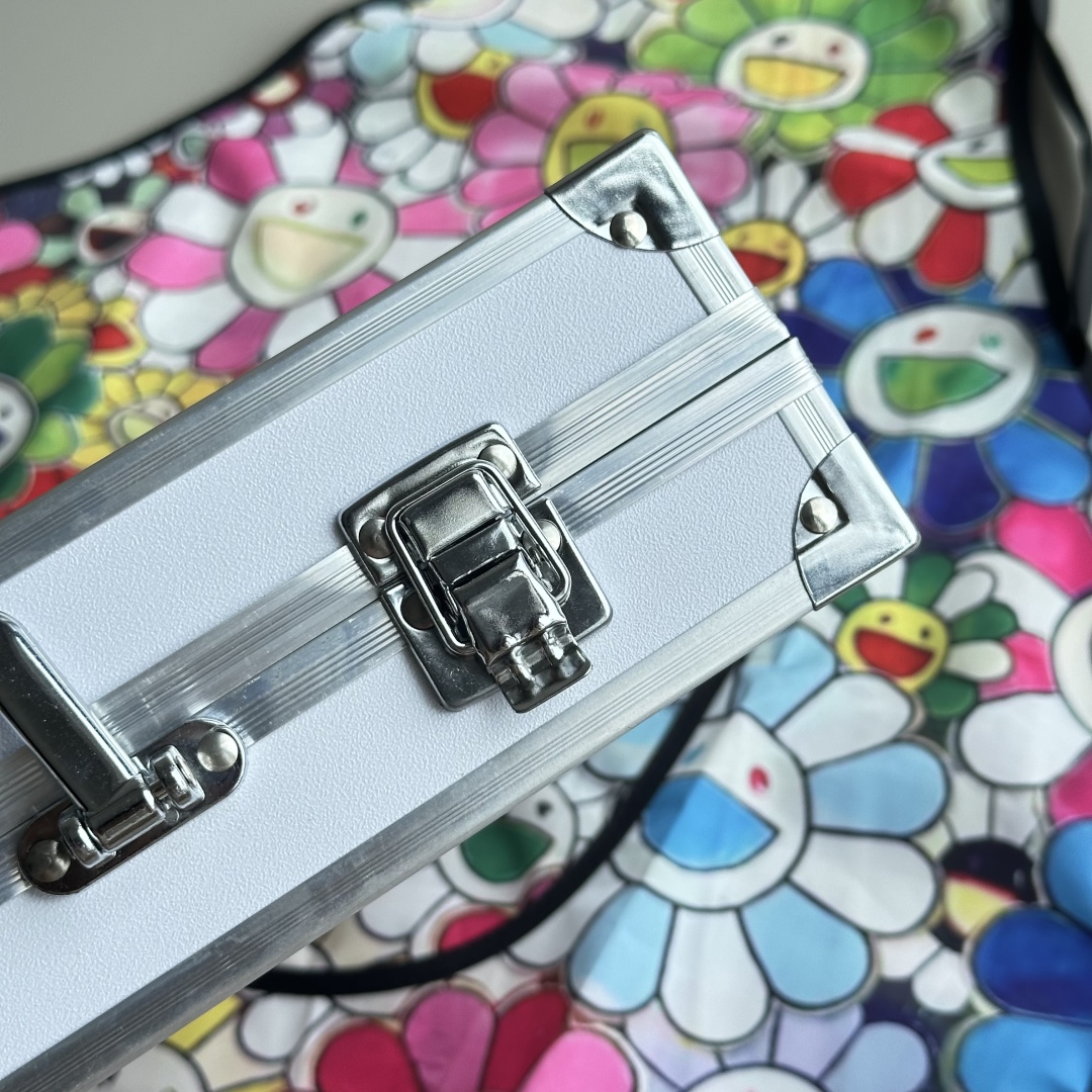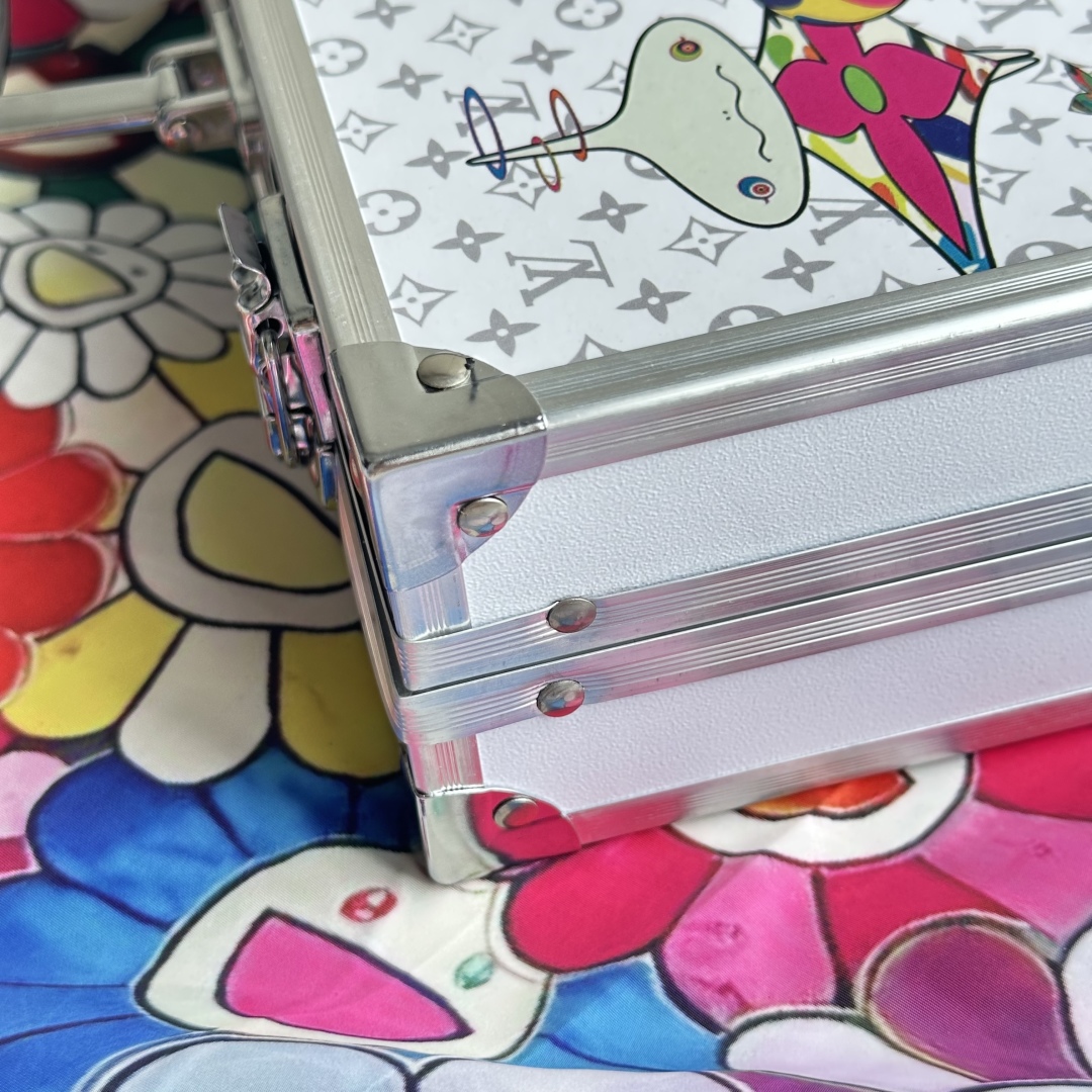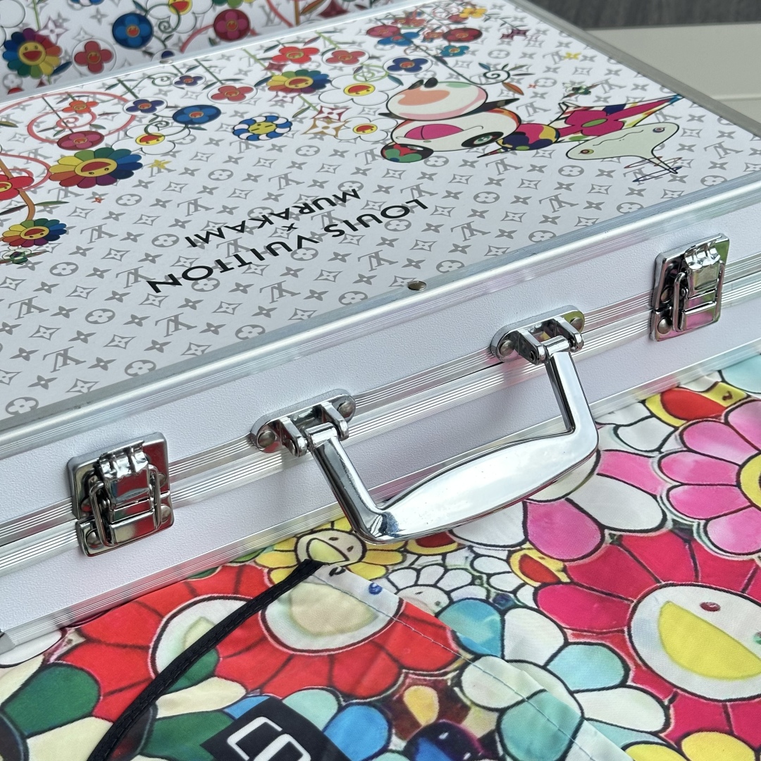 封面将LV的经典Monogram图案与村上隆的标志性卡通形象和太阳花等元素相结合,让经典图案焕发出新的活力,给人带来全新的视觉感受,浅灰色LV暗纹印花加彩色的太阳花手绘,礼盒全铝合金框架,更加结实耐用,镀铬手提,边缘圆滑不割手,卡扣设计,紧实固定,避免礼盒突然打开,双层大容量收纳,告别凌乱。 礼盒尺寸: 34.5*25.9*9cm