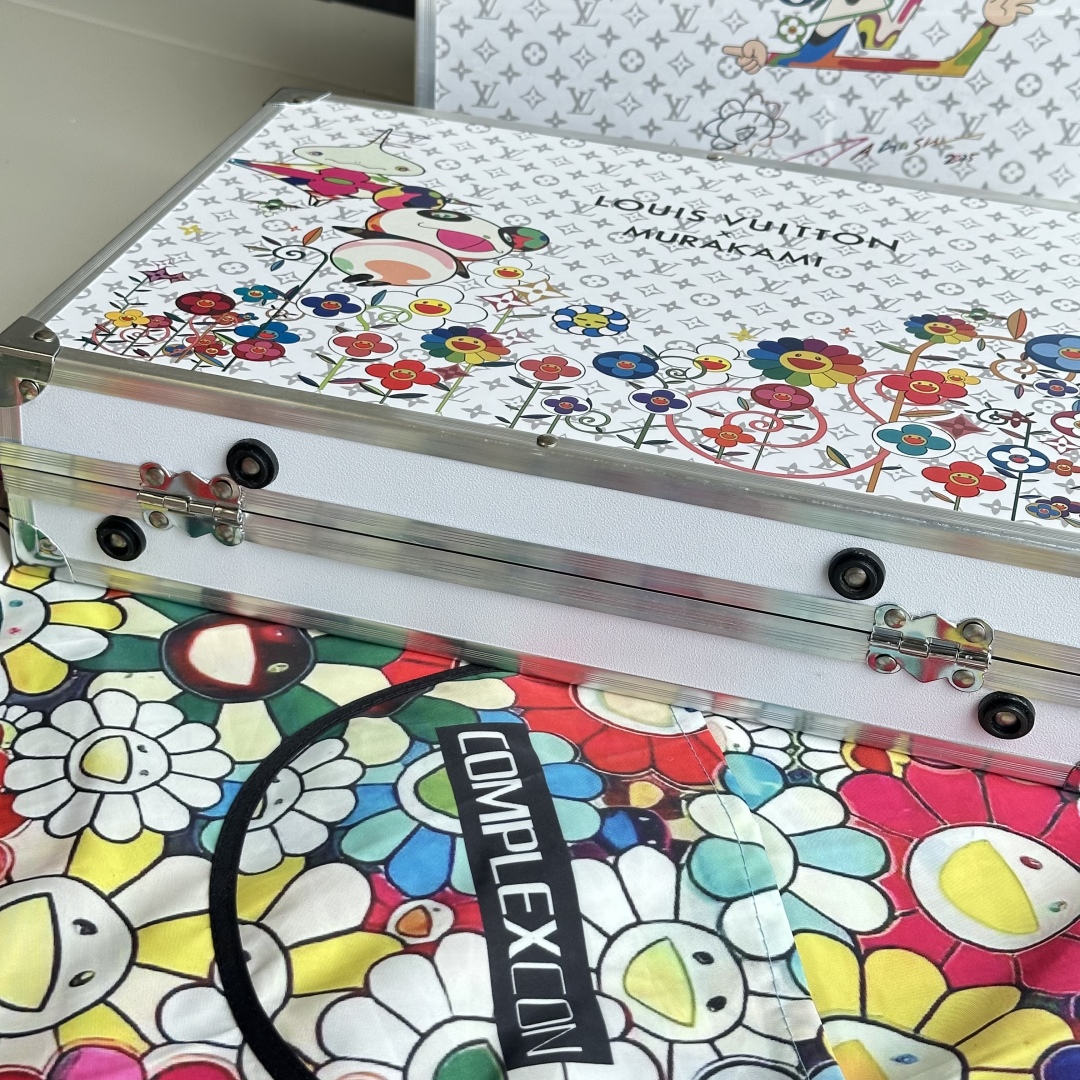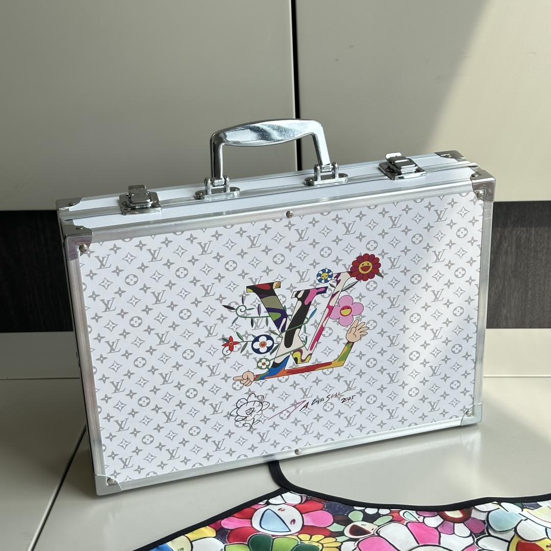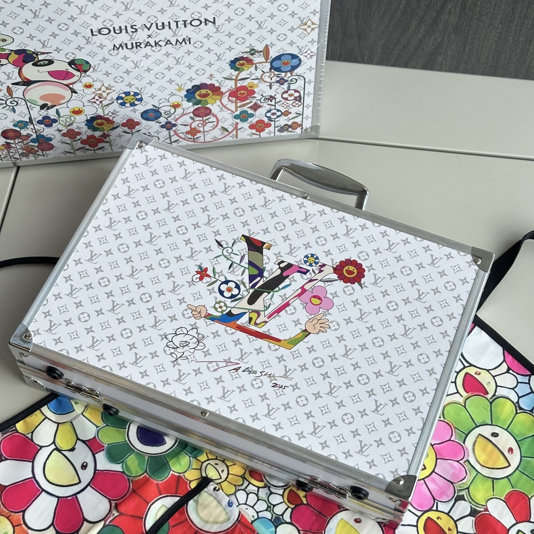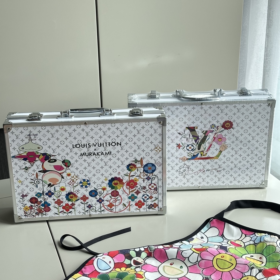 封面将LV的经典Monogram图案与村上隆的标志性卡通形象和太阳花等元素相结合,让经典图案焕发出新的活力,给人带来全新的视觉感受,浅灰色LV暗纹印花加彩色的太阳花手绘,礼盒全铝合金框架,更加结实耐用,镀铬手提,边缘圆滑不割手,卡扣设计,紧实固定,避免礼盒突然打开,双层大容量收纳,告别凌乱。 礼盒尺寸: 34.5*25.9*9cm