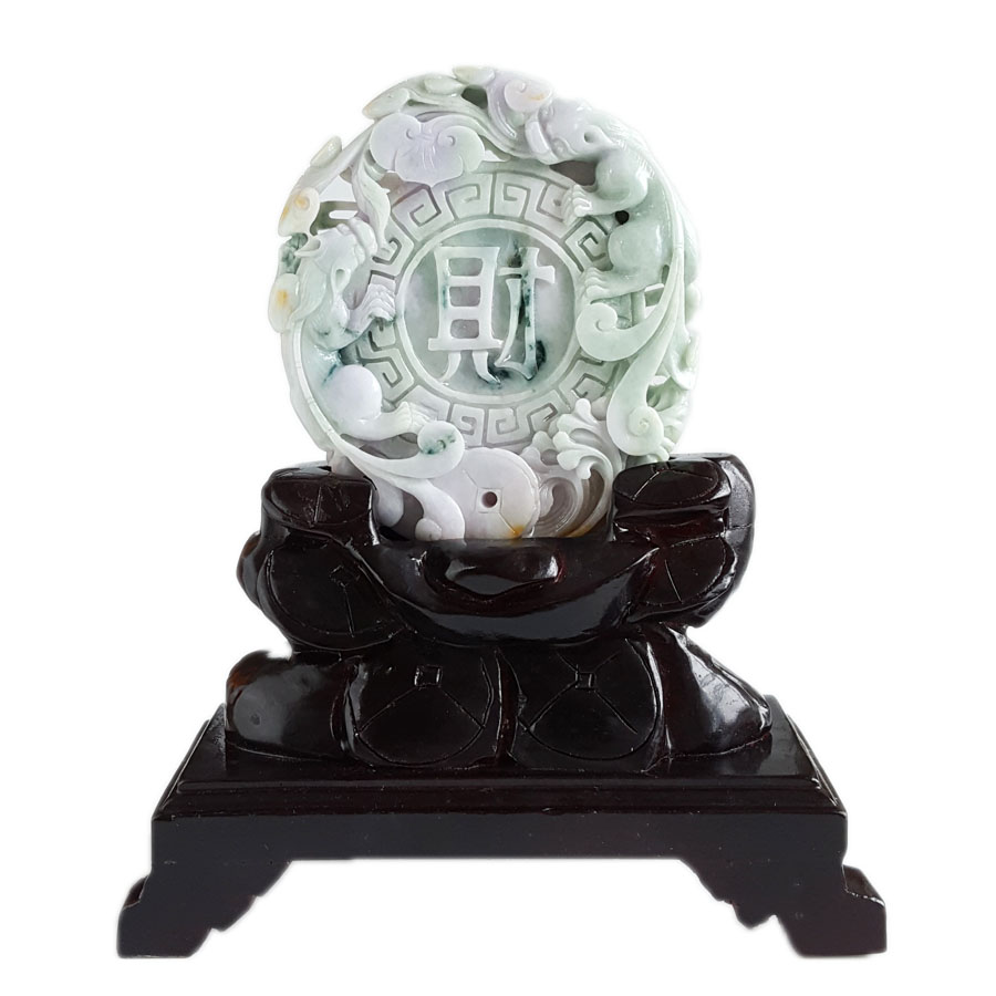 名称 | 天然细腻豆种福禄寿八方来财翡翠配木架摆件 |