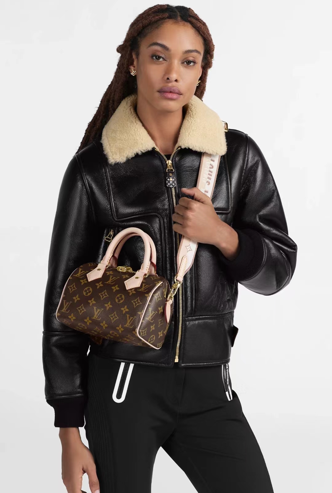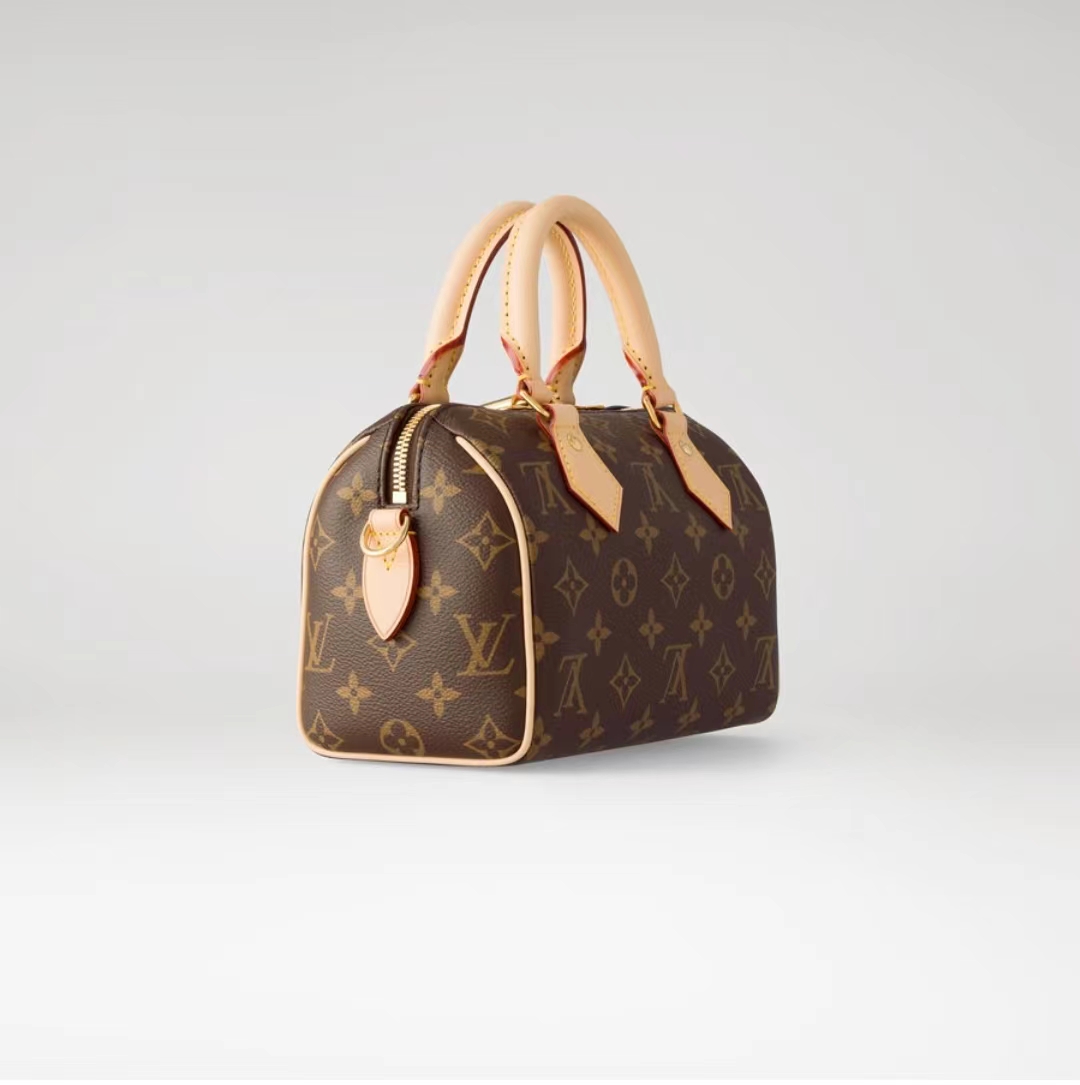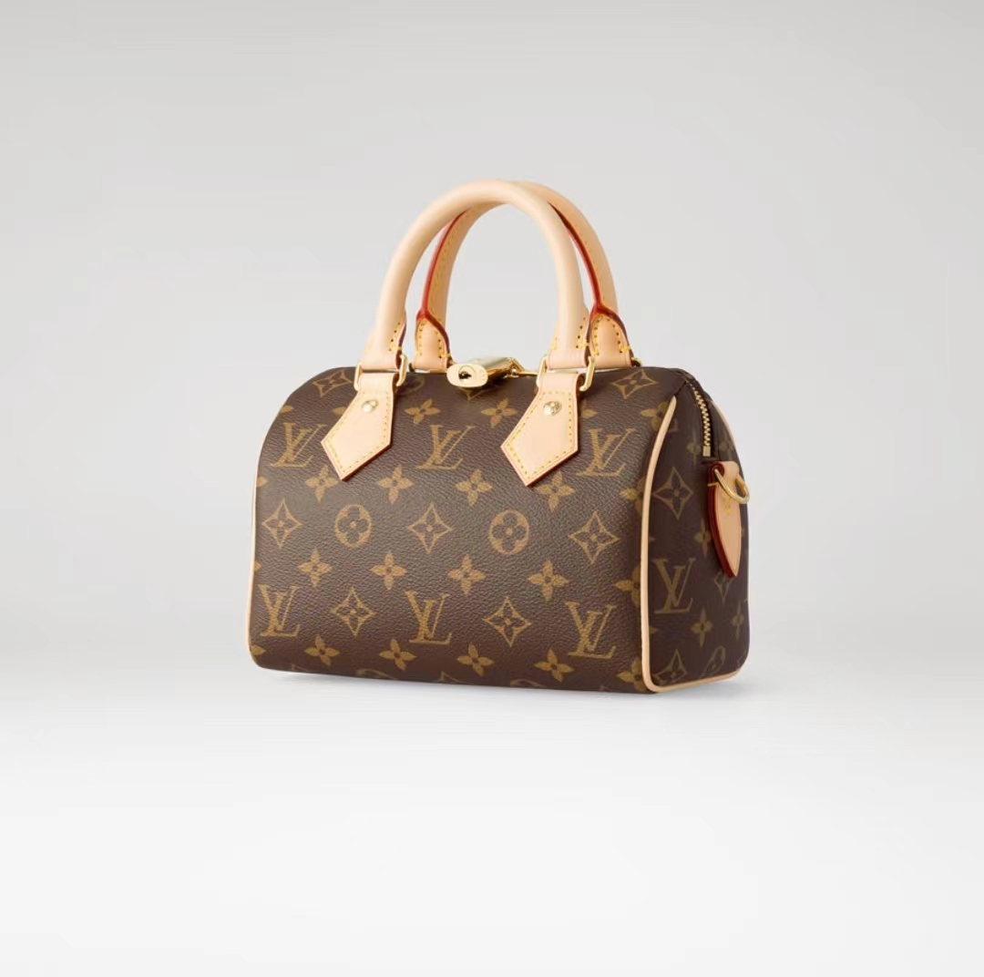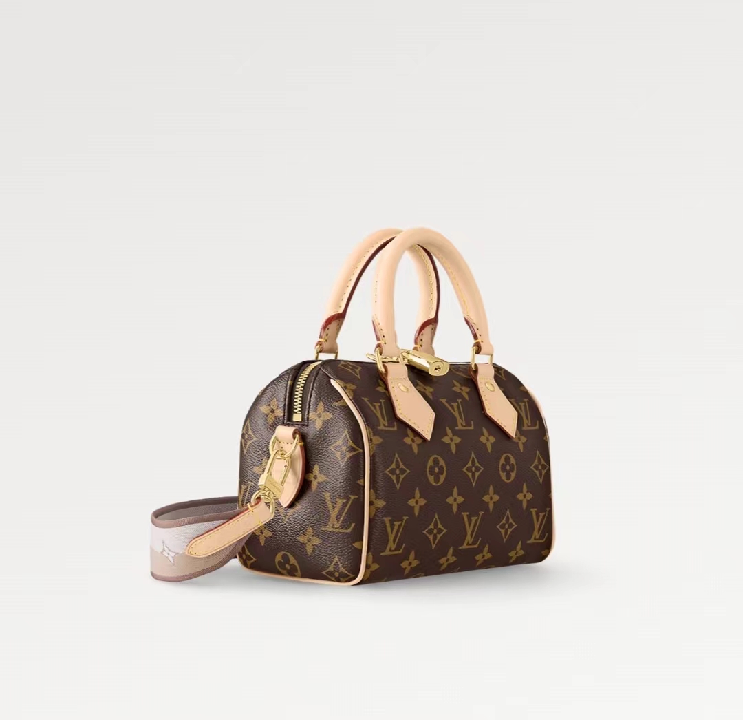 本款 Speedy Bandoulière 20 手袋的灵感源自路易威登经典旅行袋,采用 Monogram 帆布和牛皮革饰边,搭配轧制皮革手柄和挂锁。品牌标识点缀可拆卸肩带,肩背斜挎随心切换。