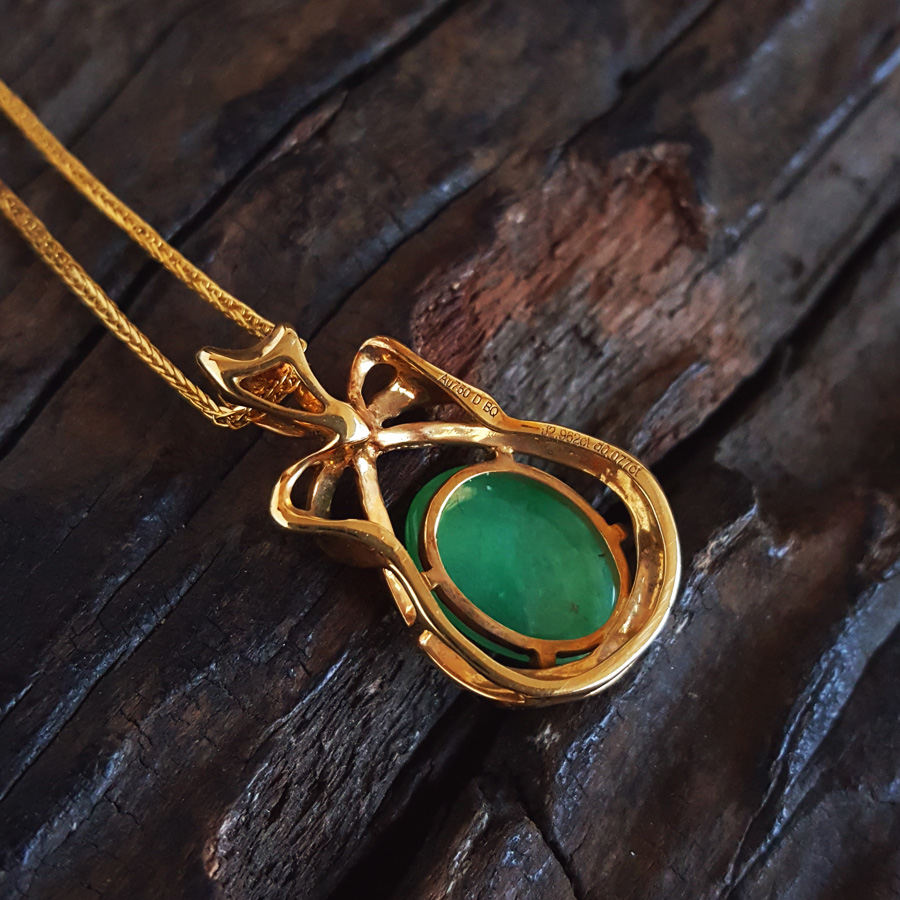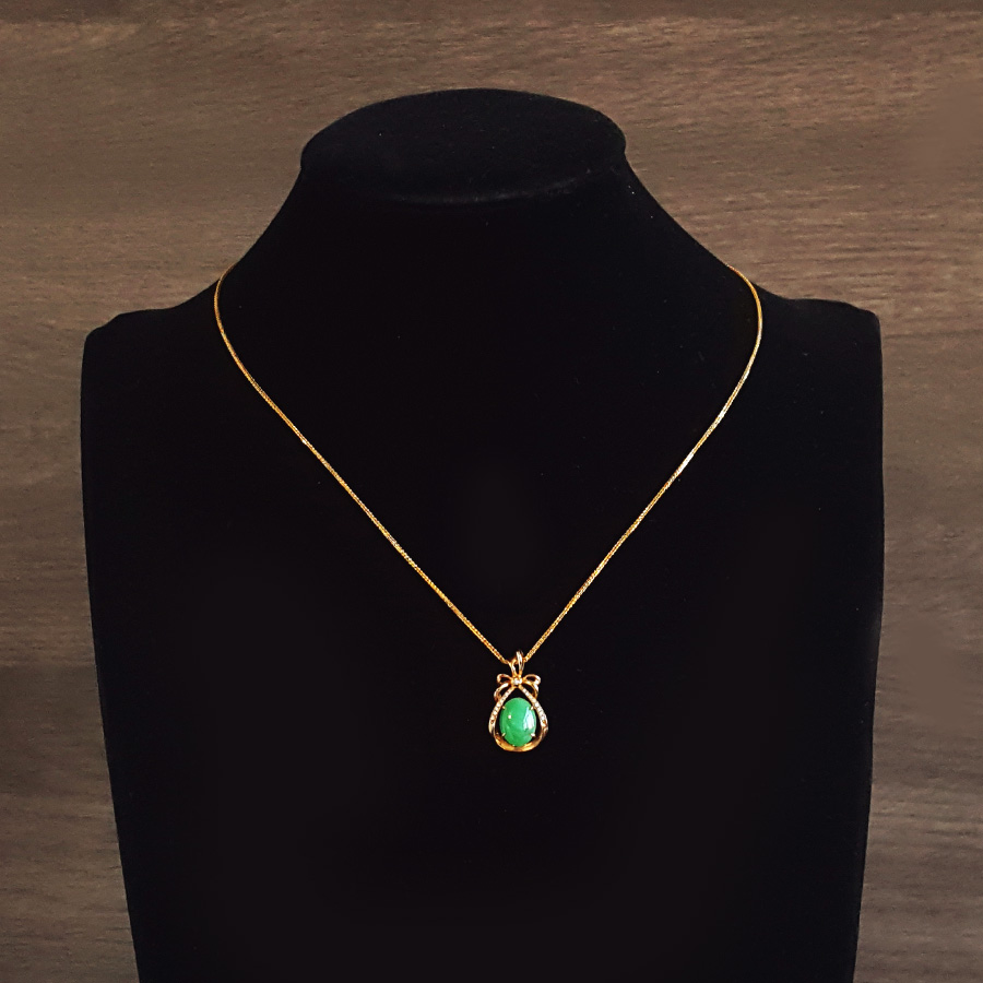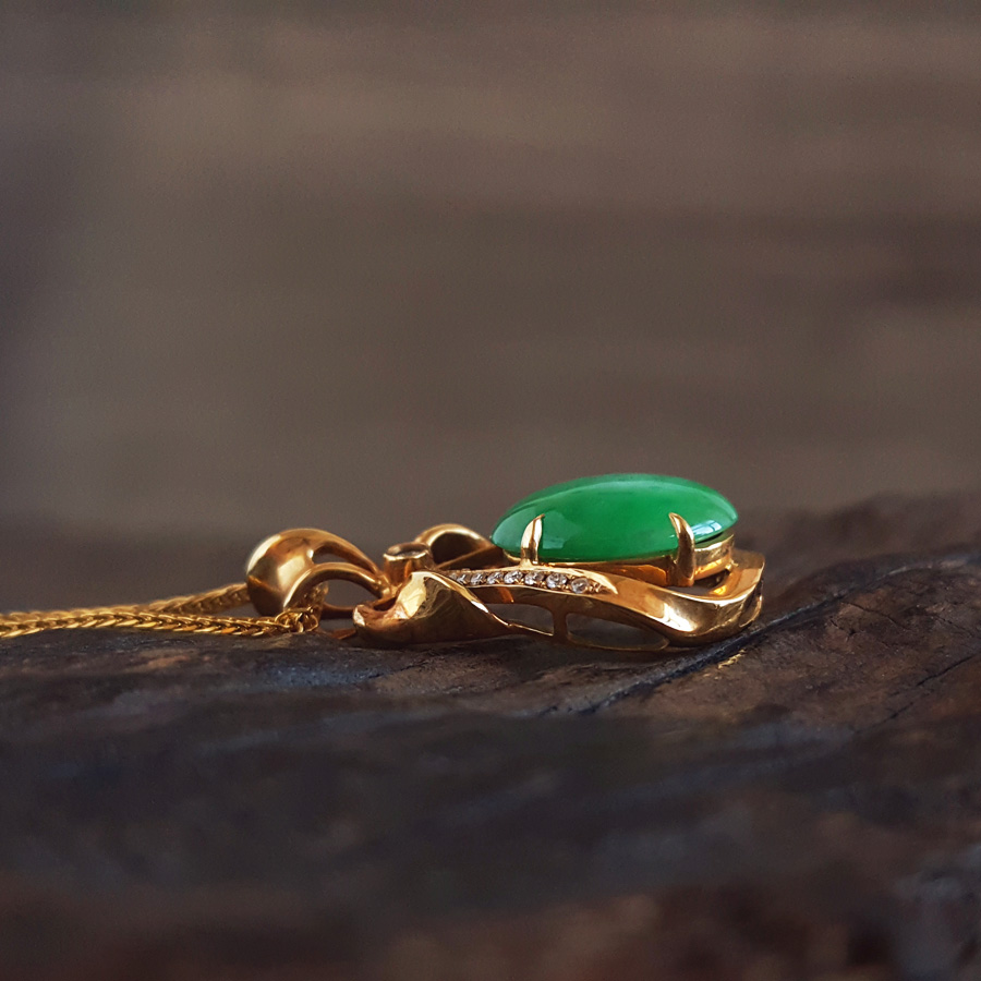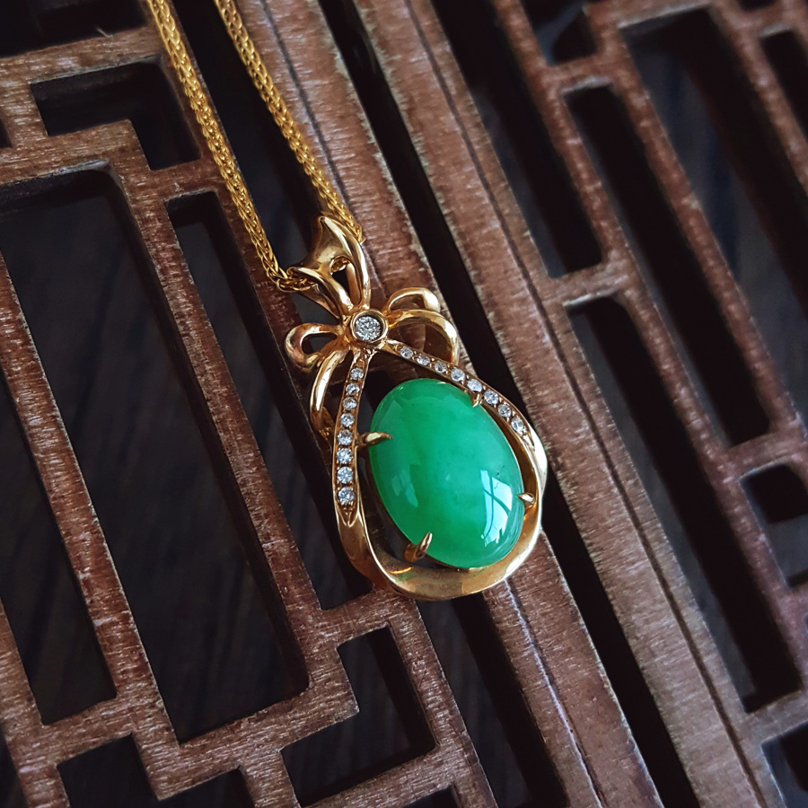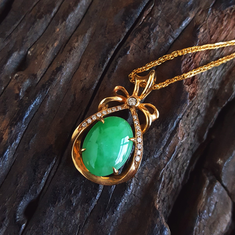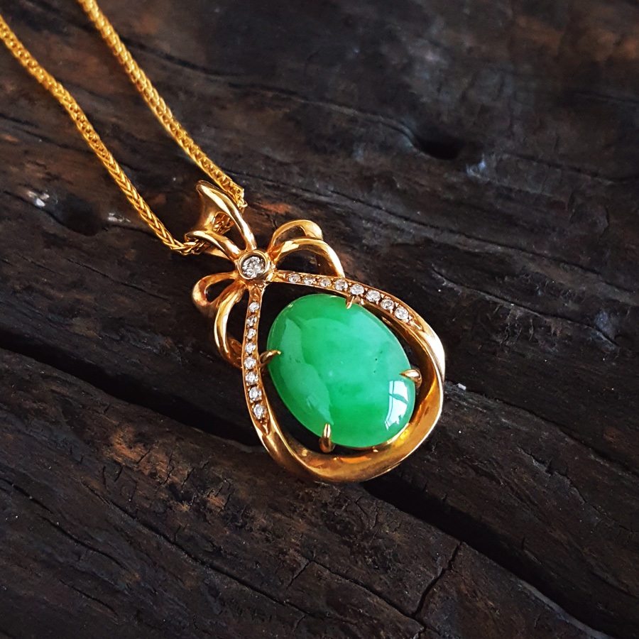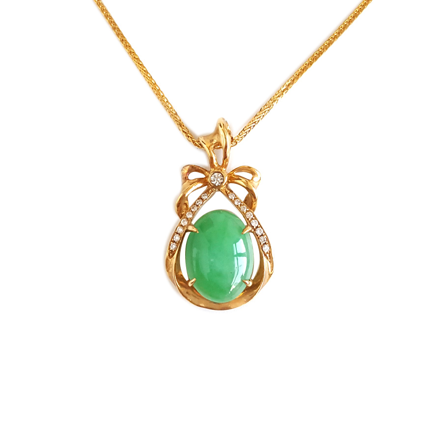 名称 | 宝庆AU750黄金镶钻镶天然糯种绿色蛋面翡翠吊坠项链 |