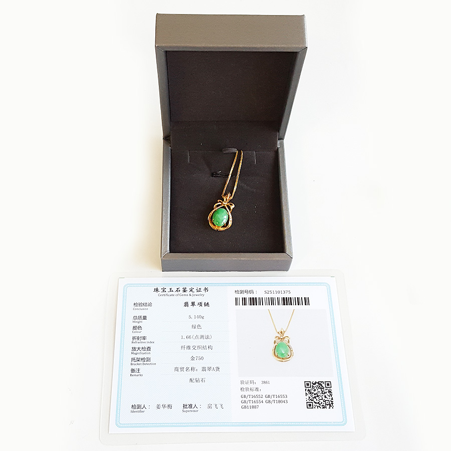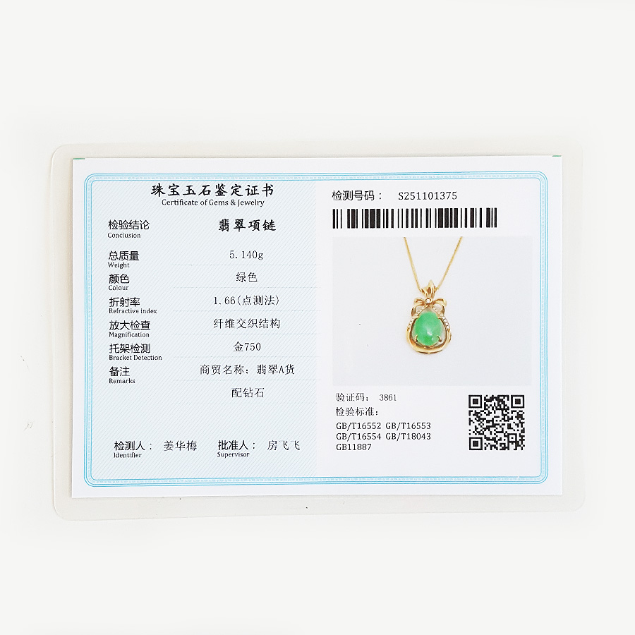 【天然正品】A货翡翠宝庆AU750黄金镶钻镶天然糯种绿色蛋面翡翠吊坠项链吊坠:25.0*14.1*6.7MM / 项链:44CM女士 301125NJS22
