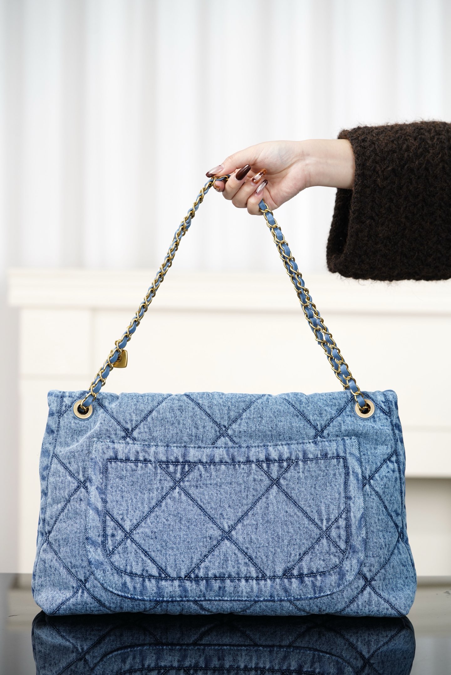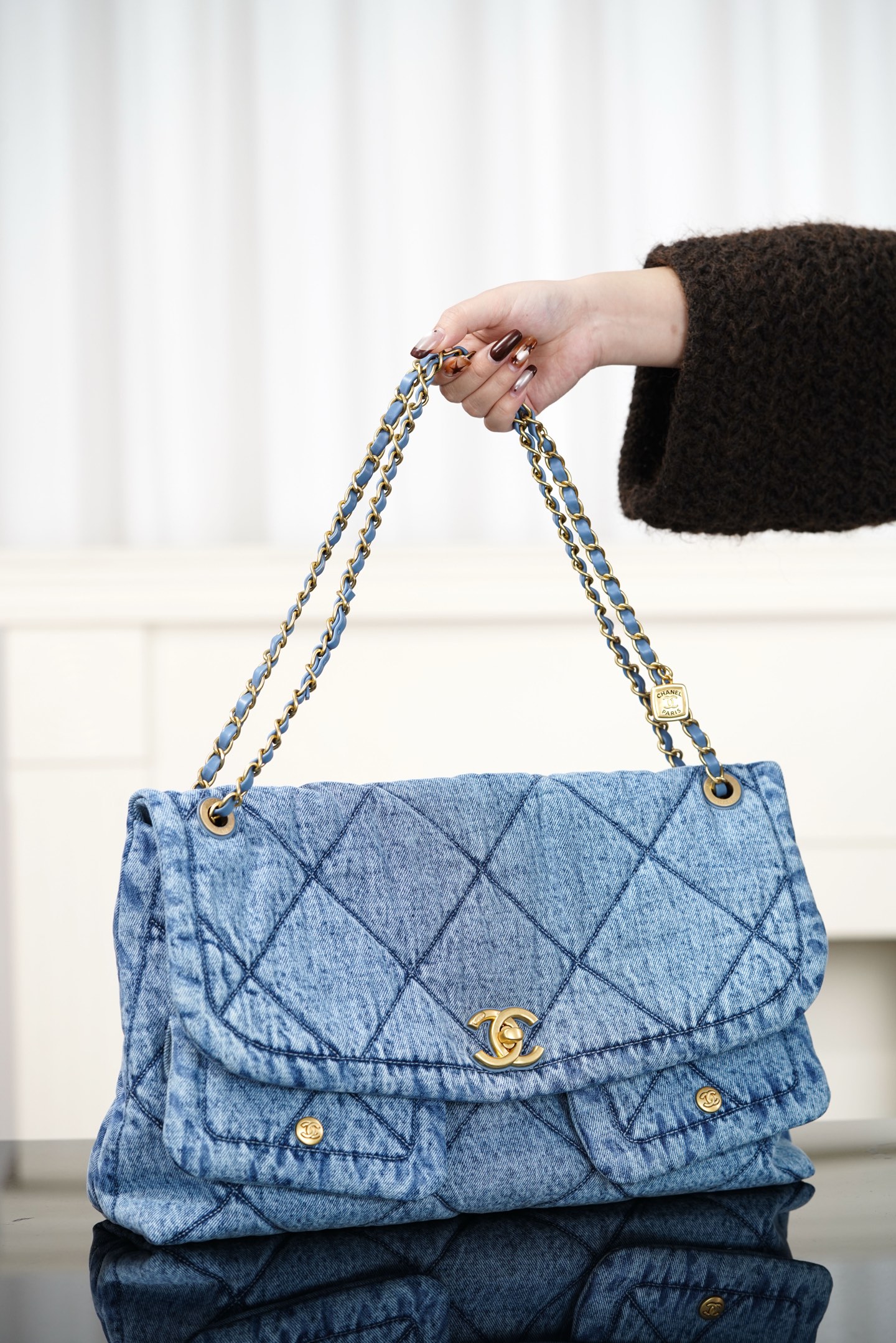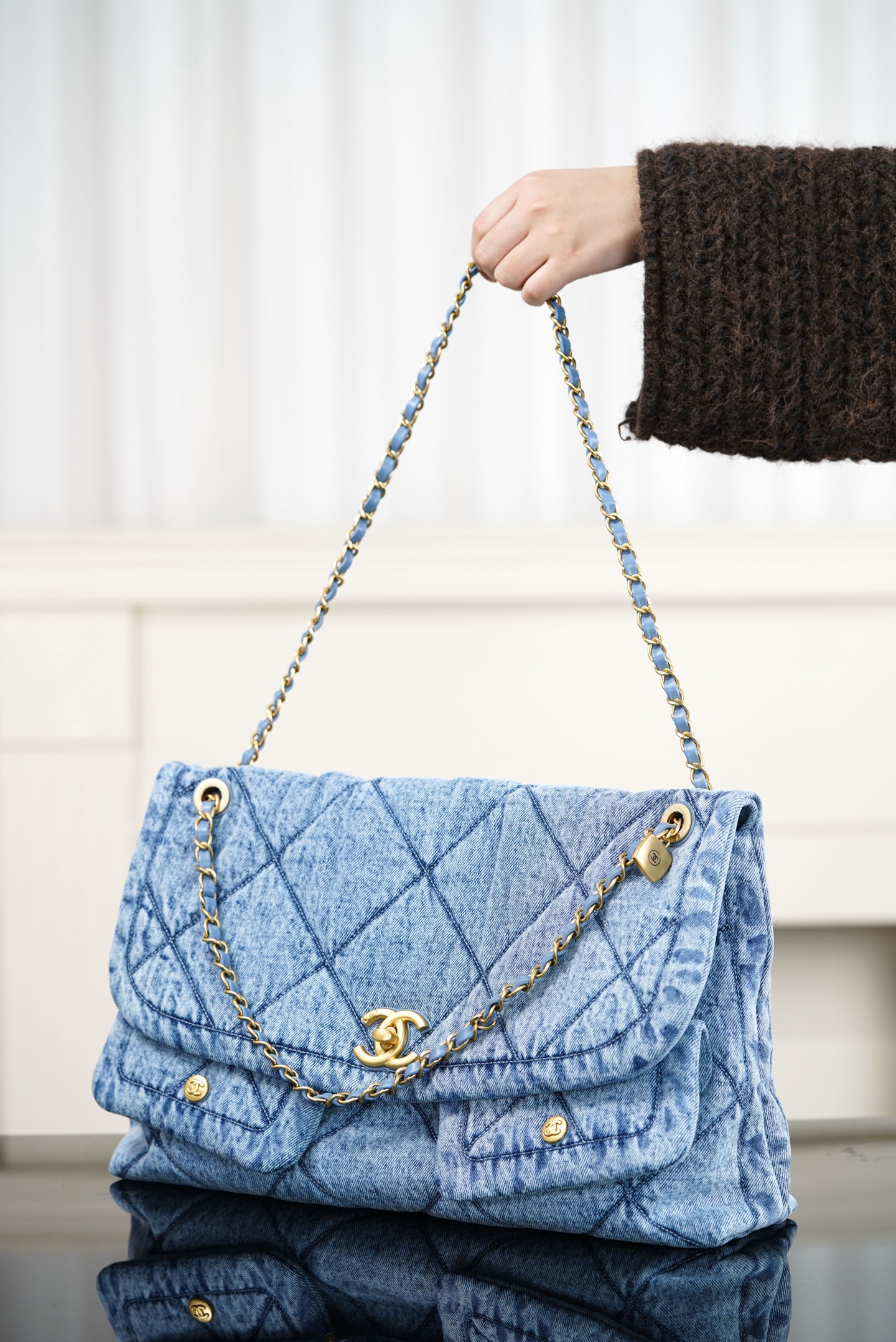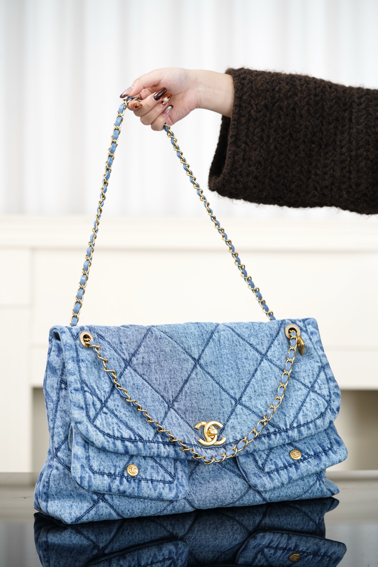 𝐂𝐡𝐚𝐧𝐞𝐥 𝟐𝟓𝐤 双口袋牛仔hobo 浅蓝 大号 经典大菱格,翻盖式包盖➕双口袋设计🔥 超大容量!秋冬就是要买大包👜 复古感、松弛感十足的水洗浅蓝色牛仔✨ 调性十足! 那串标志性的链条⛓️上,“双𝐂小挂坠”增添不少灵动感✨ 前后口袋隔层 容量感人✔️ 多种背法 上身优雅迷人!男女通背‼️ 尺寸:27x45x10cm