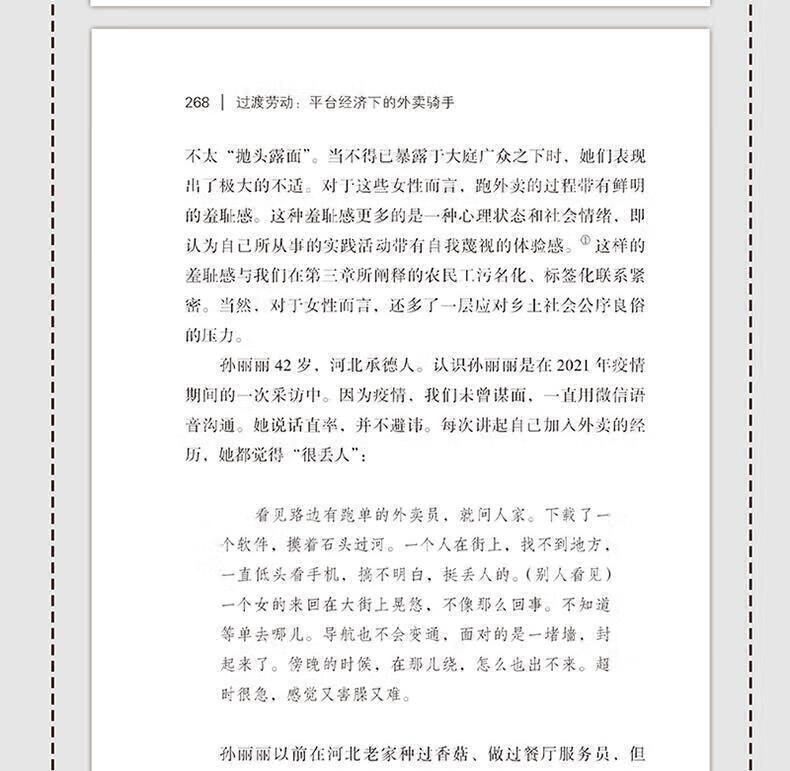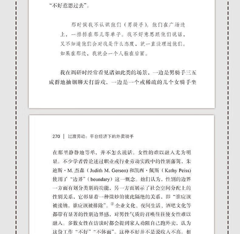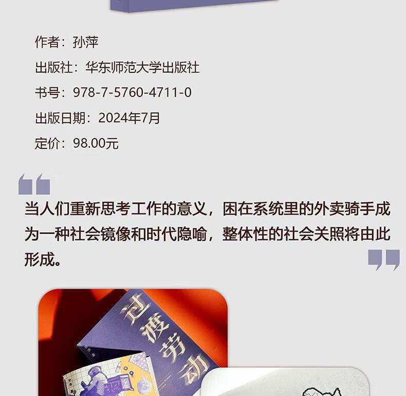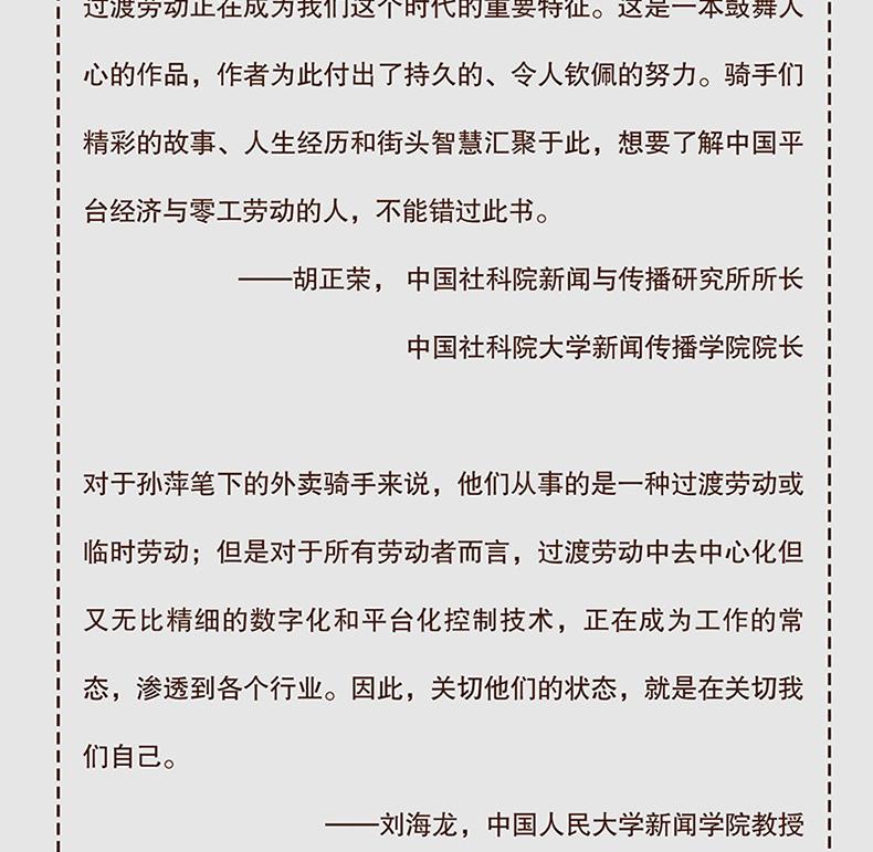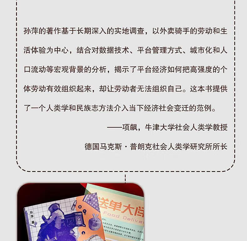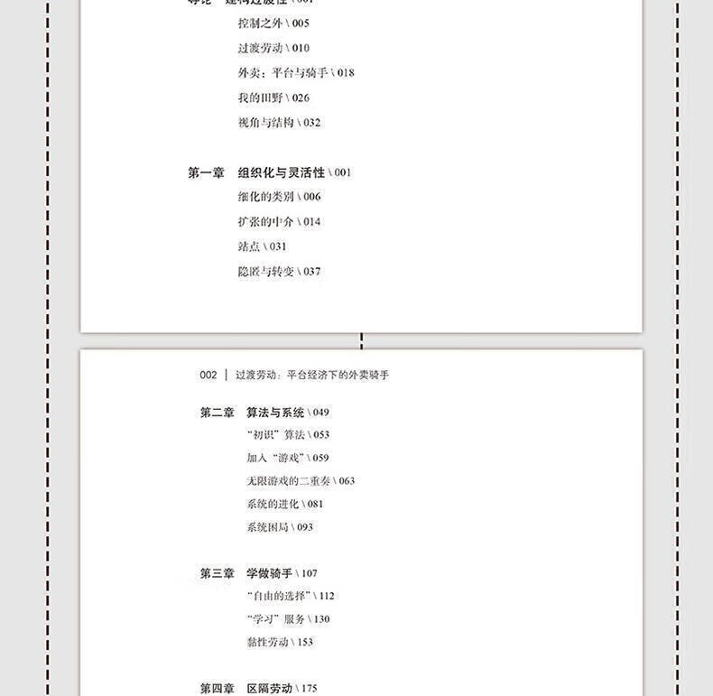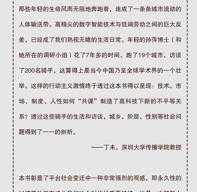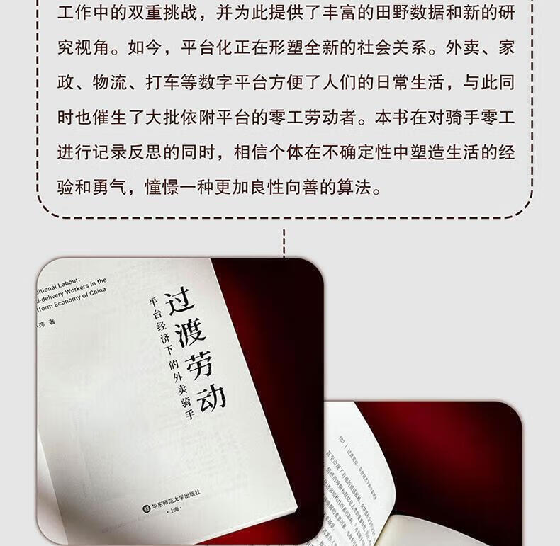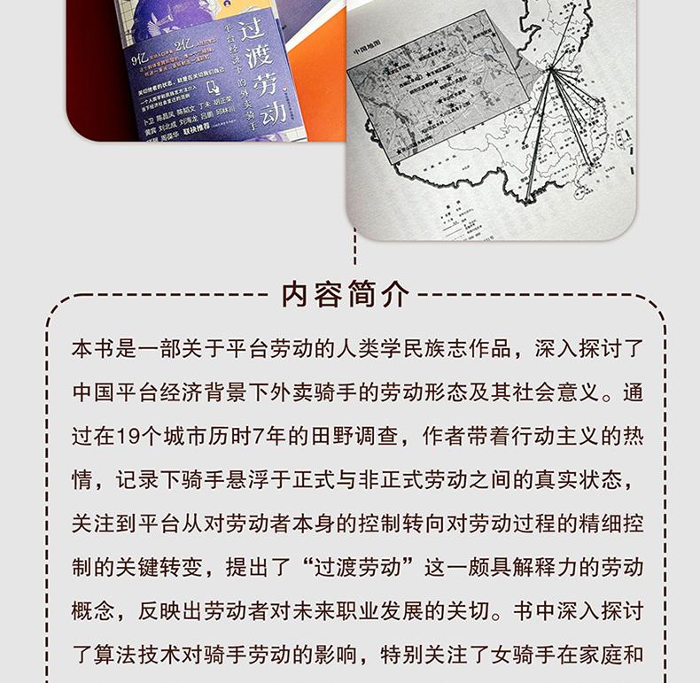 本书是一部关于平台劳动的人类学民族志作品,深入探讨了中国平台经济背景下外卖骑手的劳动形态及其社会意义。通过在19个城市历时7年的田野调查,作者带着行动主义的热情,记录下骑手悬浮于正式与非正式劳动之间的真实状态,关注到平台从对劳动者本身的控制转向对劳动过程的精细控制的关键转变,提出了“过渡劳动”这一颇具解释力的劳动概念,反映出劳动者对未来职业发展的关切。书中深入探讨了算法技术对骑手劳动的影响,特别关注了女骑手在家庭和工作中的双重挑战,并为此提供了丰富的田野数据和新的研究视角。