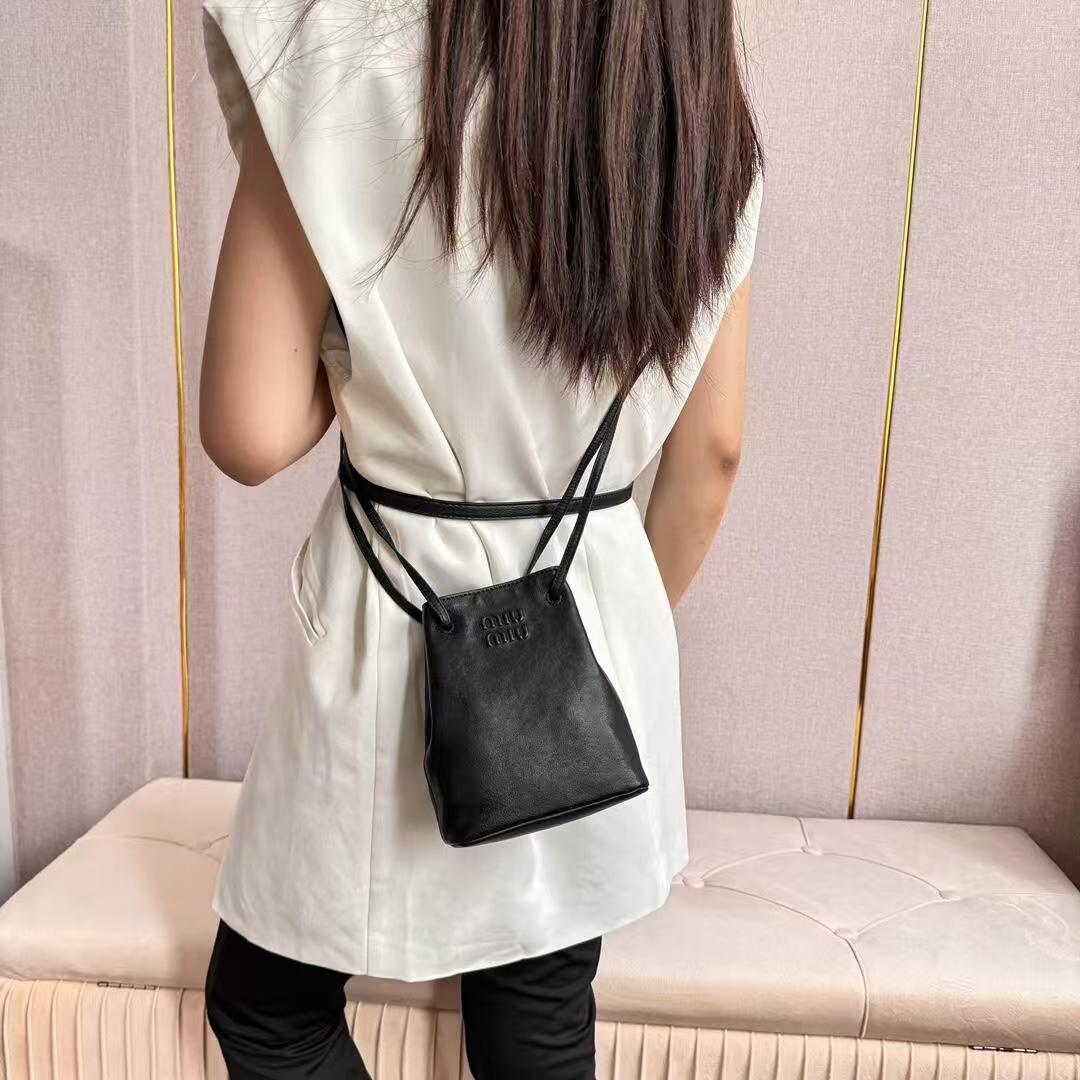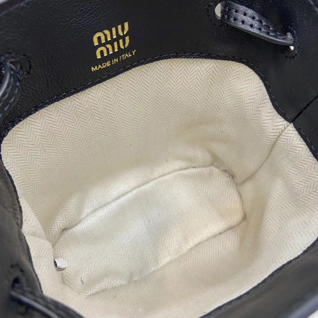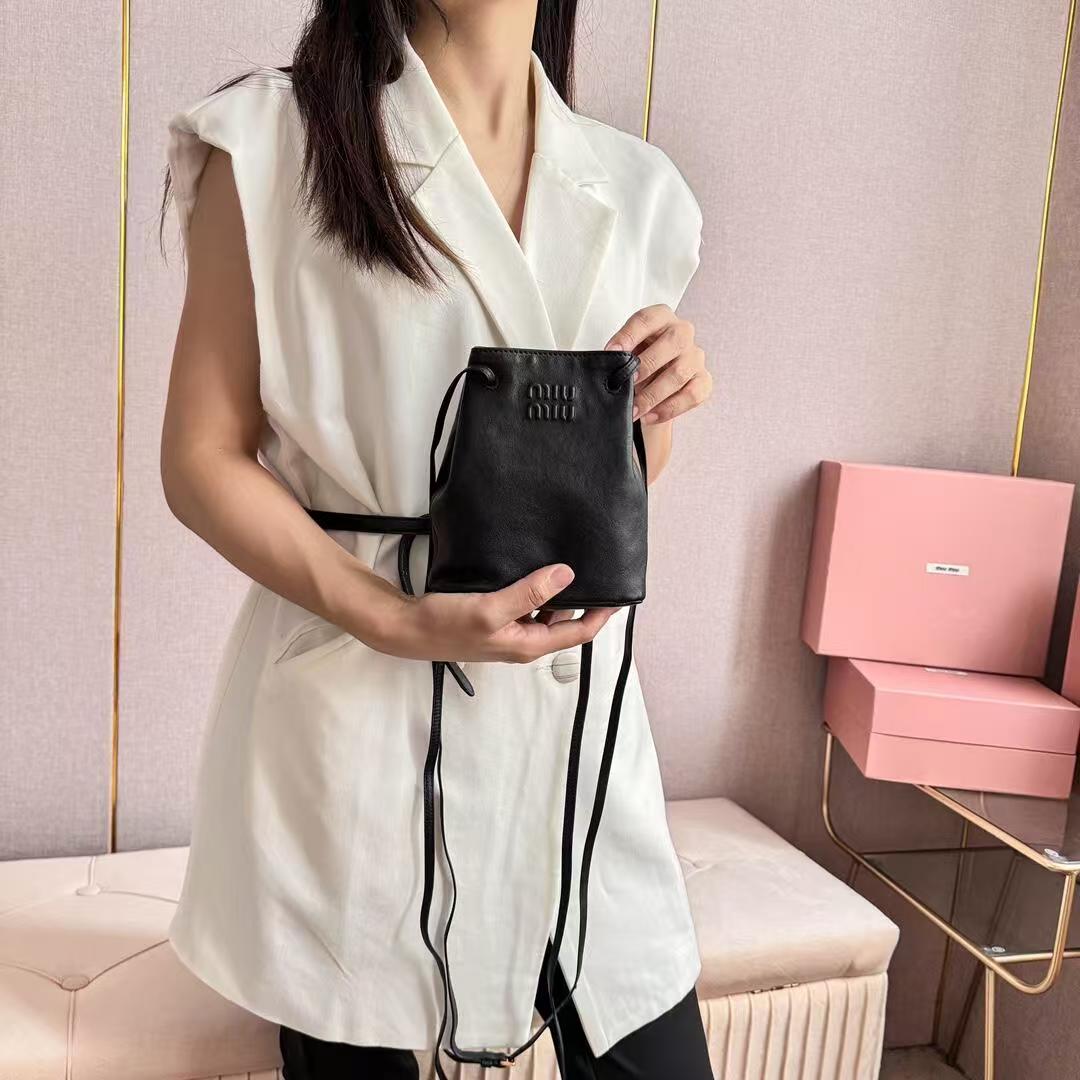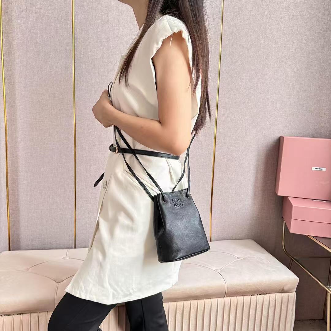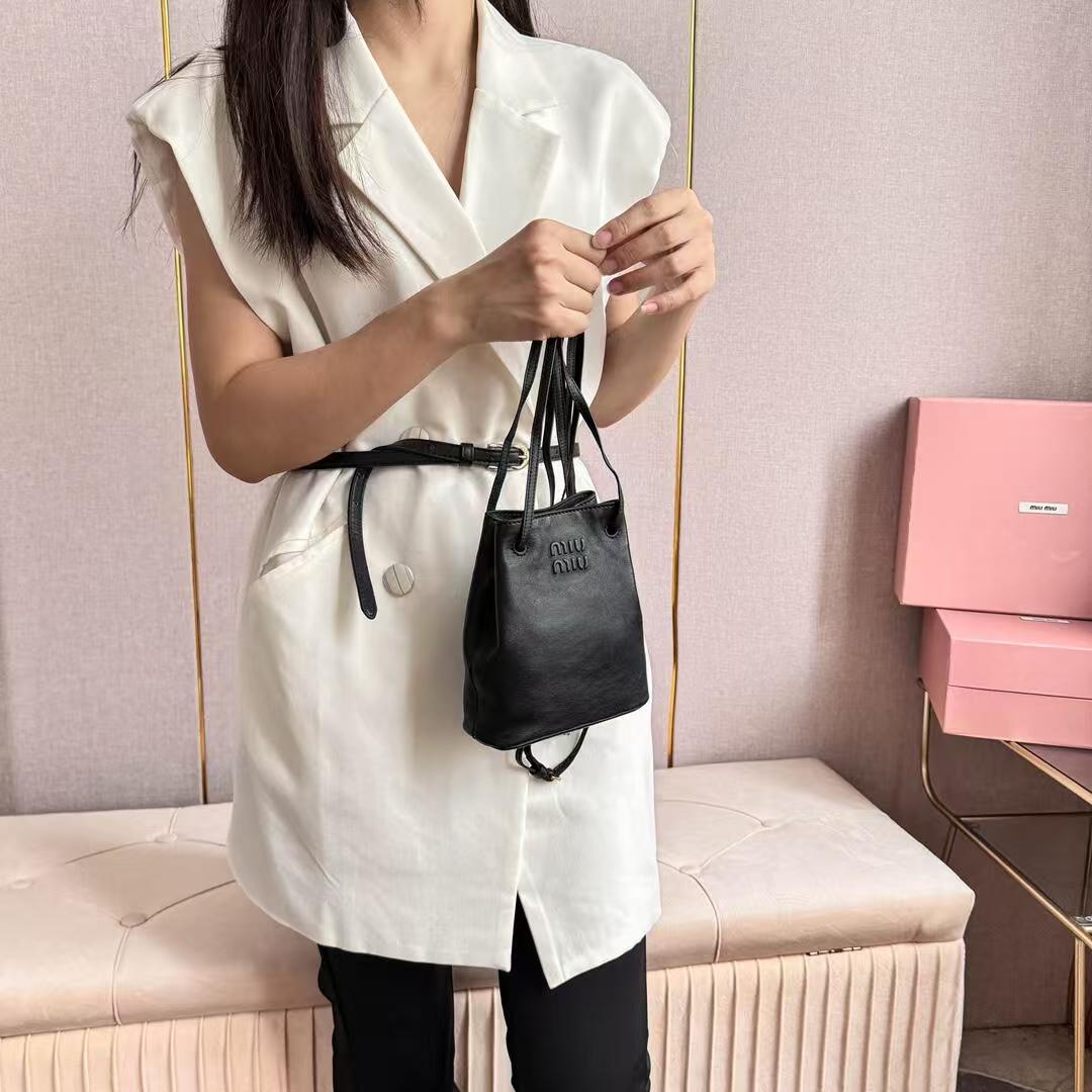 MIU MIU缪缪 nappa 压纹字母徽标可调节肩带 皮革 手袋小水桶福袋单肩斜挎包 迷你 女款 黑色